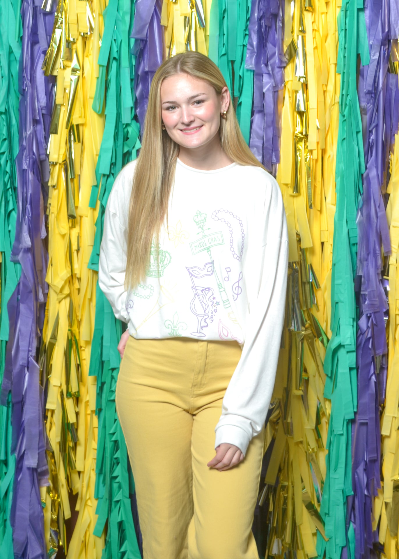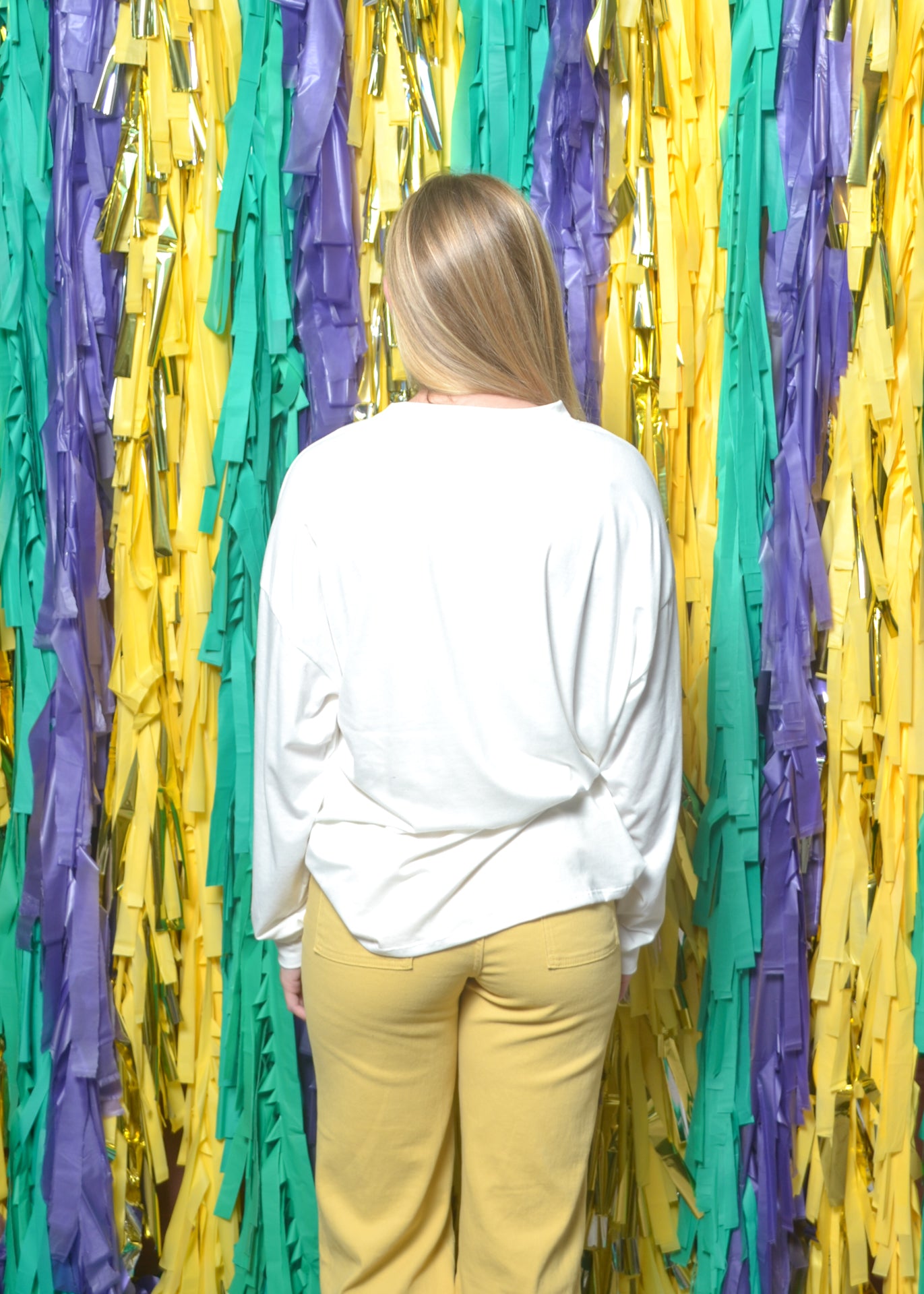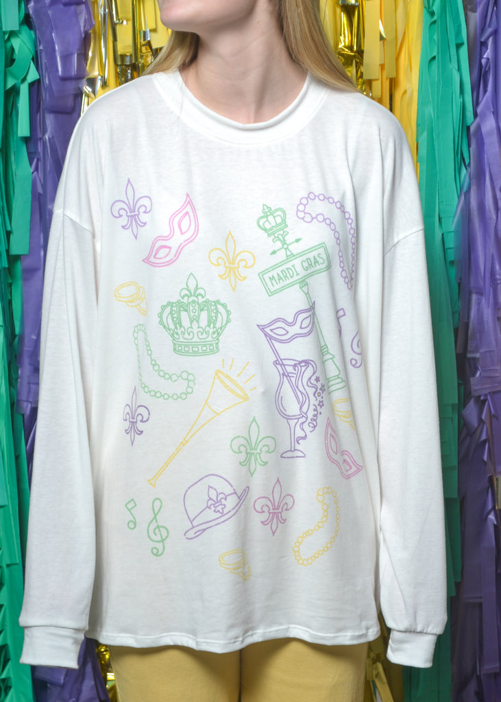 Show off every symbol of the season! This relaxed long sleeve top is covered in pastel Mardi Gras icons—masks, crowns, beads, and fleur-de-lis—bringing a playful touch to your festive wardrobe.