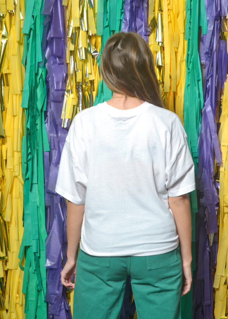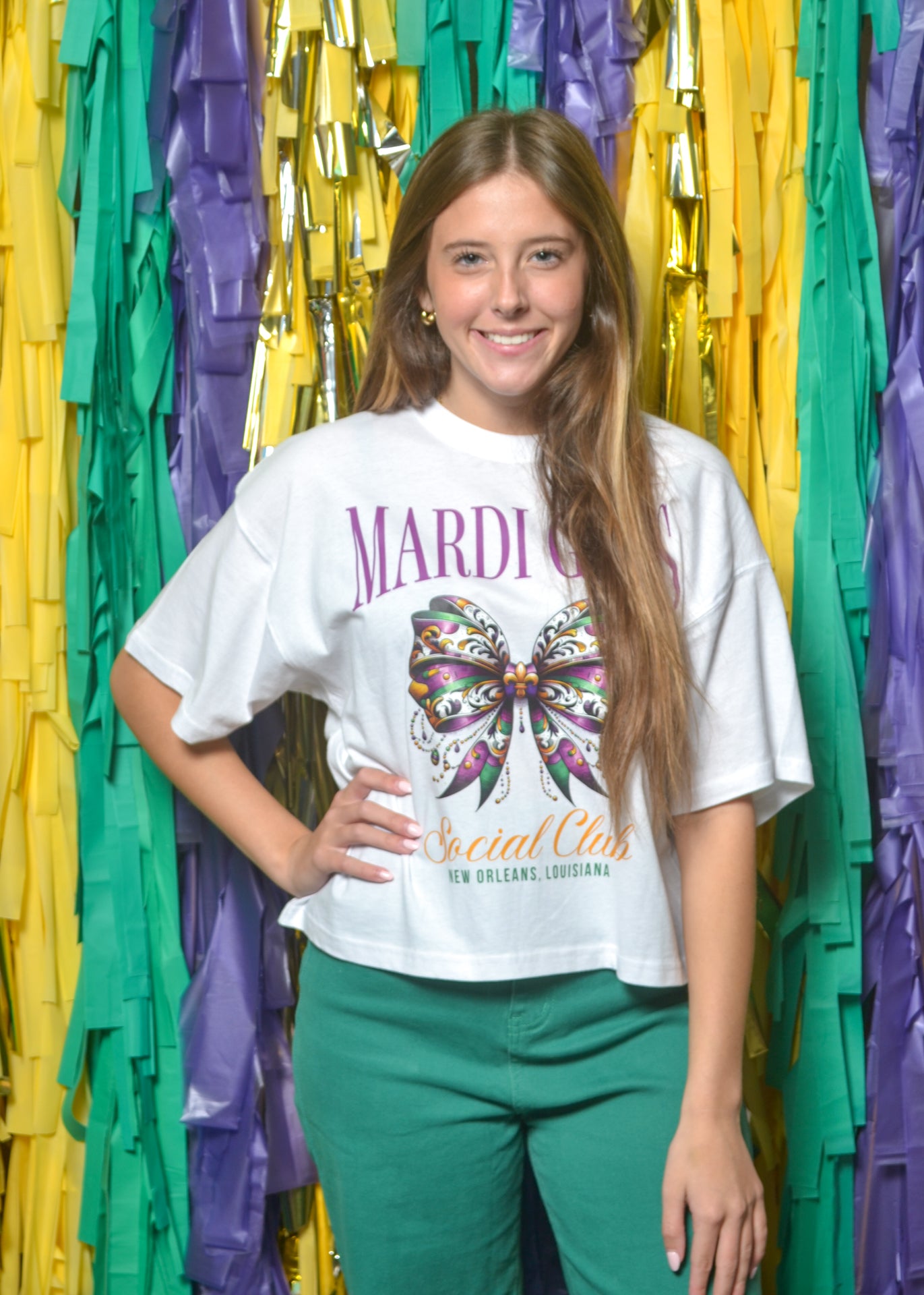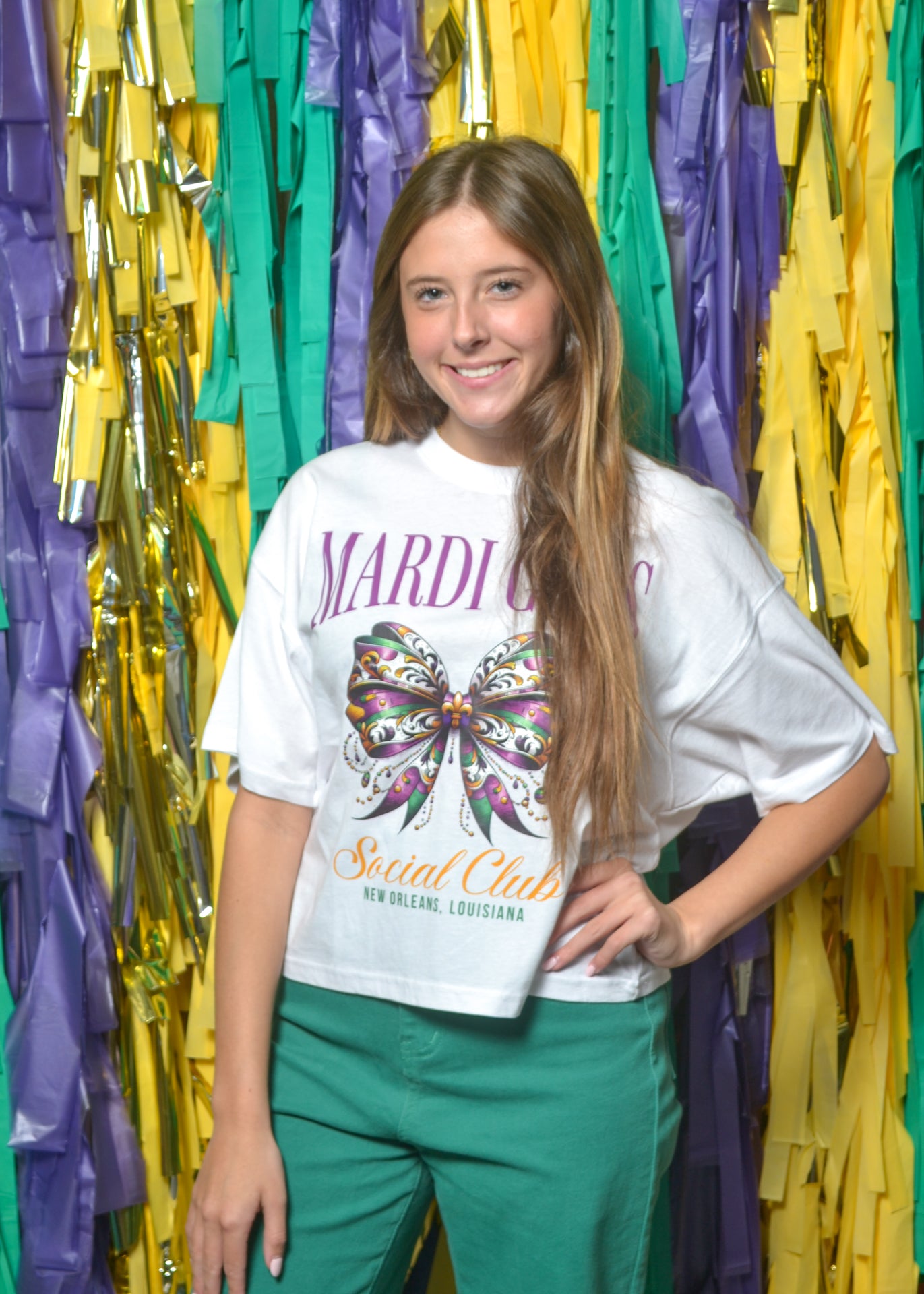 Channel the New Orleans spirit in this cropped graphic tee featuring a stunning beaded bow and bold “Mardi Gras Social Club” print.