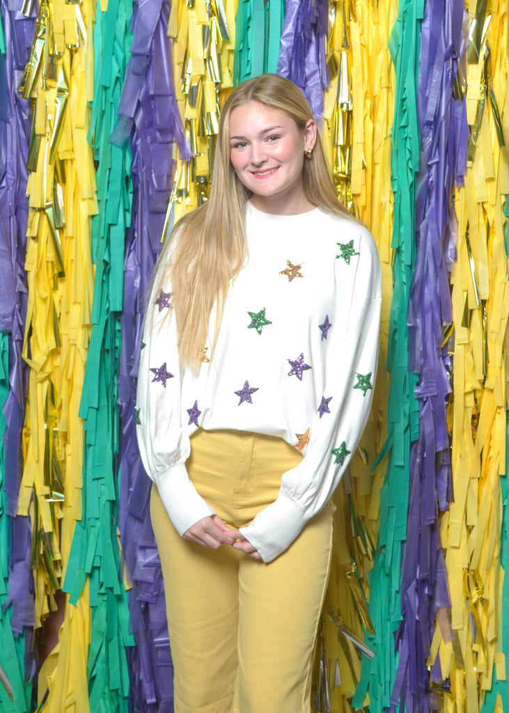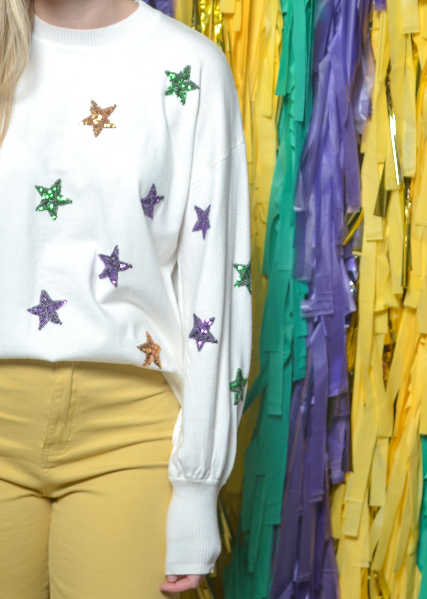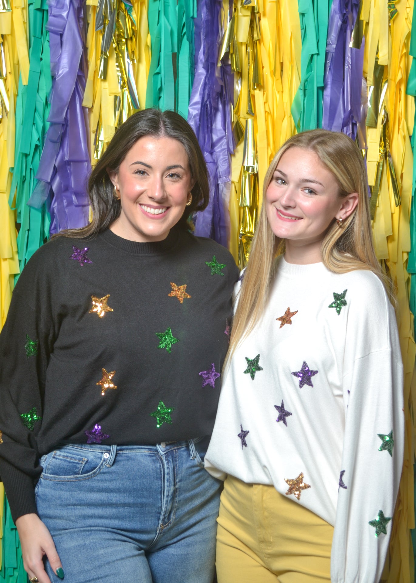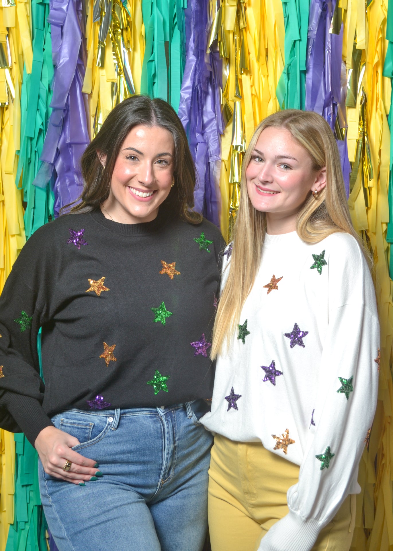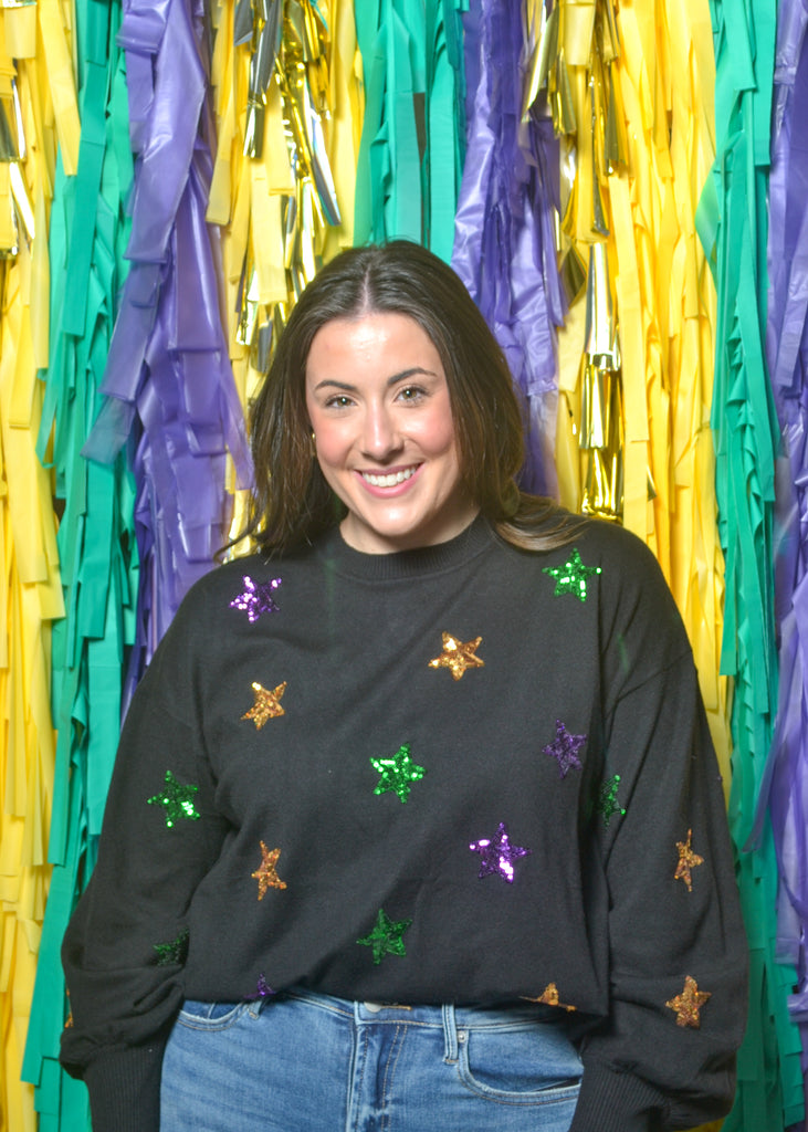Bring the sparkle everywhere you go with the Stars On My Mind Sweater. This soft, lightweight knit is sprinkled with colorful sequin stars in classic Mardi Gras hues—purple, green, and gold—creating a festive look that’s fun, bold, and easy to style. Available in both black and ivory, this statement sweater pairs perfectly with denim, wide leg pants, or a flirty skirt for parade days and everyday outfits.