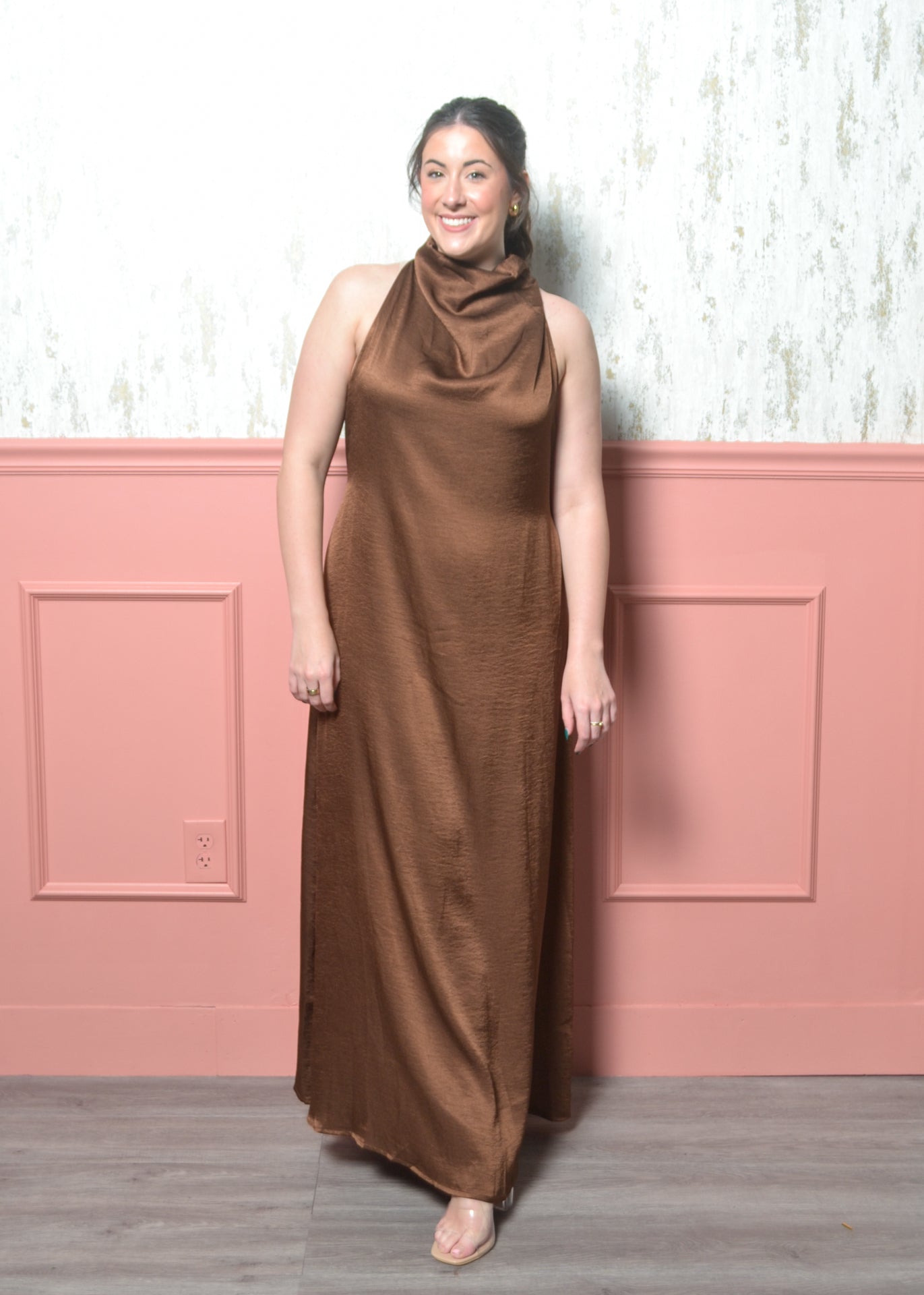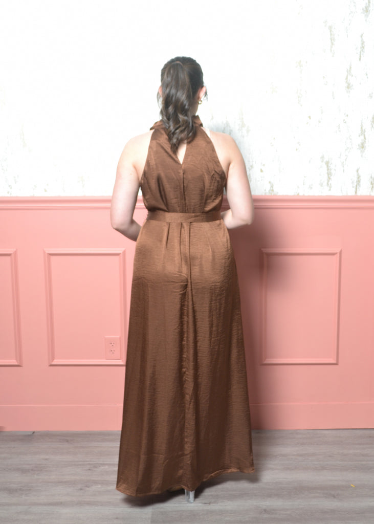 The Cocoa Drape Maxi Dress is the effortless showstopper your wardrobe has been waiting for. Designed with a soft draped halter neckline and a fluid, satin-like finish, this dress falls beautifully over the body for a chic, elongating look. It includes a removable self-tie belt, giving you the option to wear it relaxed and flowy or cinched at the waist for added shape. Perfect for holiday dinners, winter weddings, and year-round special occasions.