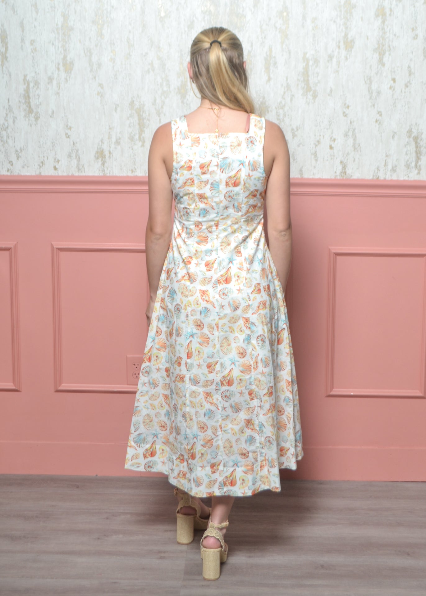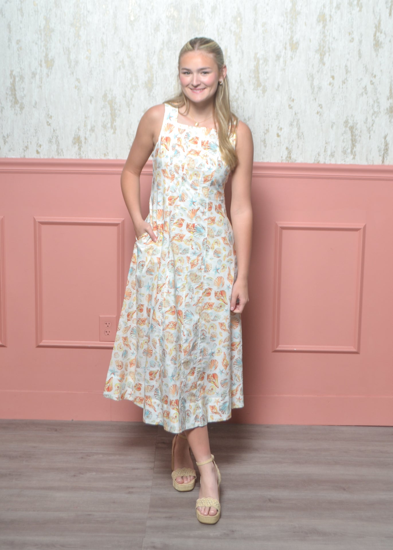 Light, breezy, and full of charm, this printed maxi dress brings a soft coastal feel with its delicate seashell pattern and flattering flowy silhouette. Perfect for vacations, brunch dates, or spring events, it’s an easy go-to when you want something feminine and effortless.