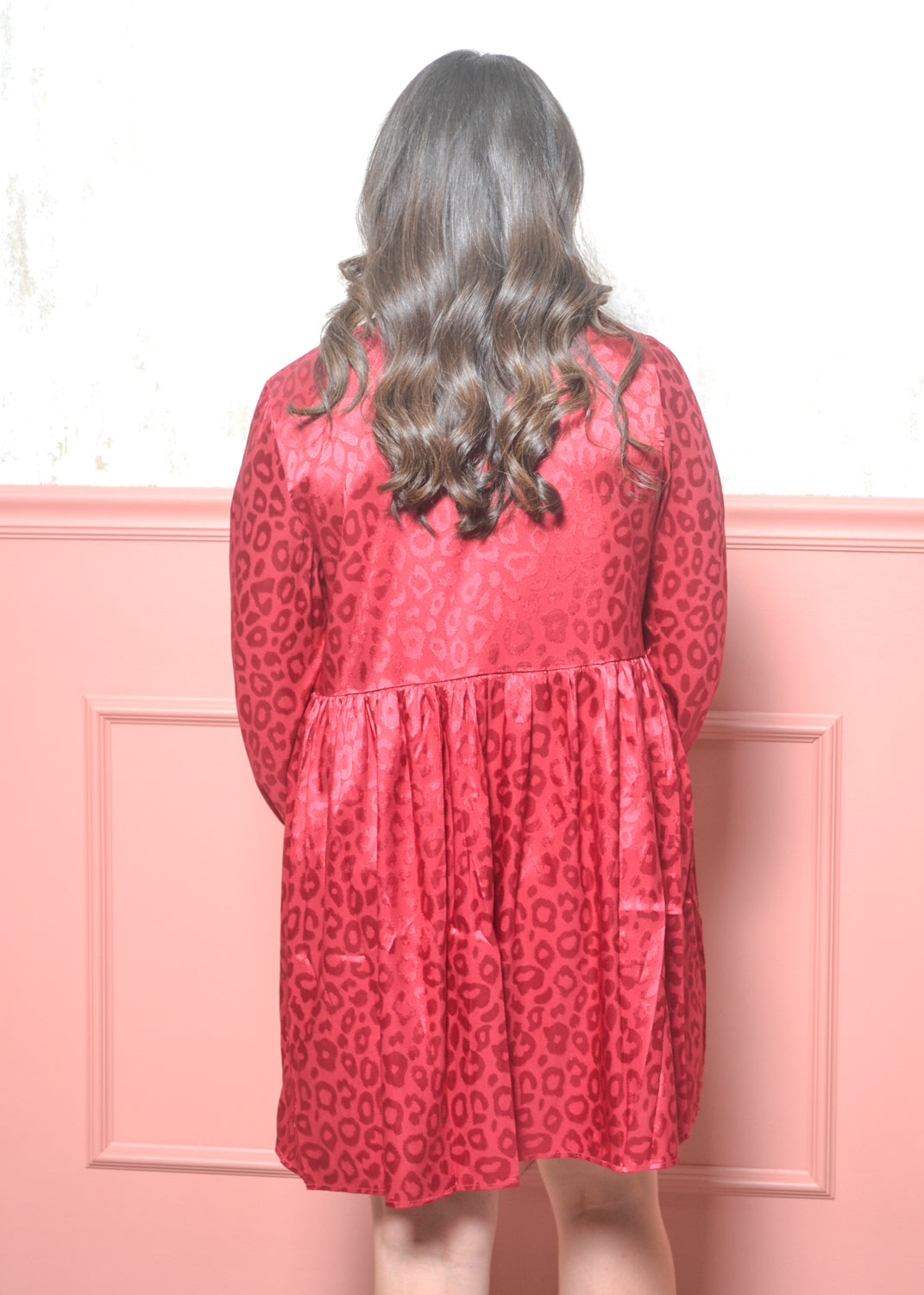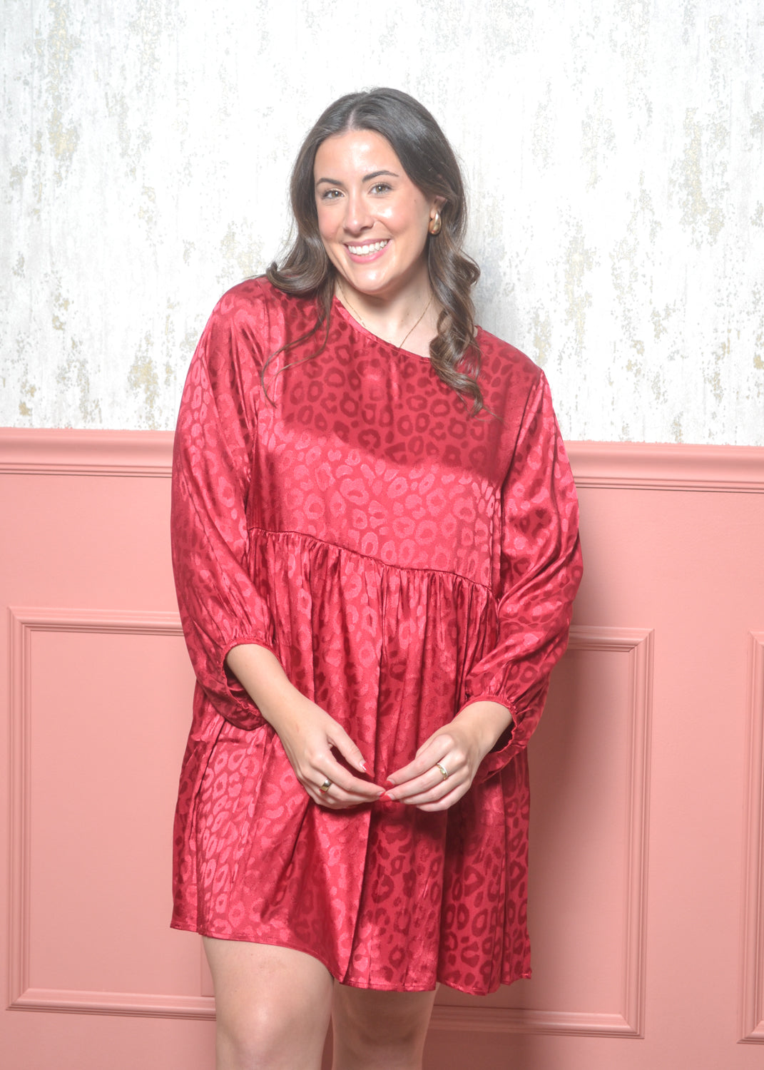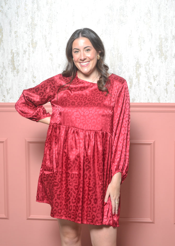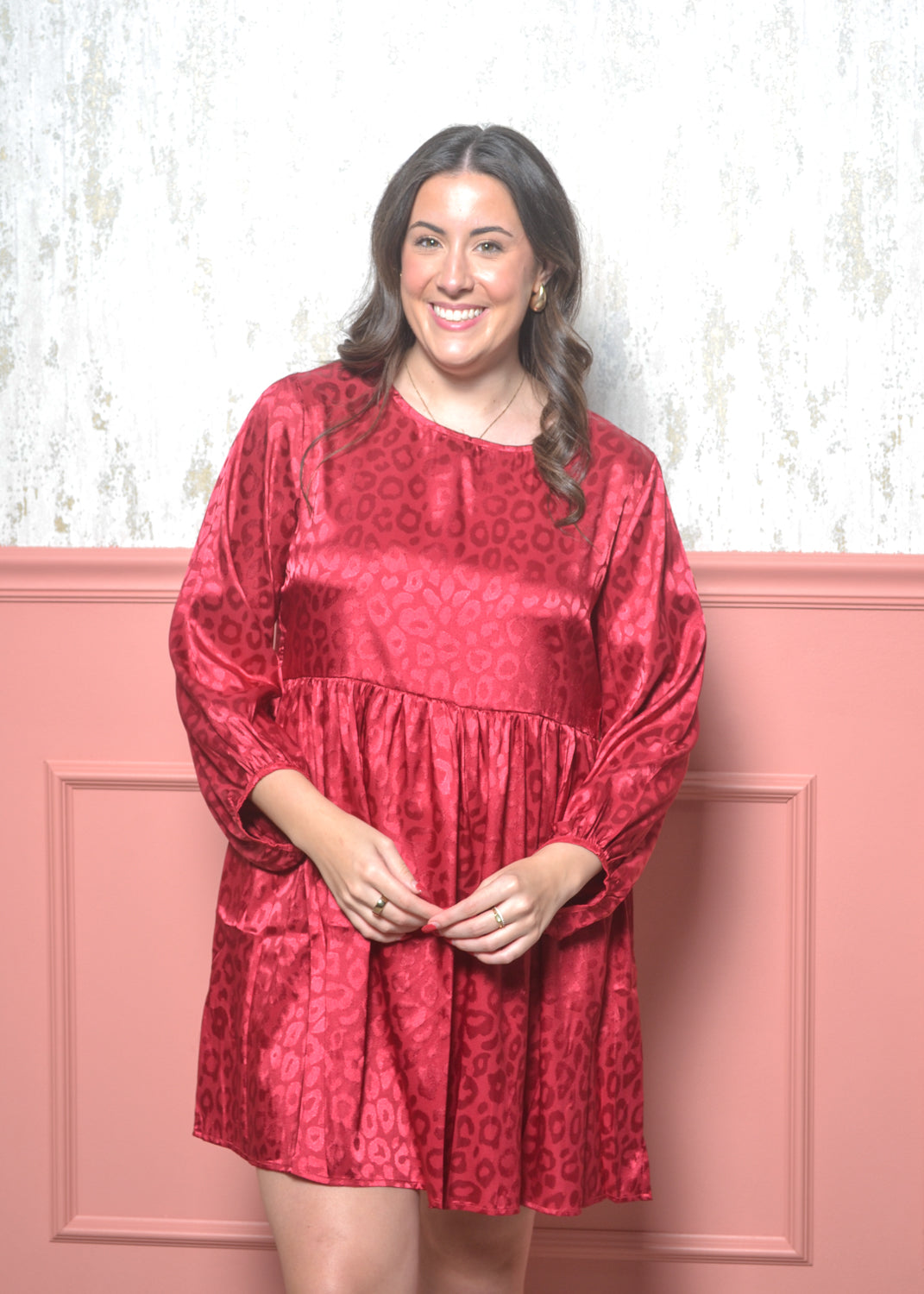 Turn heads in this luxe leopard-textured mini that blends rich color with a flattering flowy fit. Perfect for date nights or holiday parties.