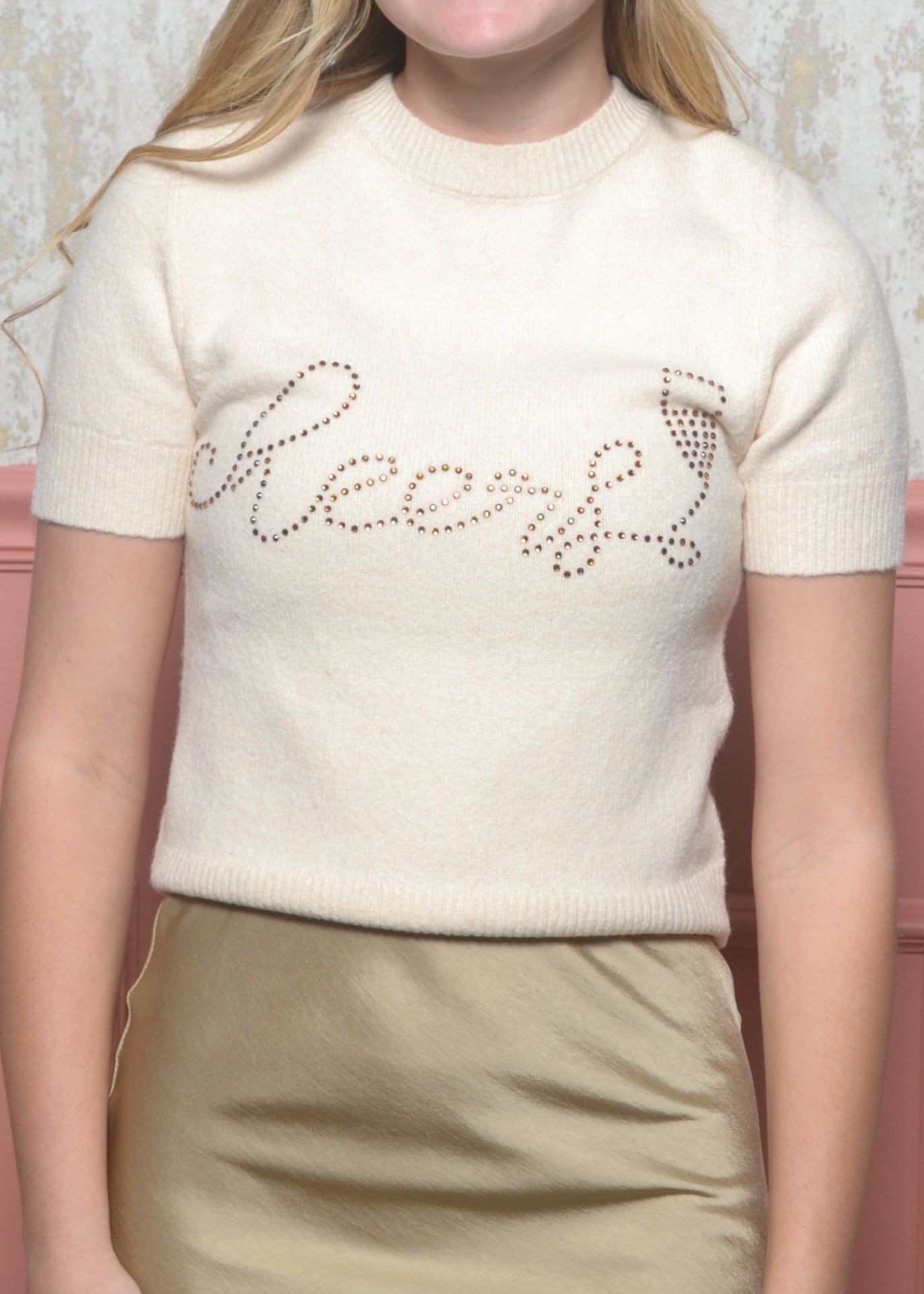 A cute little statement top for ringing in the New Year. This soft cream knit adds just the right touch of sparkle with its rhinestone “cheers” script — perfect for parties, dinners, or a cozy celebration at home.