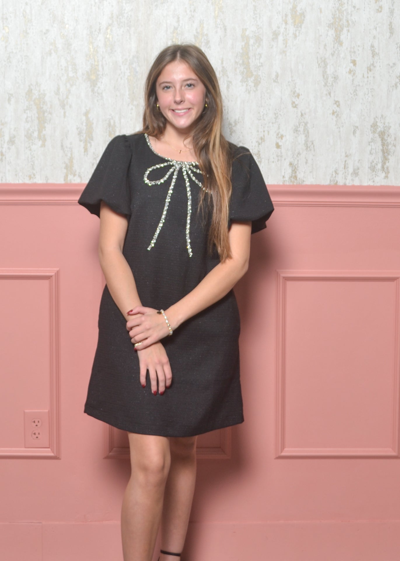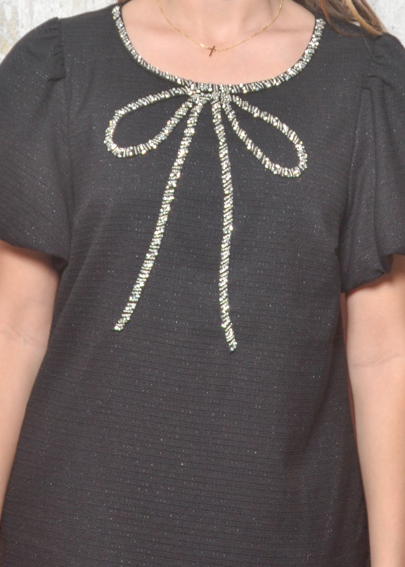 A little sparkle goes a long way, and this dress proves it. With a rhinestone bow detail at the neckline and a soft, easy silhouette, this piece is perfect for holiday parties, dressy dinners, or anytime you want a polished look without overthinking it.