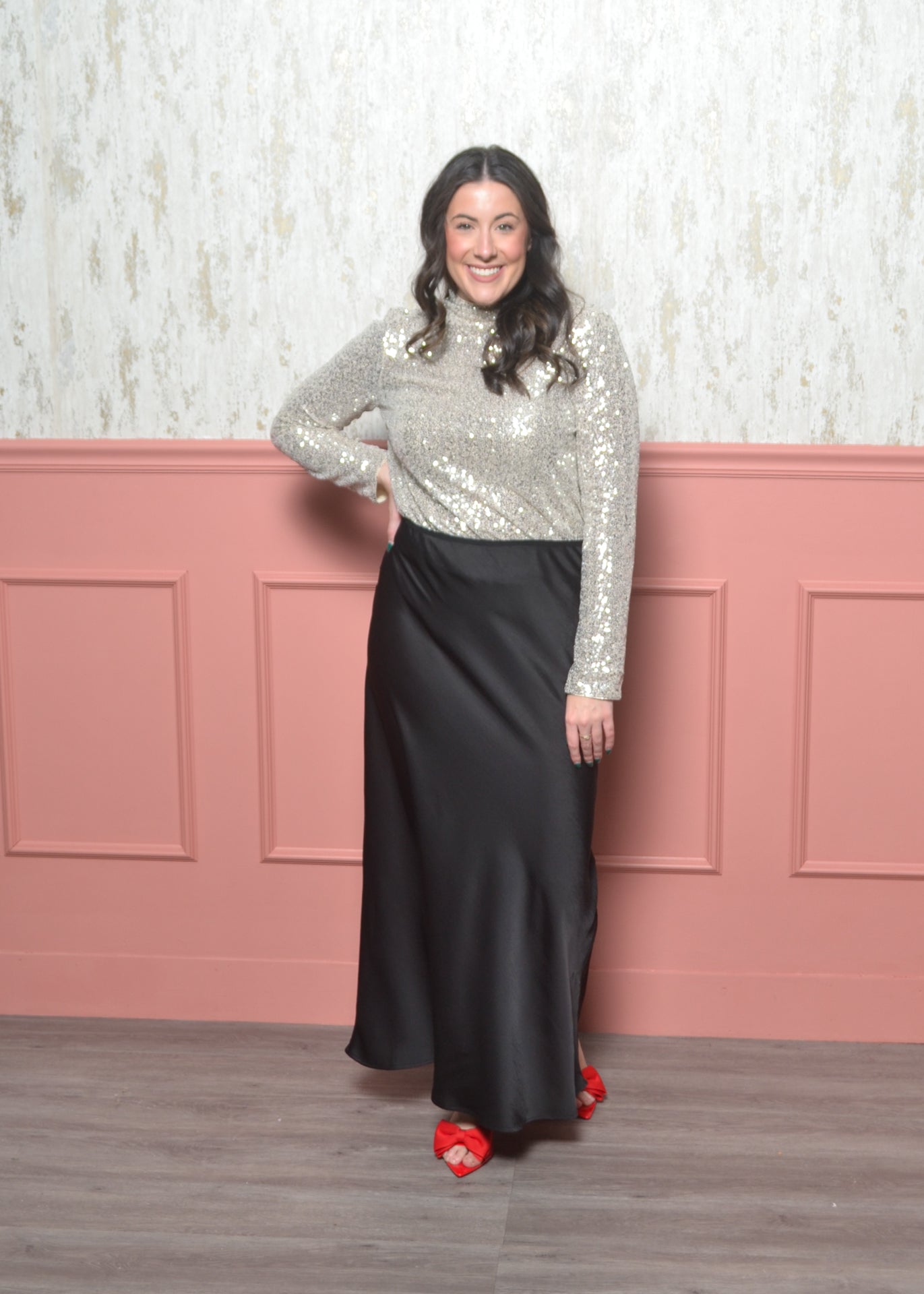 The perfect sparkle top for New Year’s Eve. This sequin mock-neck brings all the shine while still feeling comfortable and easy to wear. Dress it up with a satin skirt or pair it with denim for a more laid-back party look.