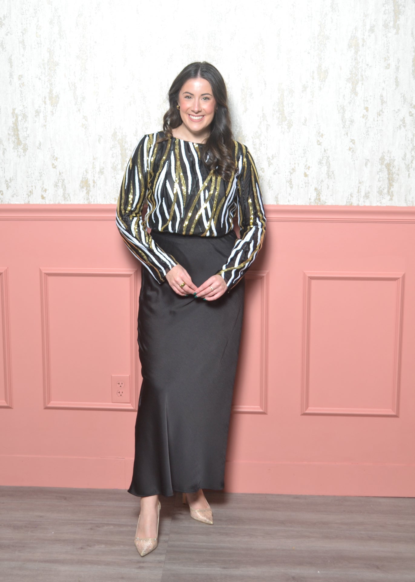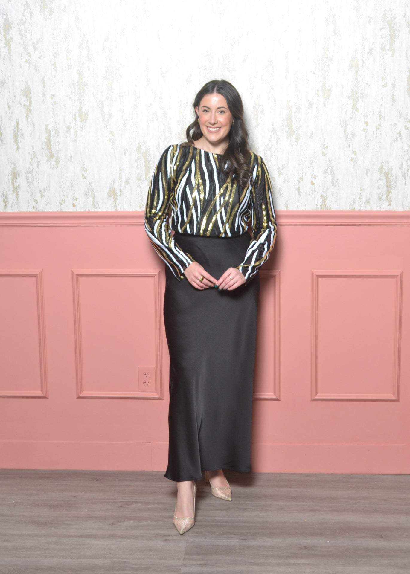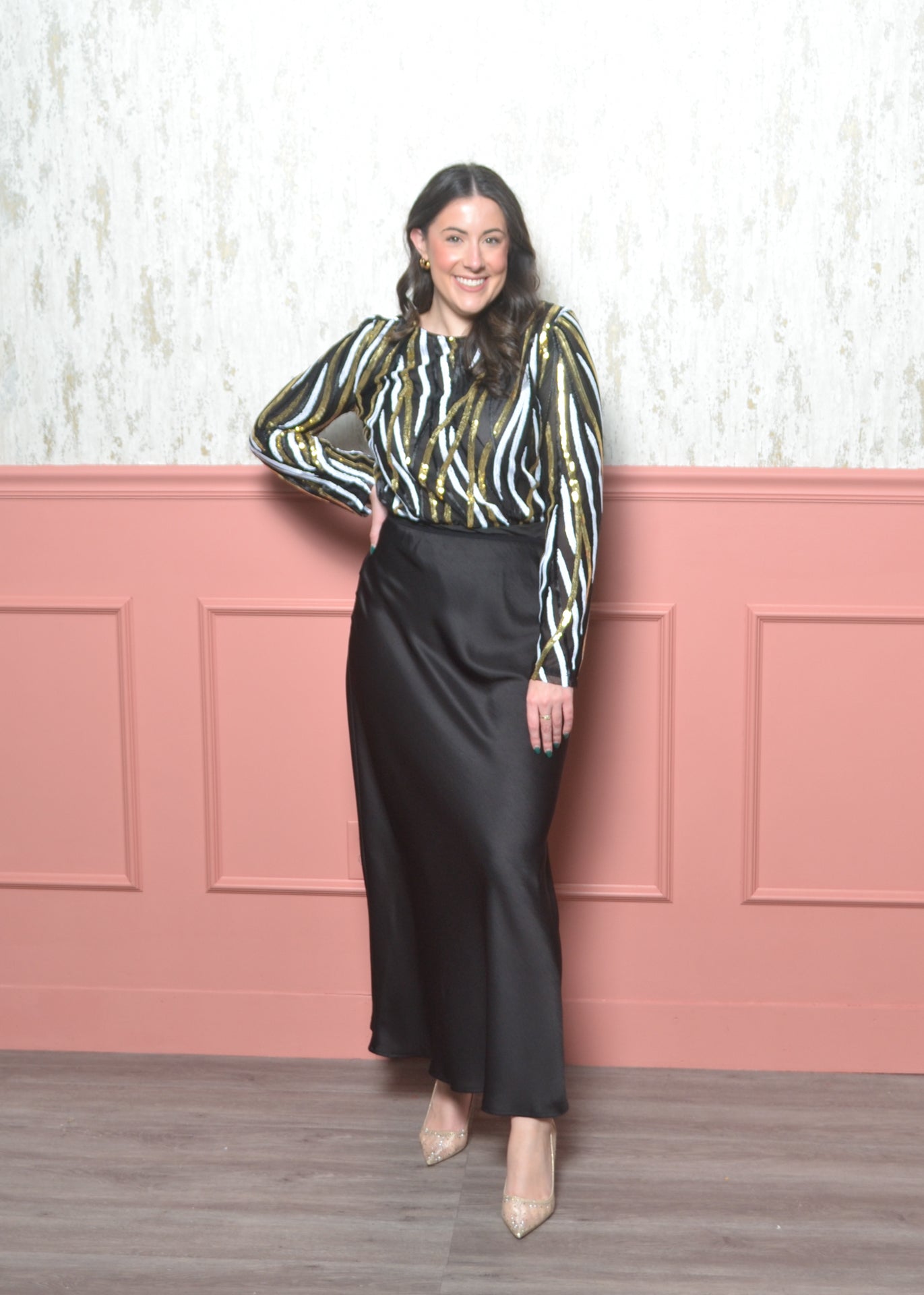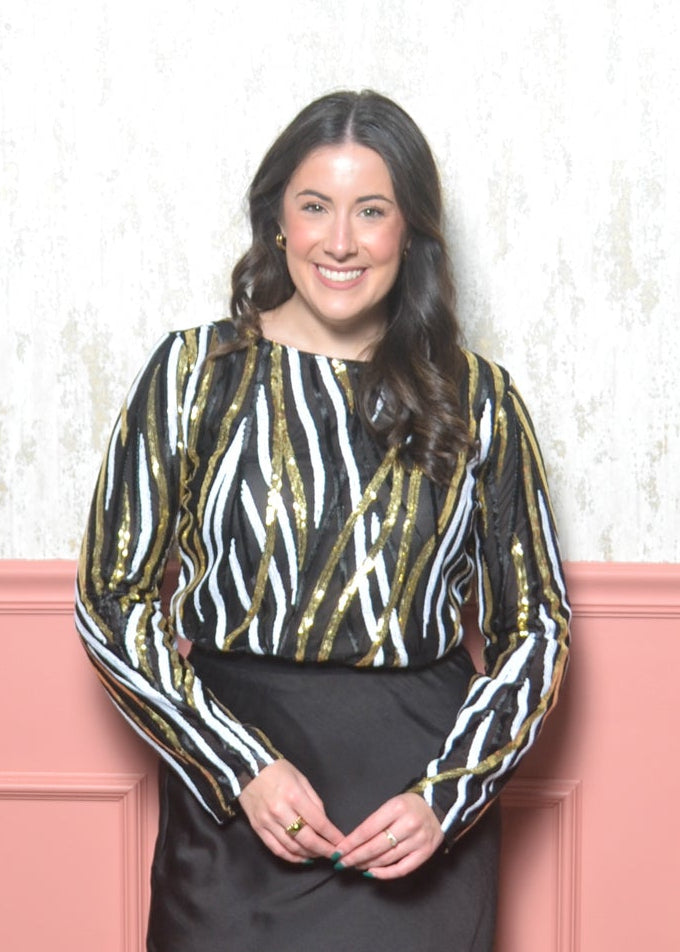 A bold, sparkly piece that was made for New Year’s Eve. This sequin bodysuit features black, white, and gold striping that catches the light from every angle. It gives you that dressed-up, editorial look while the bodysuit fit keeps everything smooth and tucked.