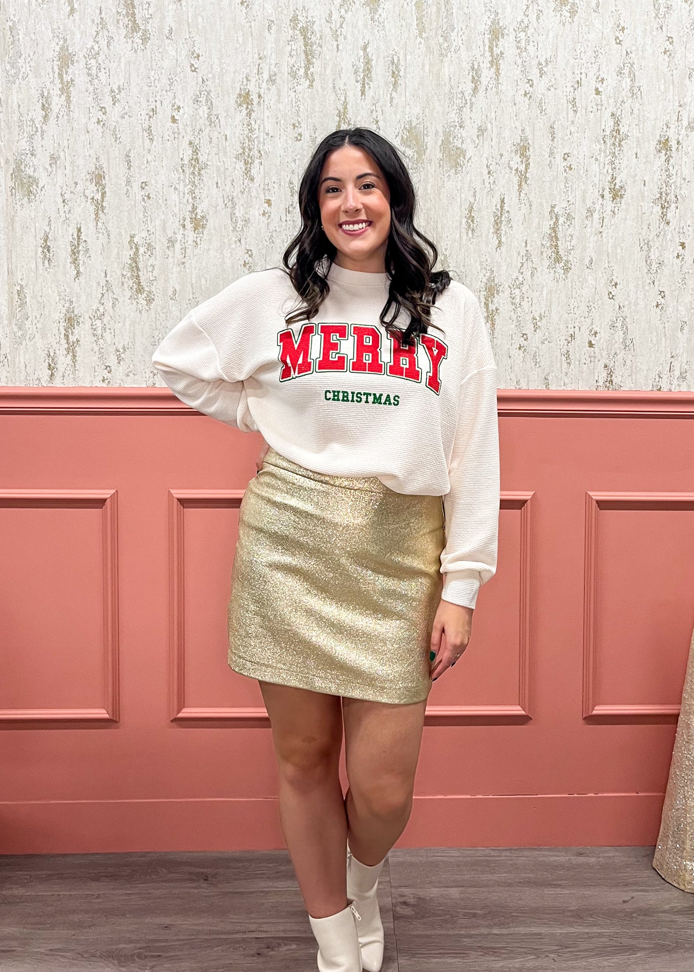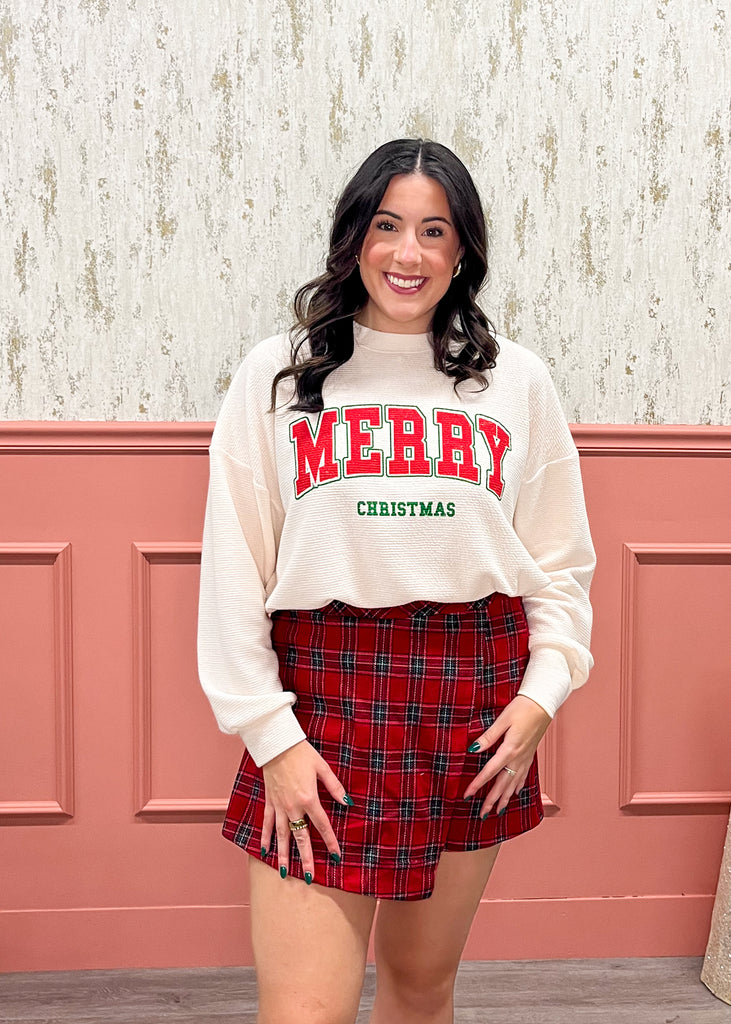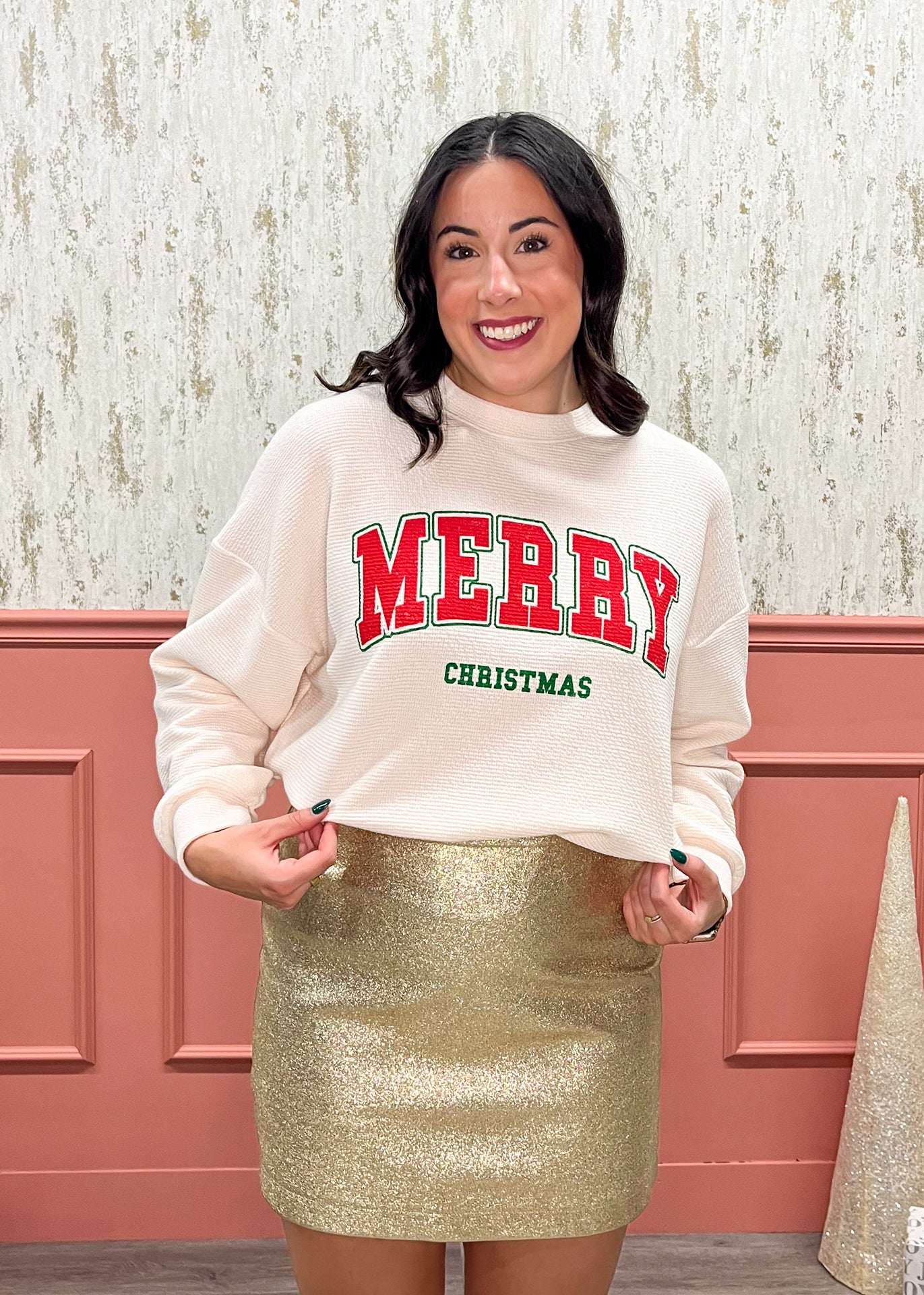 Show off your holiday spirit with the Merry Varsity Christmas Sweatshirt. This cream waffle-knit pullover features bold red varsity lettering with green “Christmas” detail — the ultimate cozy crewneck for festive days.