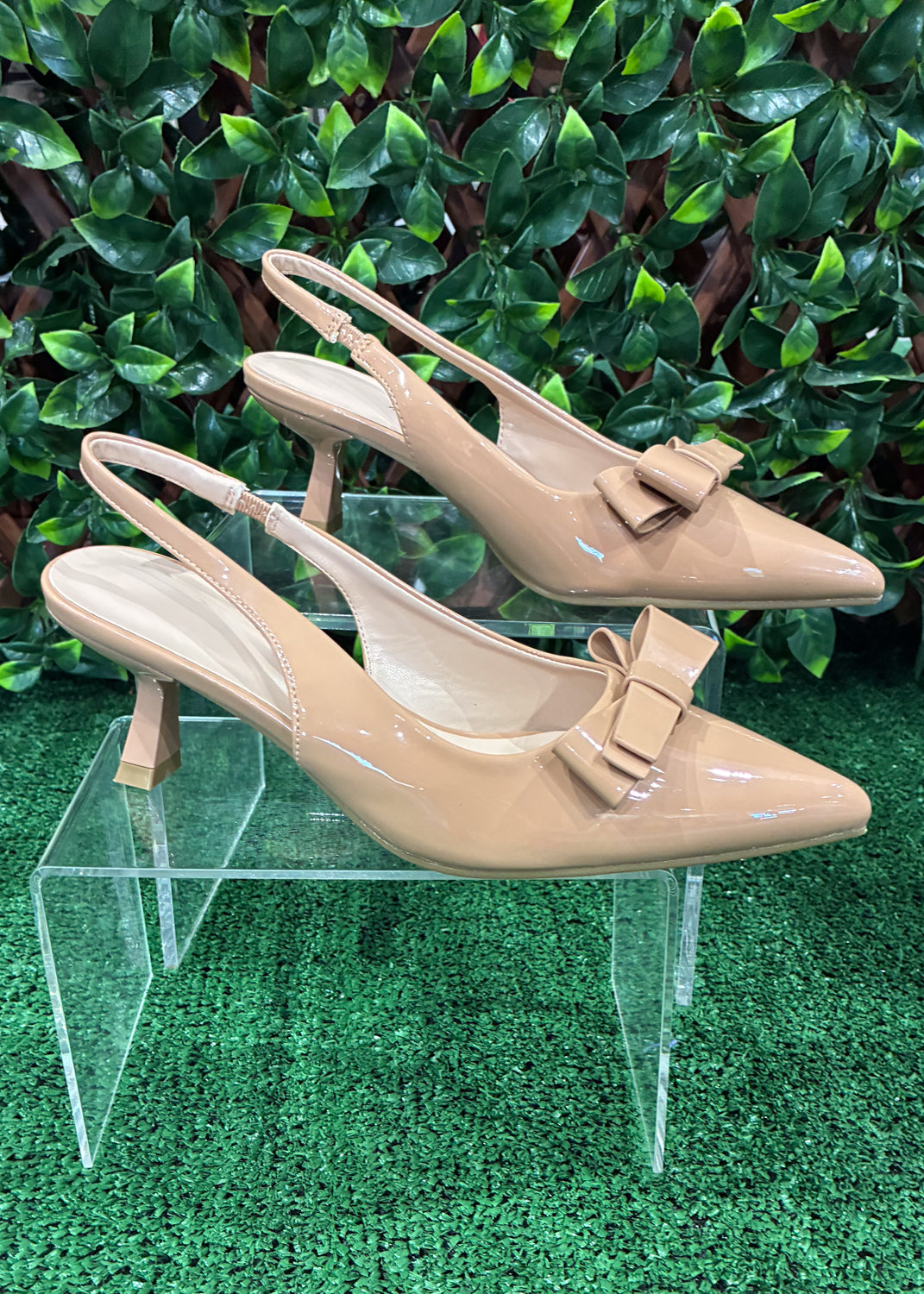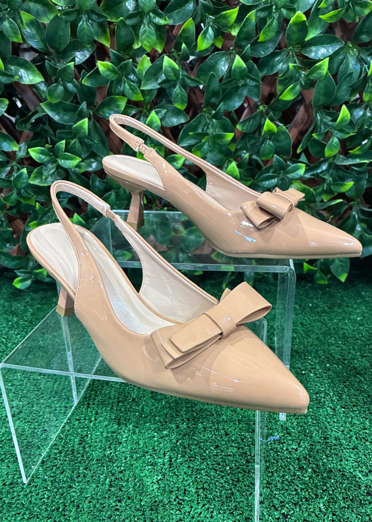 Step into timeless elegance with The Uptown Bow Slingback, a chic patent heel designed for both everyday polish and dressy occasions. Featuring a sleek pointed toe, a feminine bow detail, and a comfortable mid-height heel, this nude slingback adds effortless sophistication to any look. The elastic back strap provides a secure, flexible fit — perfect for the office, events, or elevating your classic denim.