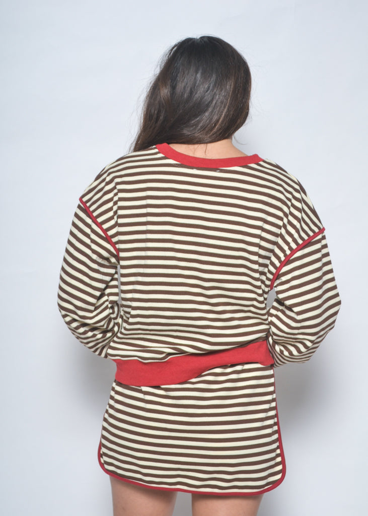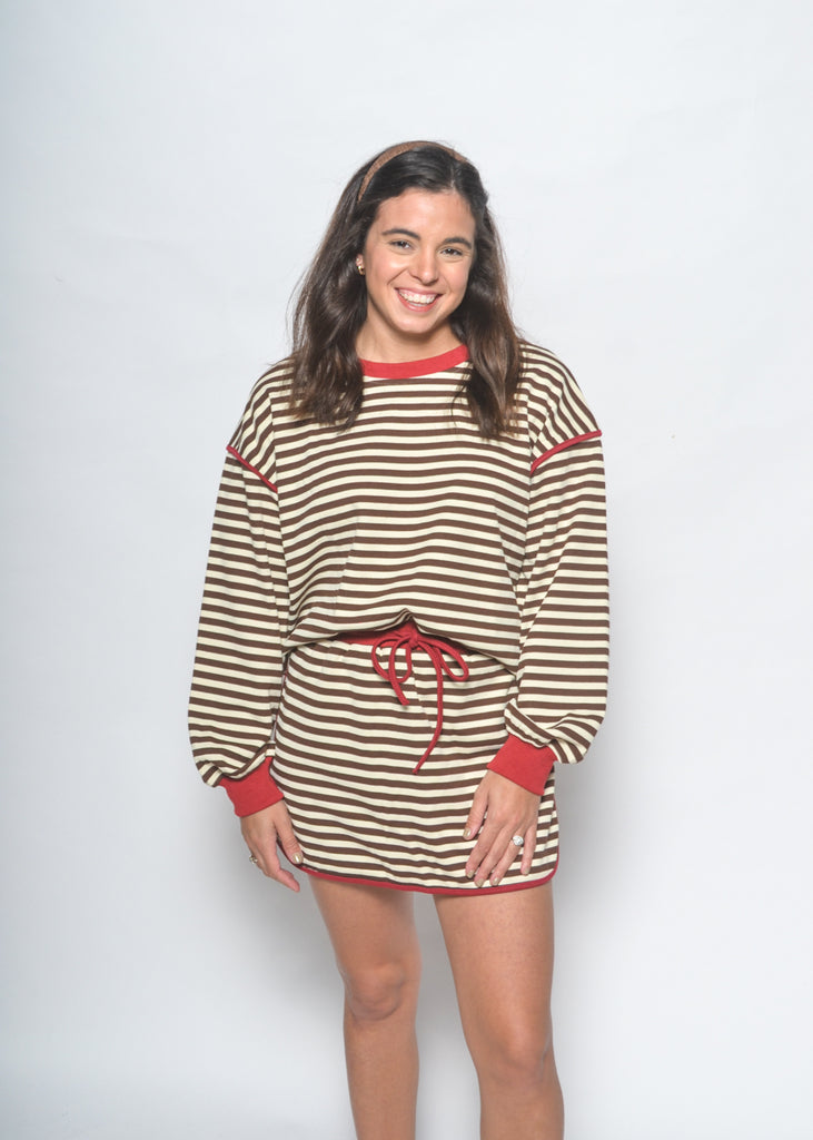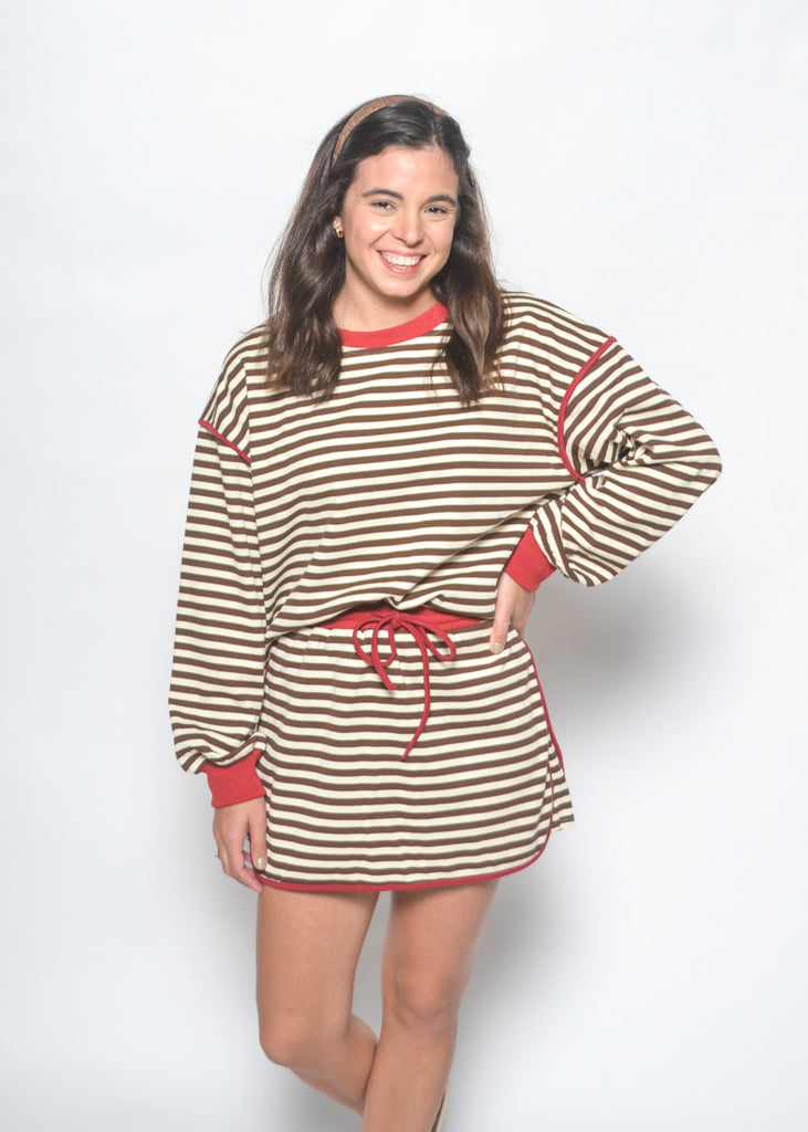 Stay comfy while looking put-together in the Cozy Stripes Skort, the ultimate blend of lounge and everyday style. With its brown and ivory stripe print, red trim details, and functional built-in shorts, this skort gives you the freedom to move with ease. Pair it with the matching pullover or a simple tee for a cute, casual outfit.