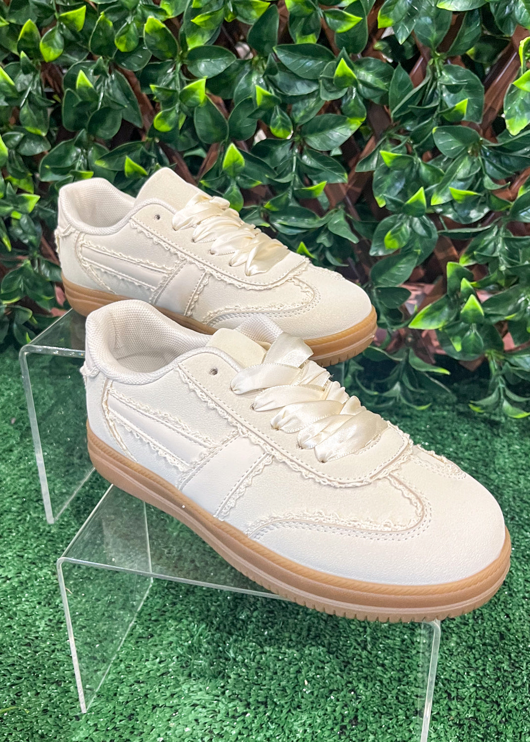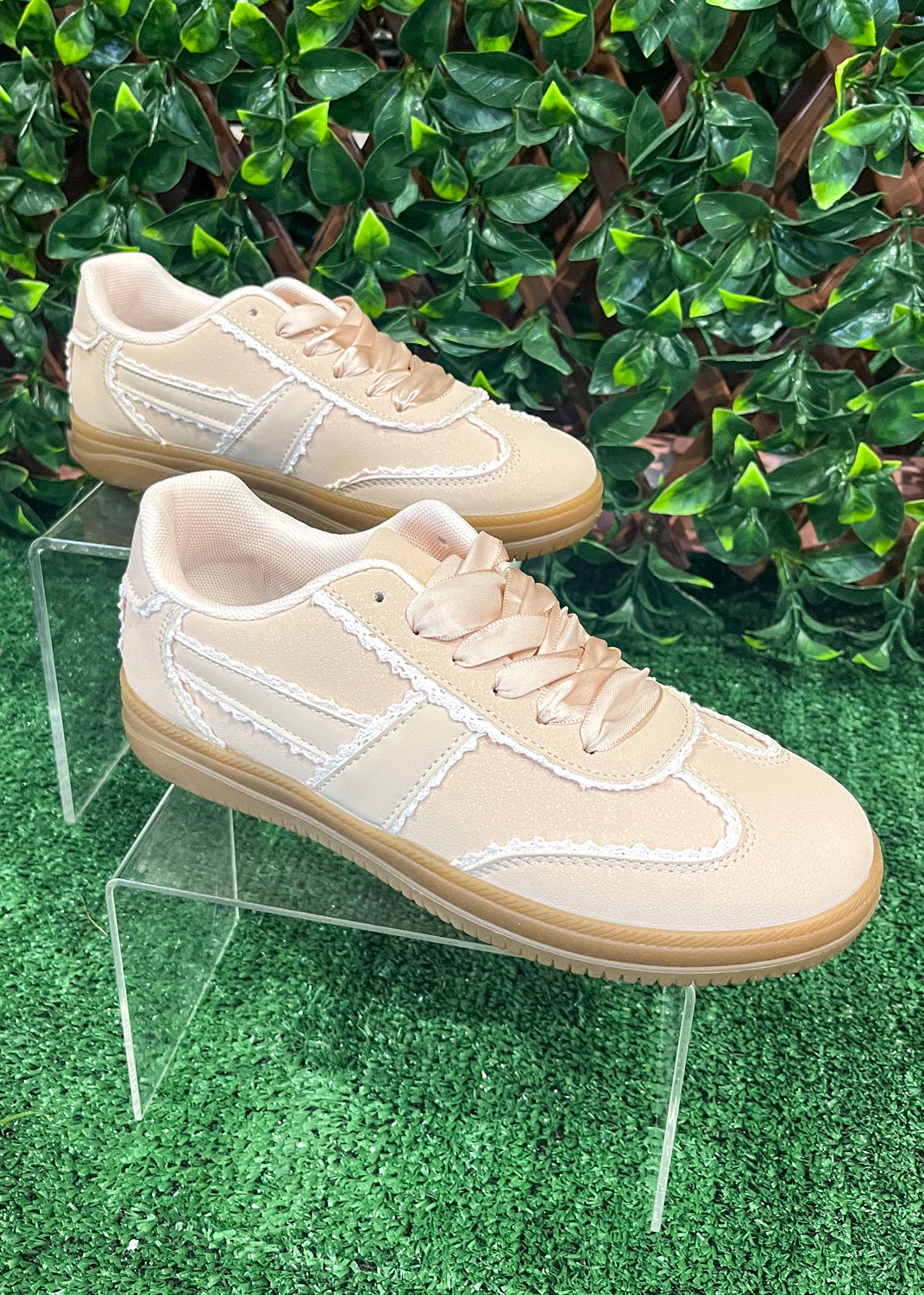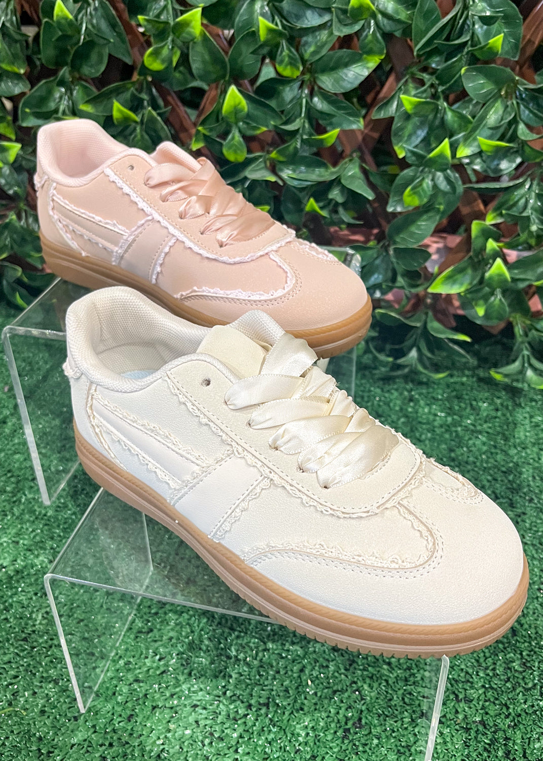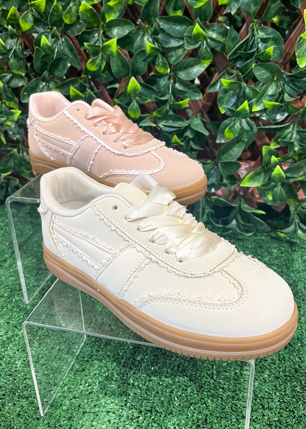 Soft, playful, and easy to wear, the Sweet Street Sneaker is your everyday go-to for comfy, cute styling. Designed with delicate lace-trim detailing and a neutral gum sole, this sneaker pairs effortlessly with denim, dresses, and casual sets for a laid-back but polished look.