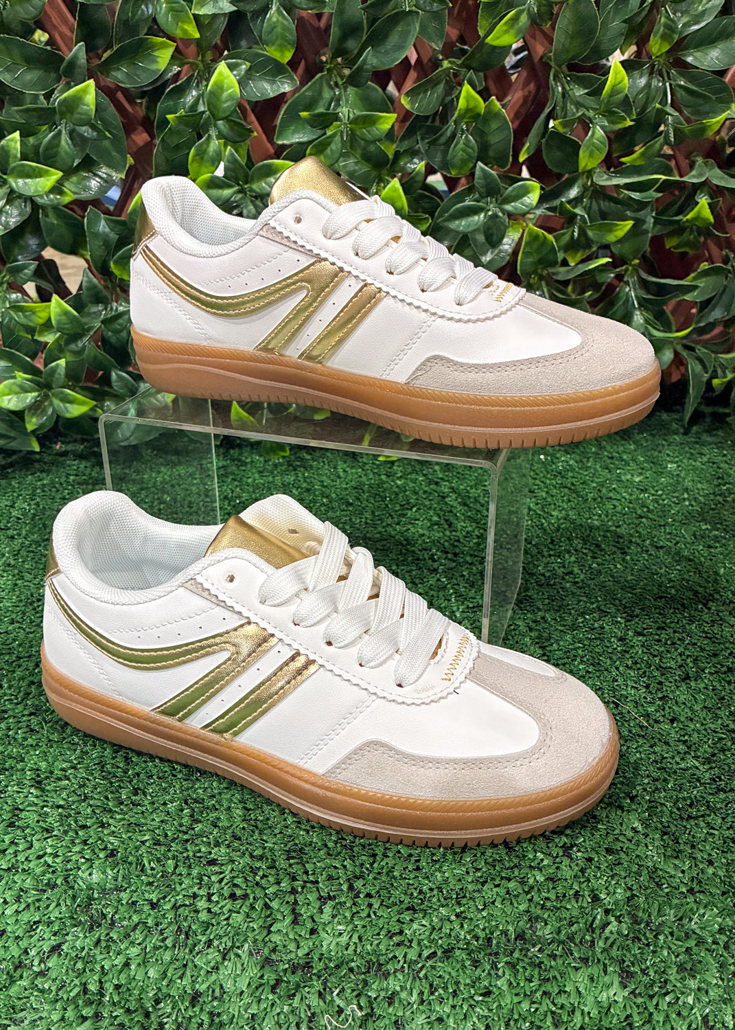 Step into everyday comfort with our Winning Gold Sneaker, a sporty-chic style designed to elevate your casual wardrobe. This standout tennis-style sneaker features a crisp white base with gold metallic accents and a soft suede toe cap, finished with a classic gum sole for that vintage-inspired touch. Lightweight, comfy, and easy to style — it’s the pair you’ll reach for again and again.