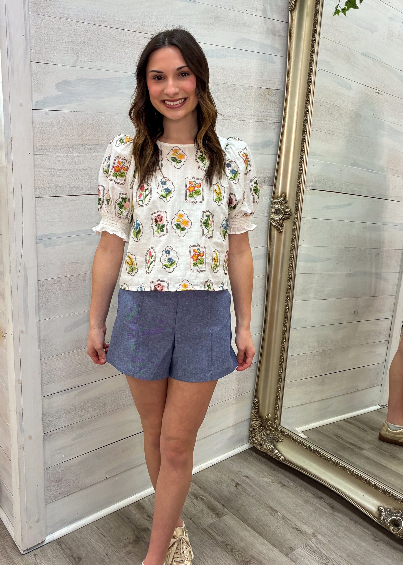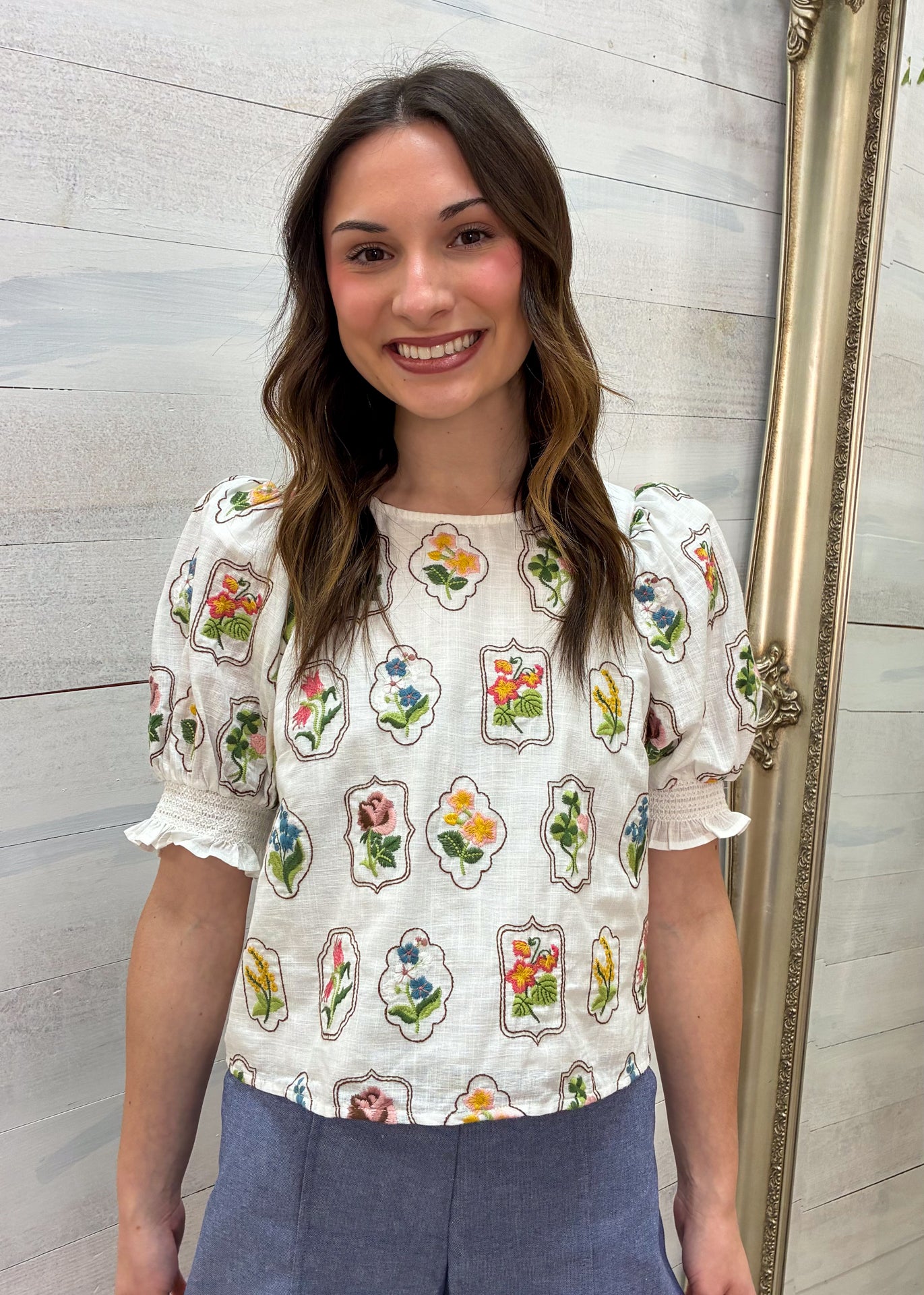 Designed with a relaxed fit and delicate puff sleeves, this lightweight woven top features smocked cuffs with subtle ruffle trim for a feminine finish. The embroidered-style floral print in pink, blue, yellow, and green pops beautifully against the soft cream base, making it easy to pair with denim, skirts, or tailored shorts.
