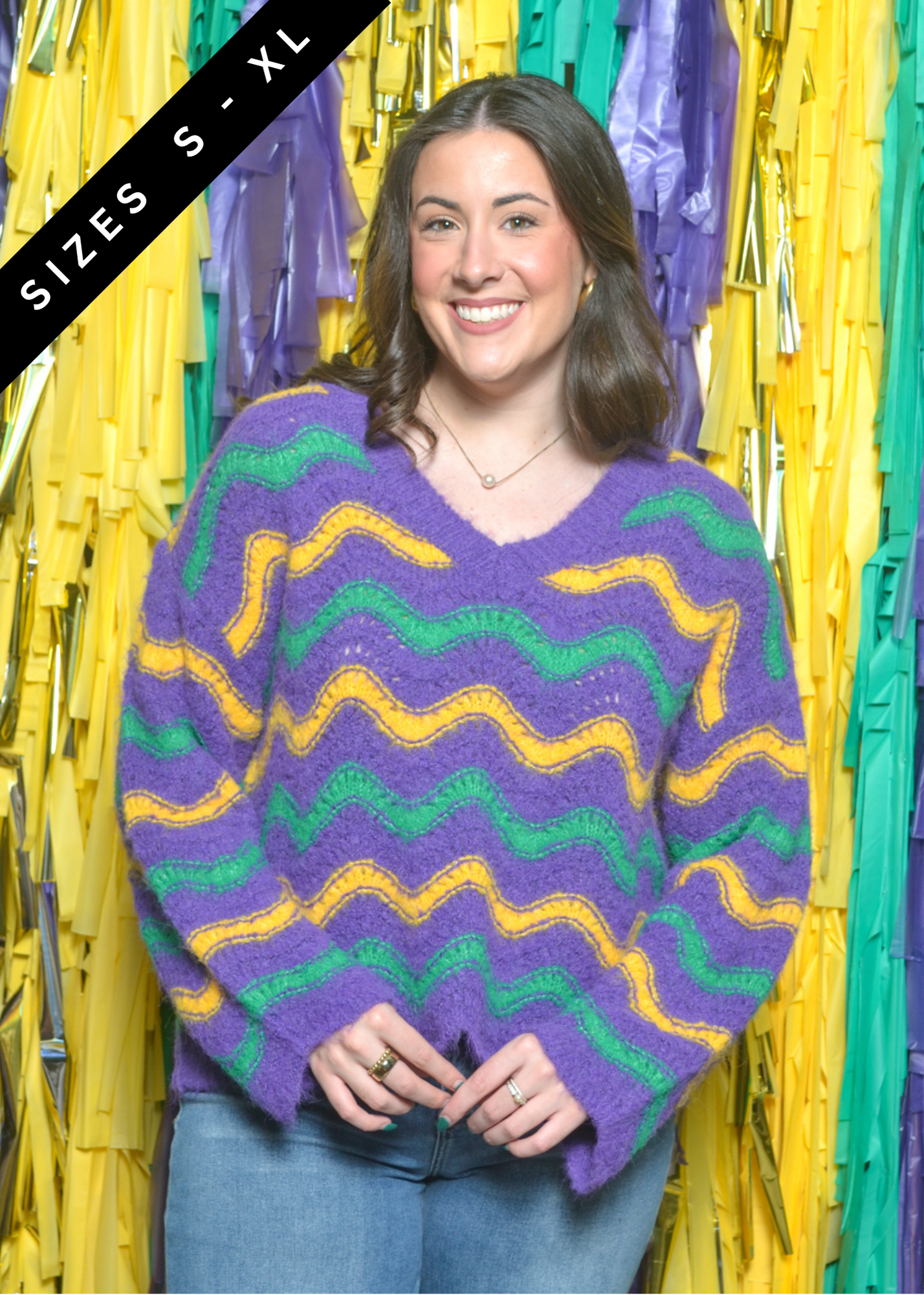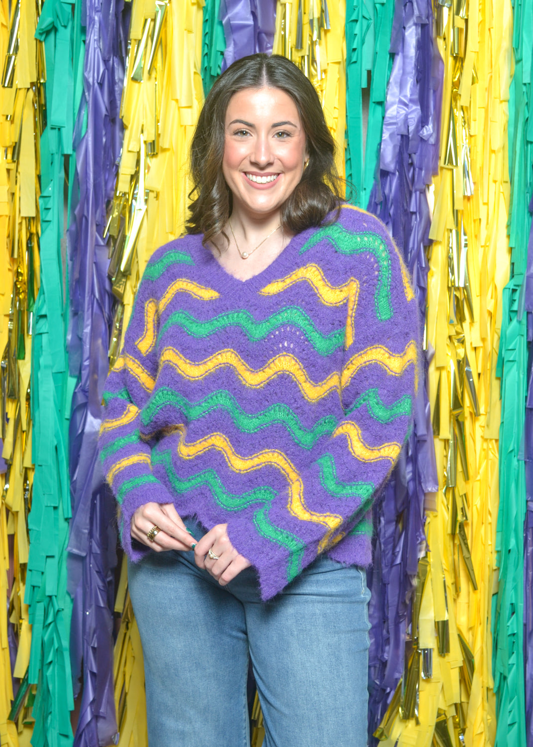 Celebrate the season in full color with our Carnival Wave Sweater, a soft and fuzzy knit covered in bold Mardi Gras stripes. The purple, green, and gold wavy pattern adds the perfect festive touch while keeping you cozy for parades, parties, and cool Louisiana nights.