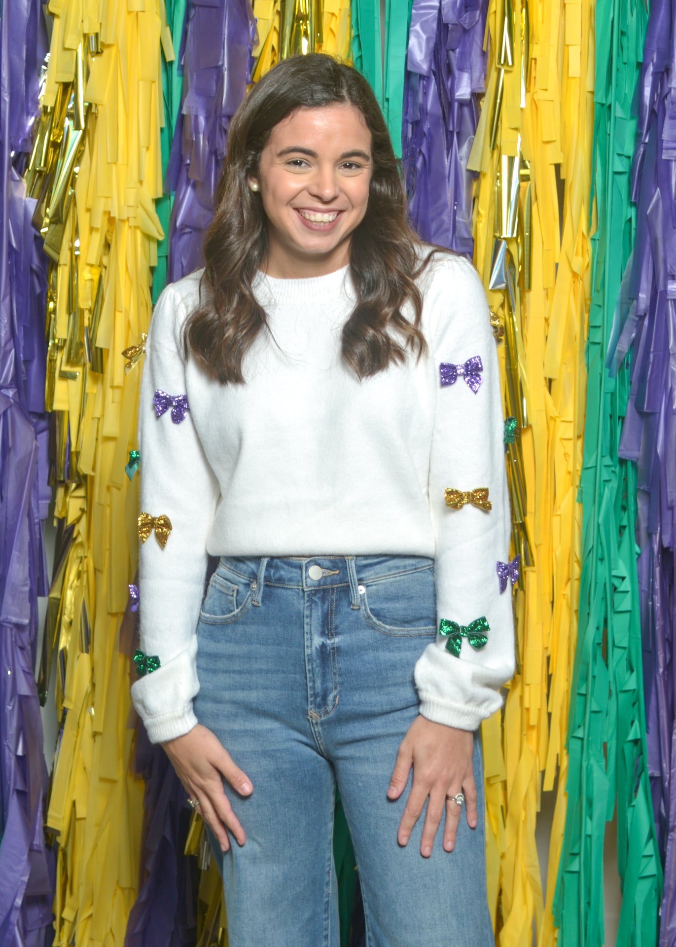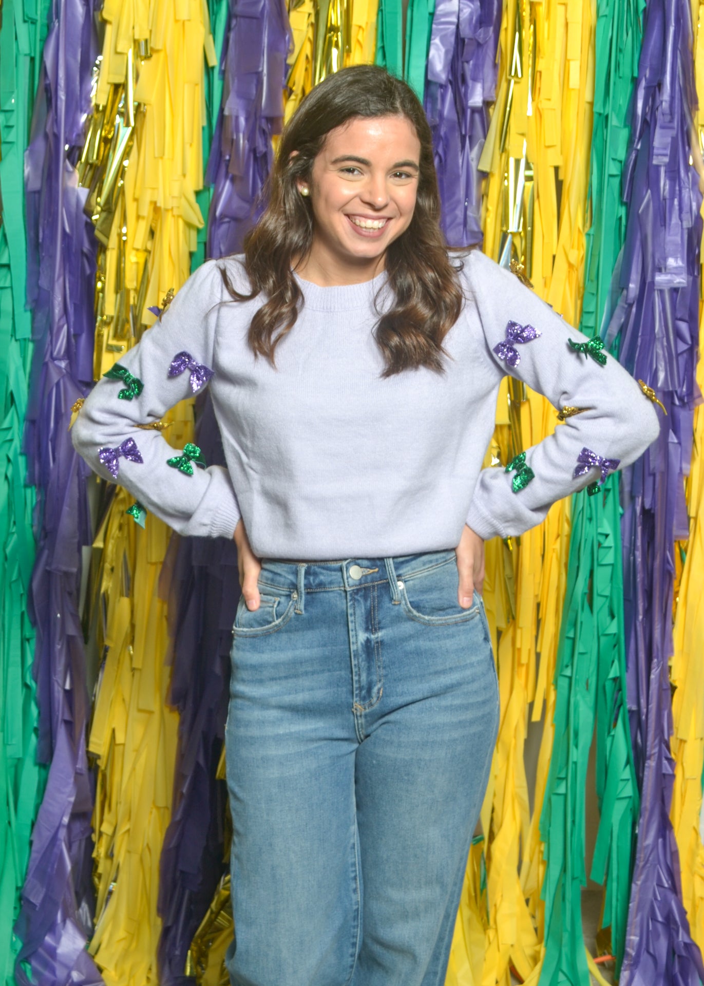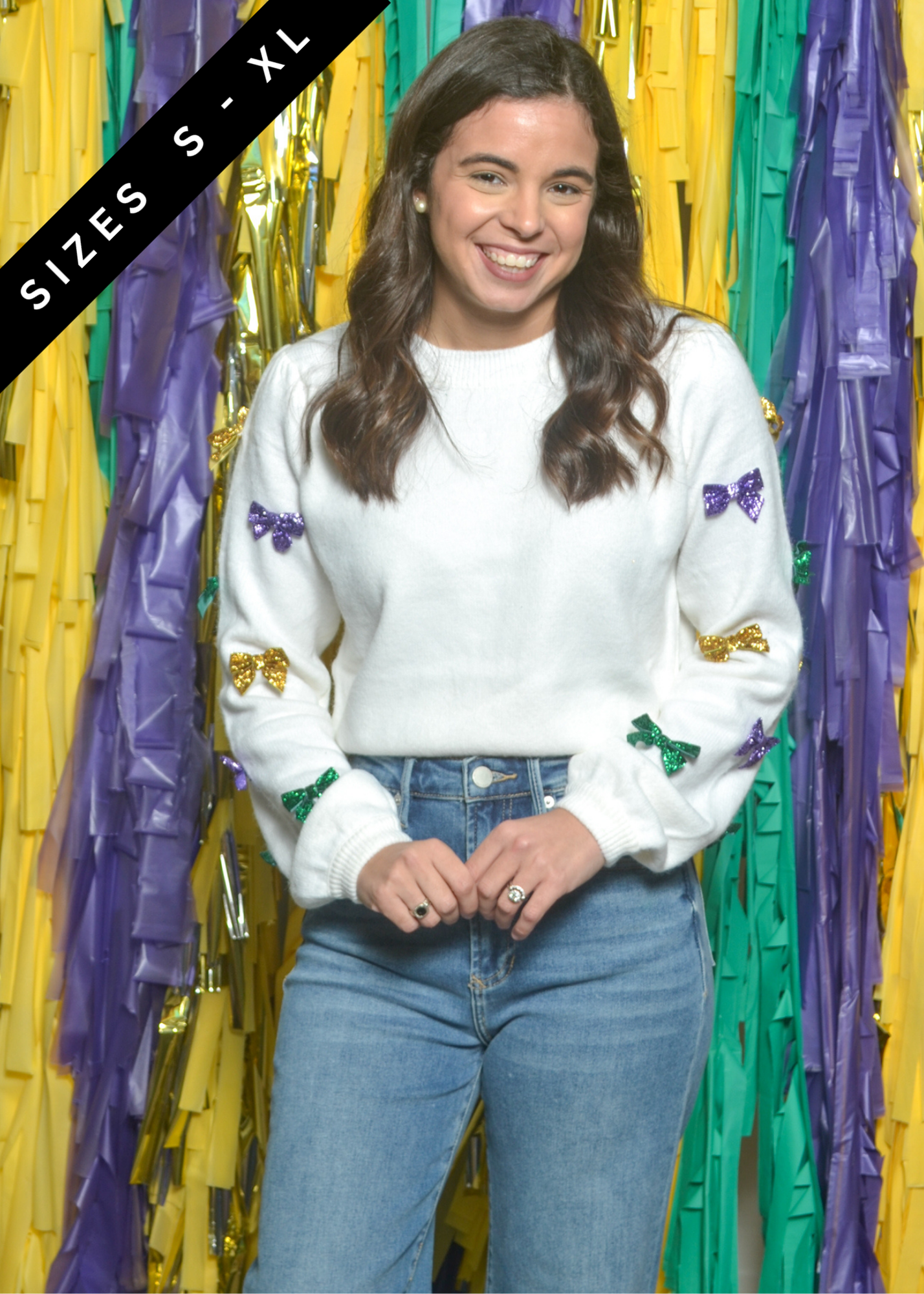 Bring the fun wherever you go with our Mardi Bow Sweater, the cutest way to celebrate the season. This cozy knit is sprinkled with festive sequin bows in Mardi Gras purple, green, and gold — adding just the right amount of sparkle to your everyday look. Soft, warm, and effortlessly playful, it’s the statement sweater your parade season lineup has been waiting for.