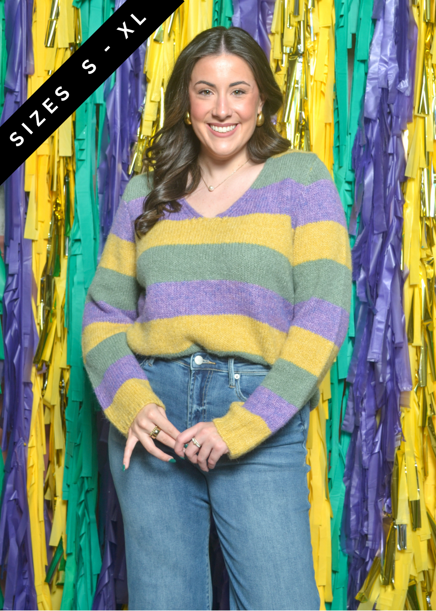 Bring cozy parade-day vibes to your closet with the Tuesday Sweater, a soft striped knit in classic Mardi Gras colors. Its relaxed fit and fuzzy texture make it the perfect throw-on for breezy evenings, casual events, and festive outfits all season long.