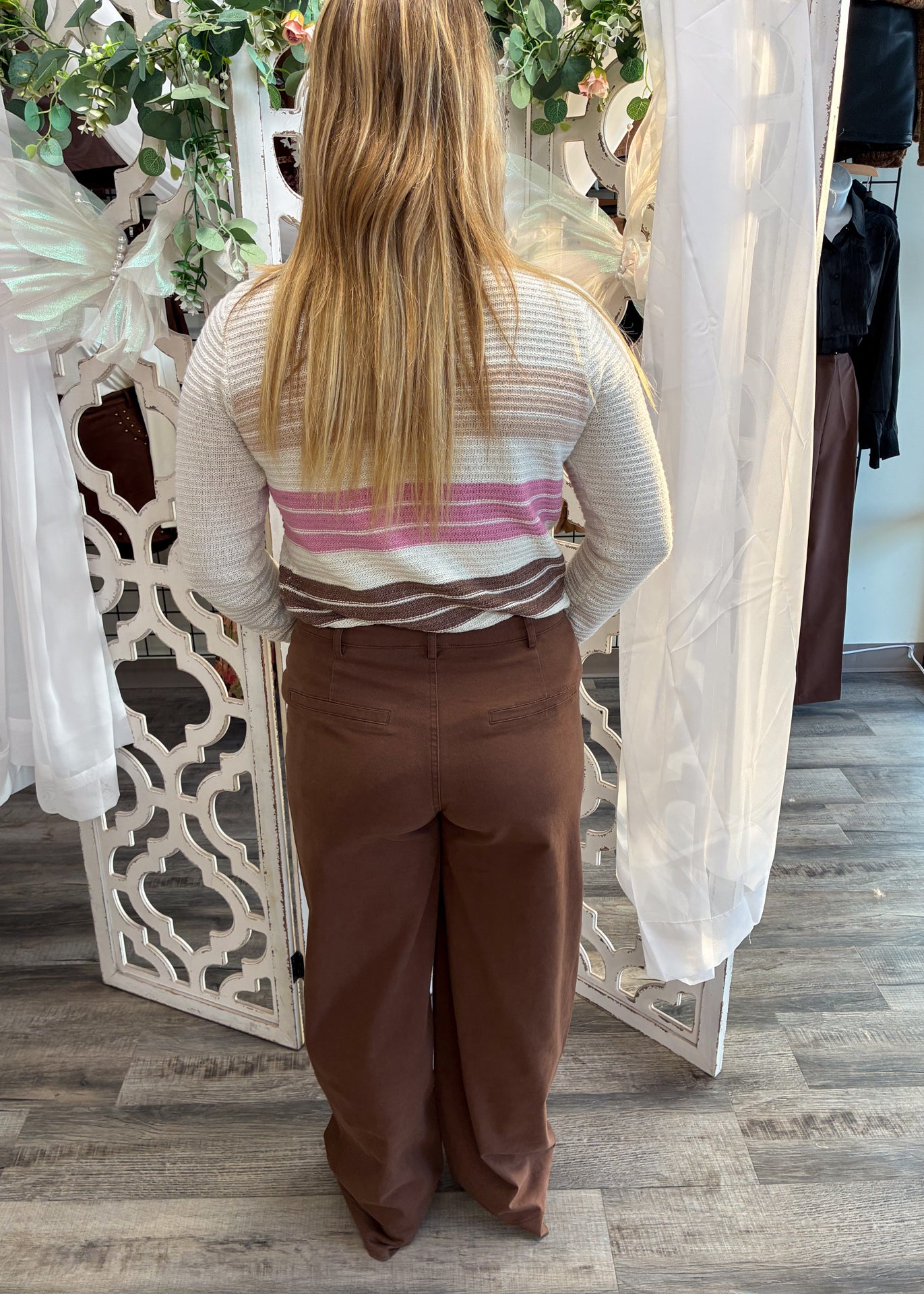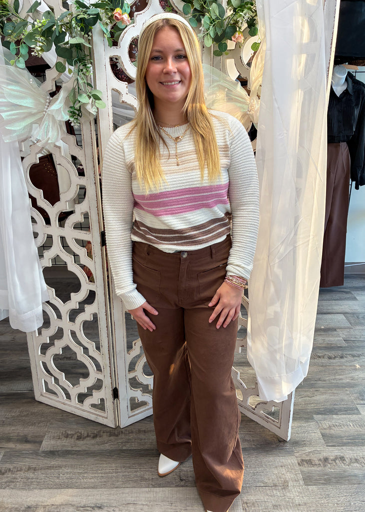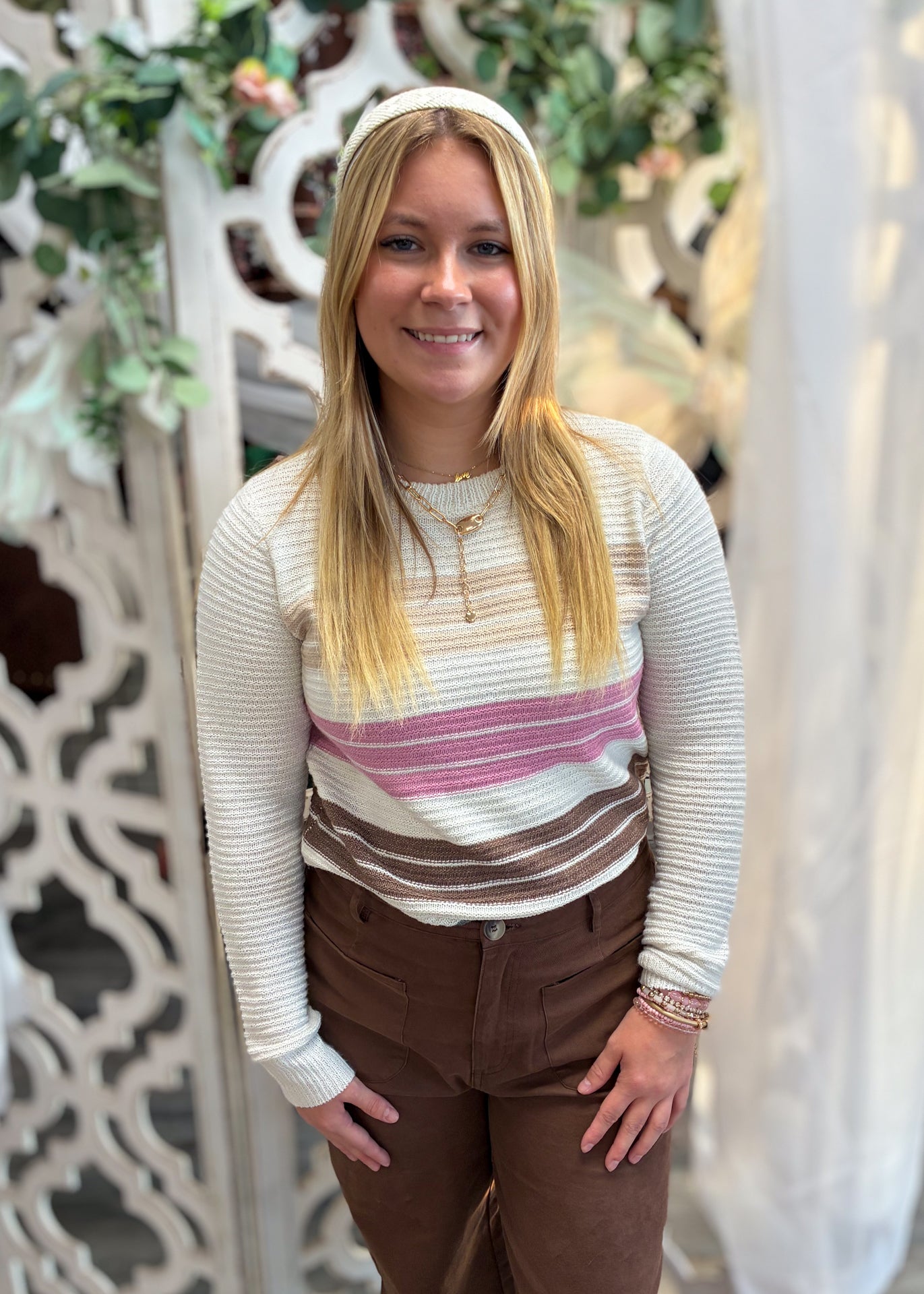 Fresh, soft, and so easy to style — the Sugar Stripe Knit Top adds a sweet pop of color to your everyday wardrobe. This lightweight sweater features a ribbed texture with cream, taupe, brown, and pink horizontal stripes for a cozy yet playful look. The fit is relaxed without being oversized, making it perfect for tucking into denim, cargos, or your favorite fall trousers.