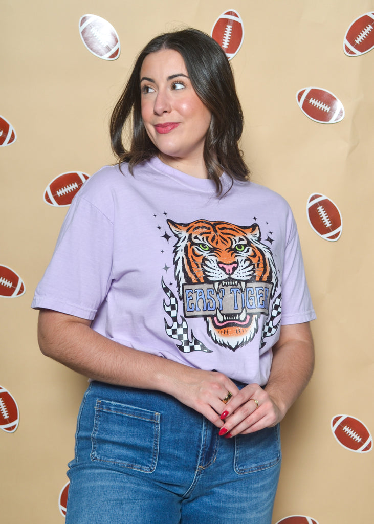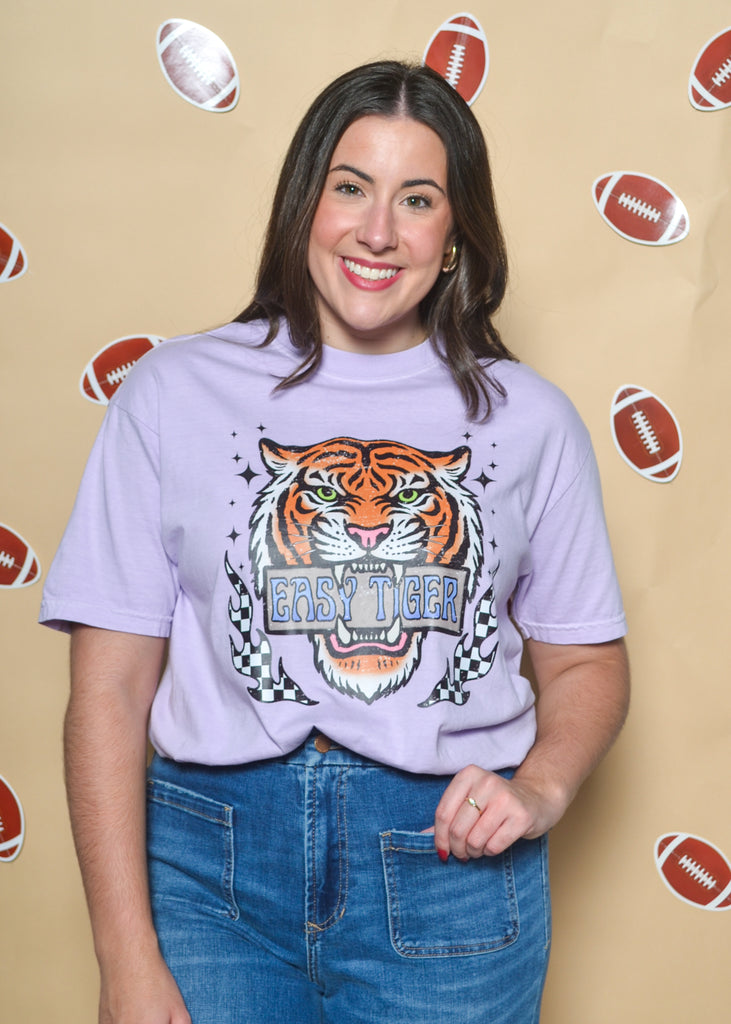 Make a bold statement on gameday with the Easy Tiger Graphic Tee. Featuring a fierce tiger graphic with “Easy Tiger” lettering and checkerboard accents, this lavender tee brings vintage vibes with a modern twist. Pair it with denim shorts or a skirt for an effortless LSU gameday look.