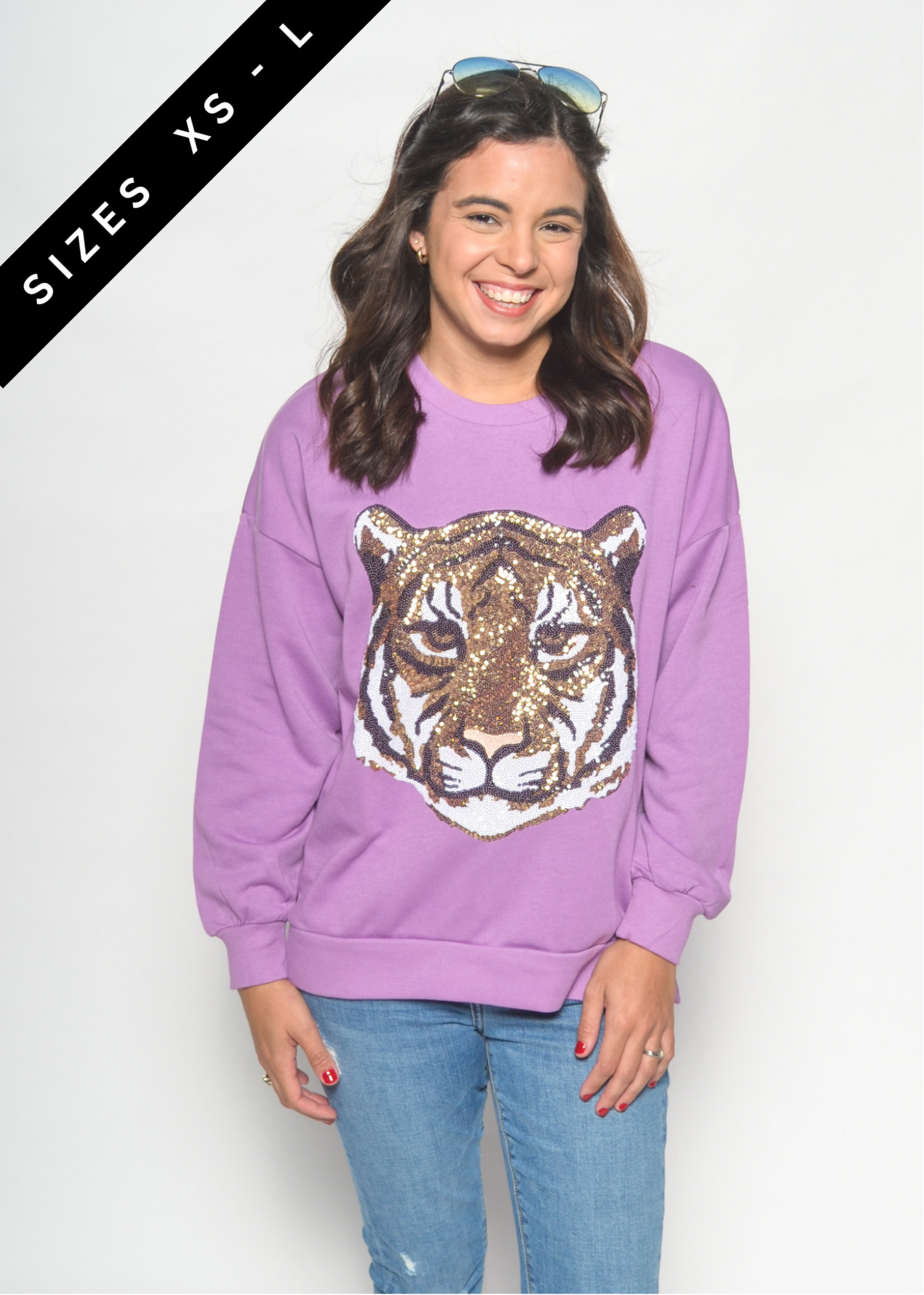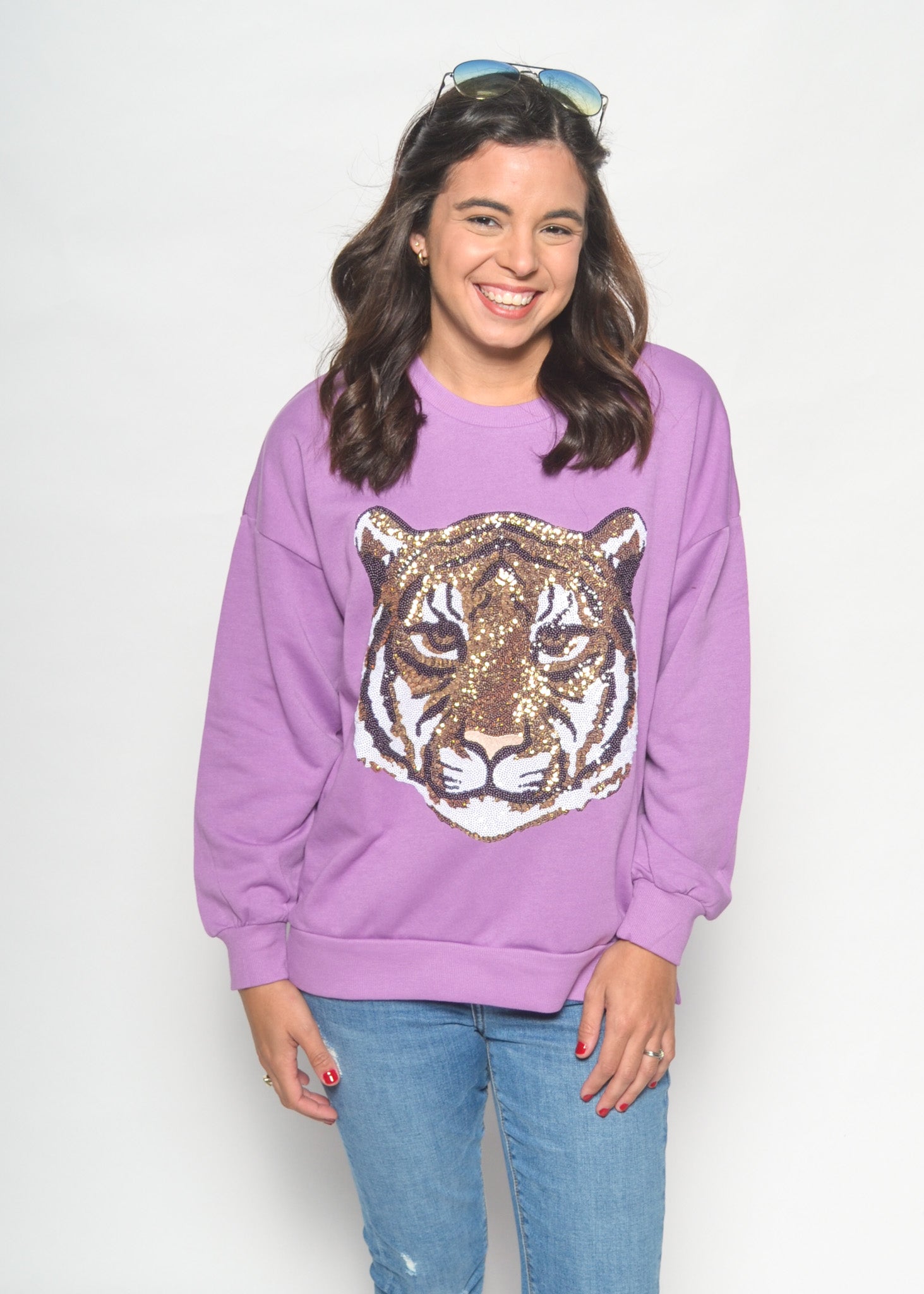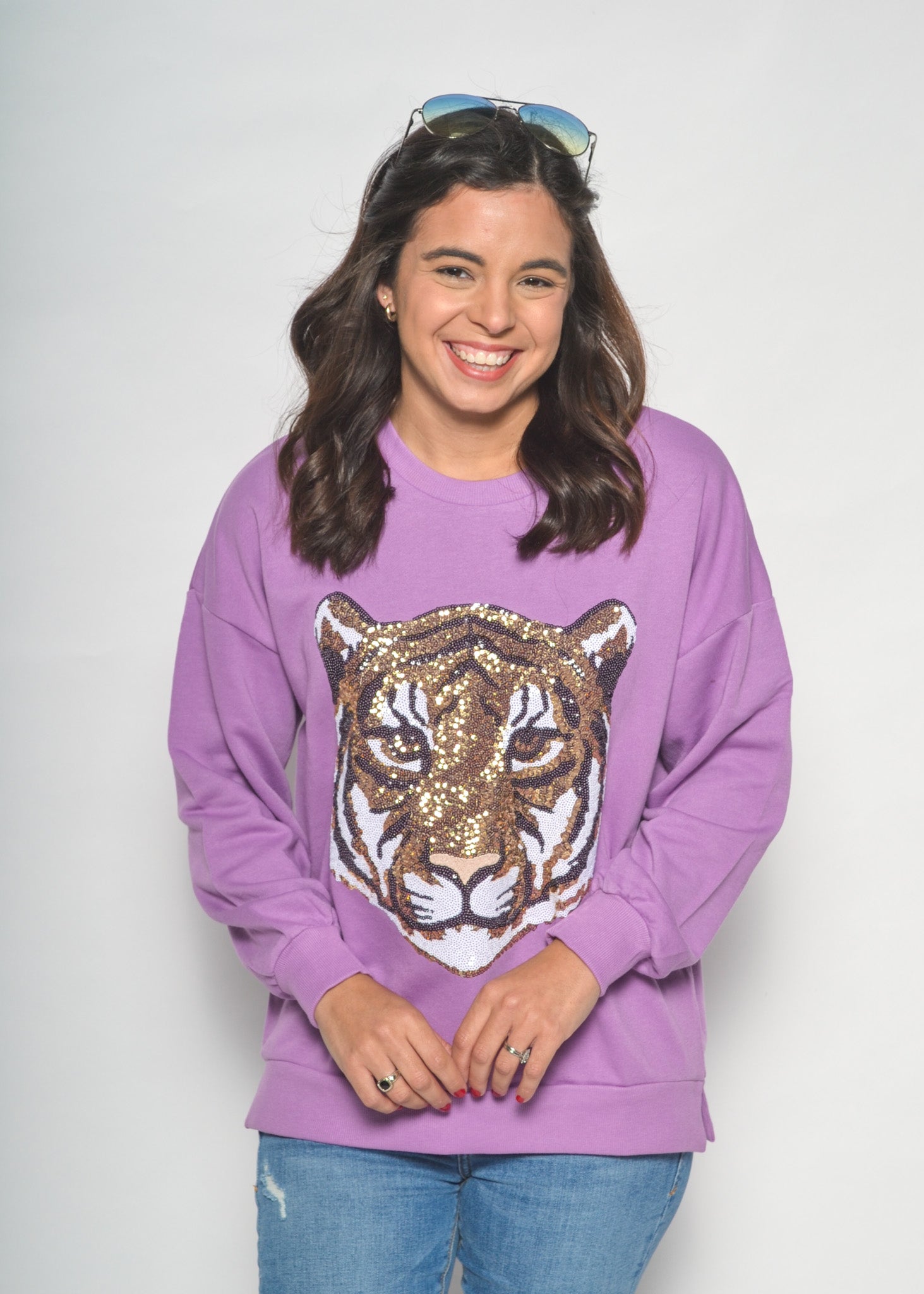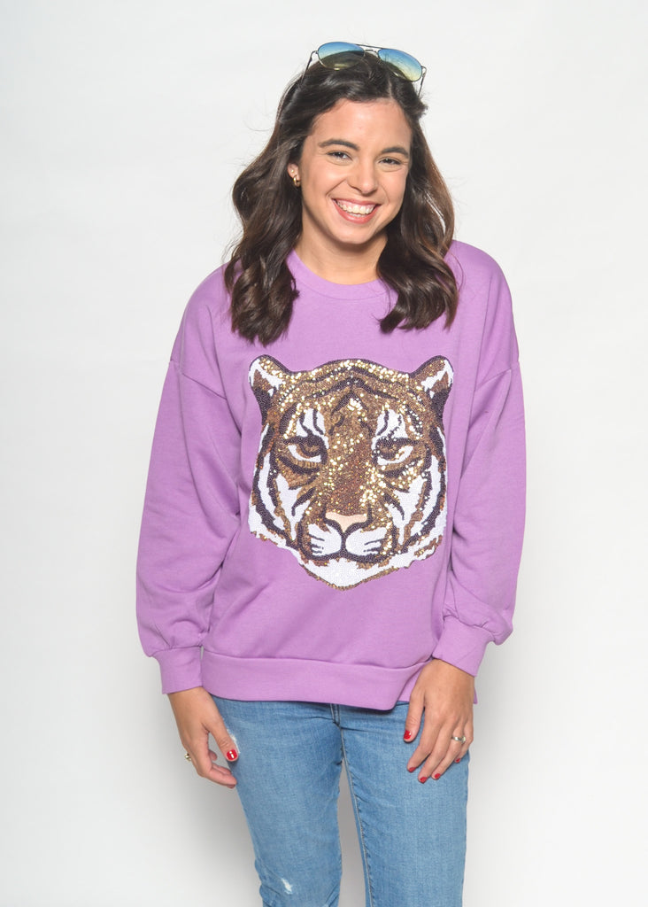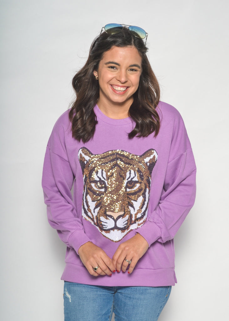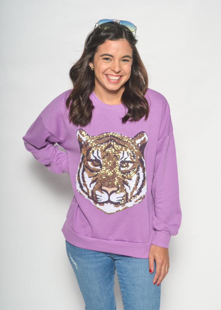 Make a bold gameday statement with the Golden Tiger Sequin Sweatshirt. Featuring a fierce tiger head crafted from shimmering gold sequins, this cozy lavender sweatshirt is the perfect mix of comfy and eye-catching. Dress it up with leather shorts and boots or keep it casual with denim for tailgates and beyond.