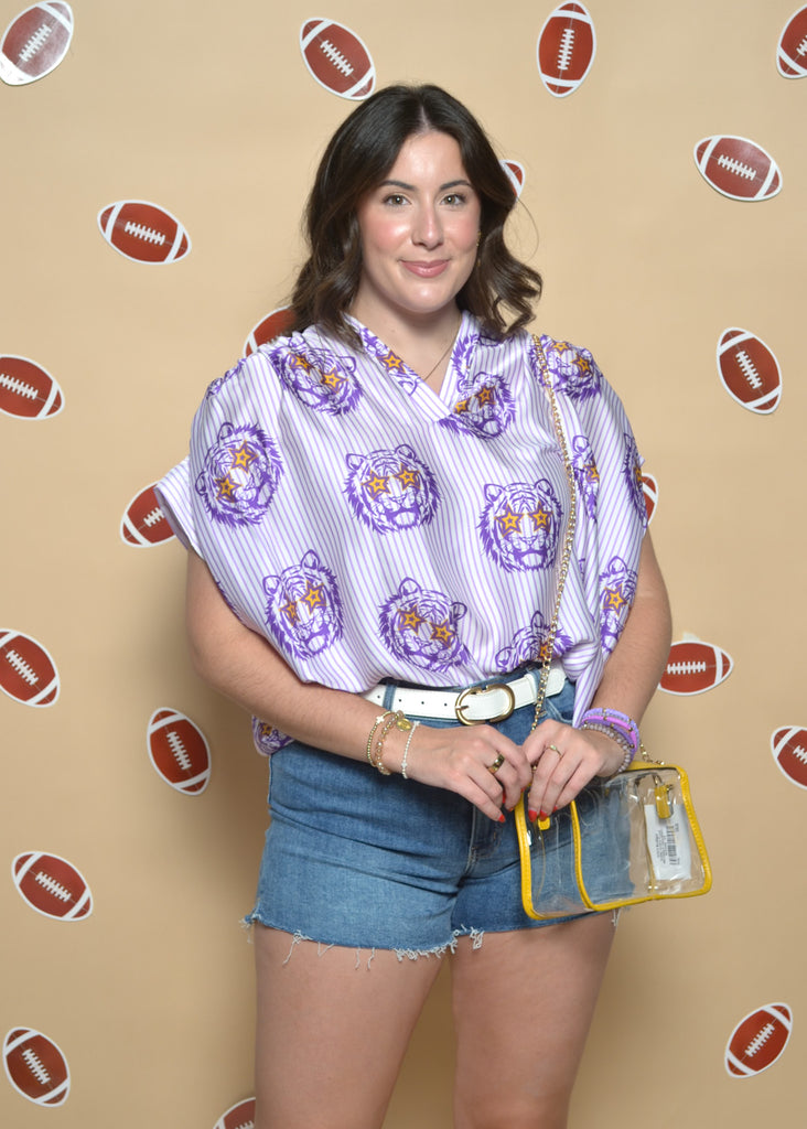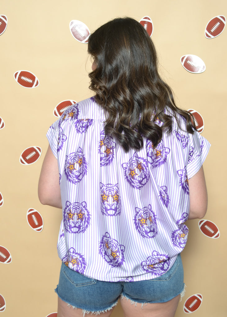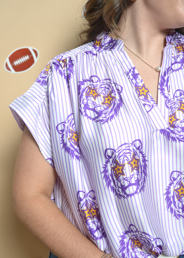 Bring the energy in this lightweight buttonless blouse featuring purple stripes and star-eyed tiger graphics. Easy to wear, hard to ignore.