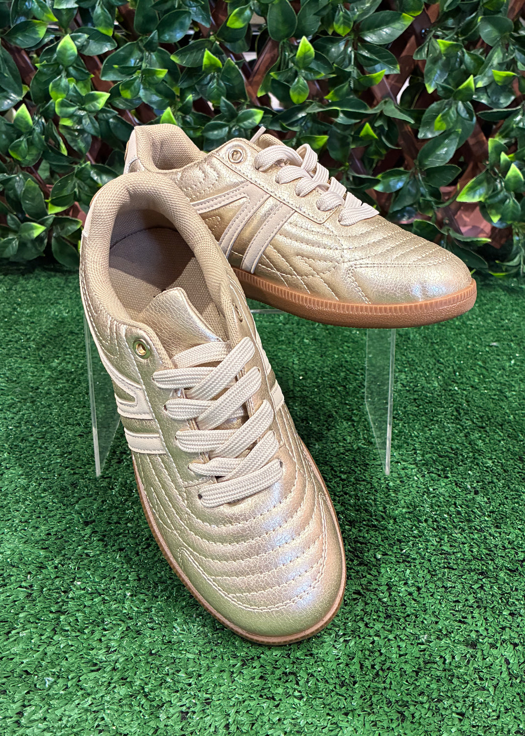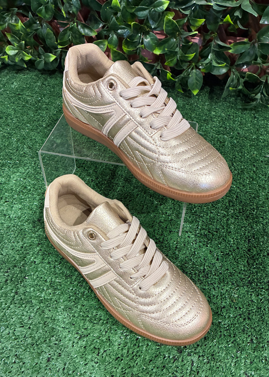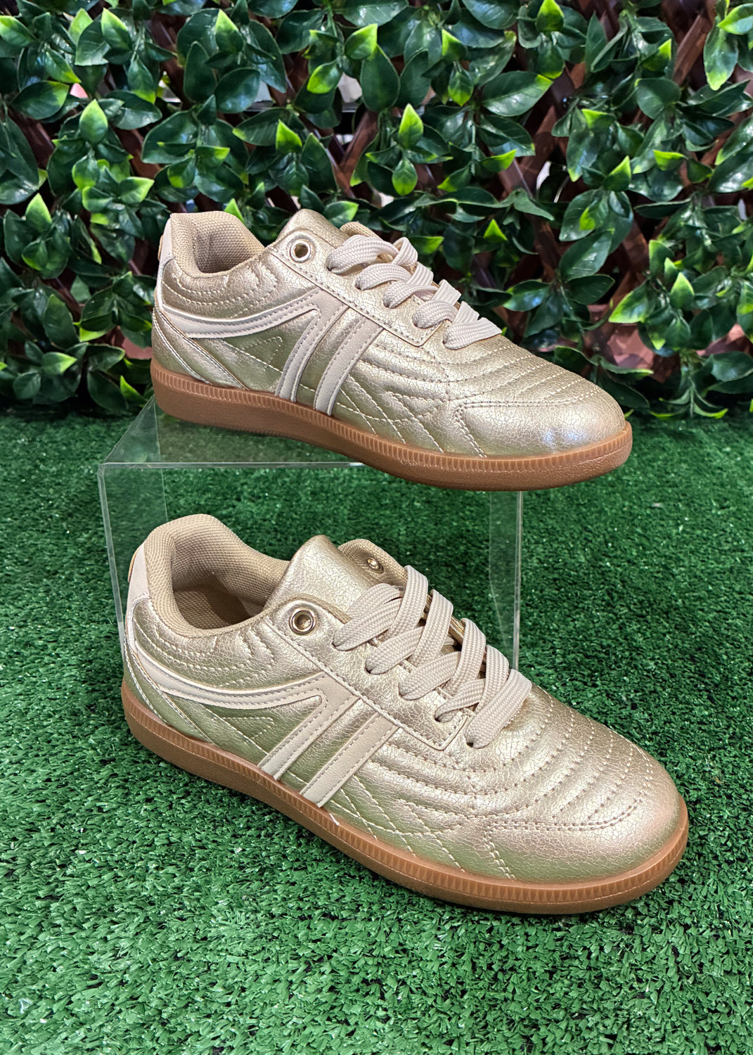 Shine a little brighter in the Golden Hour Glide Sneaker — the perfect mix of sporty and chic. With its metallic gold finish and classic court-style silhouette, this sneaker instantly elevates your everyday outfits while keeping things comfy and casual.