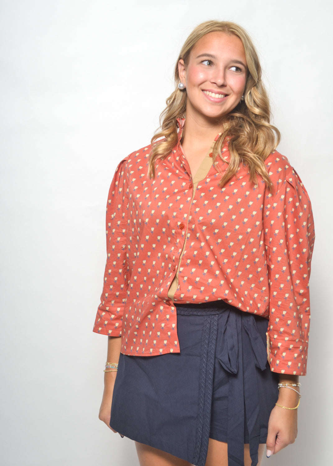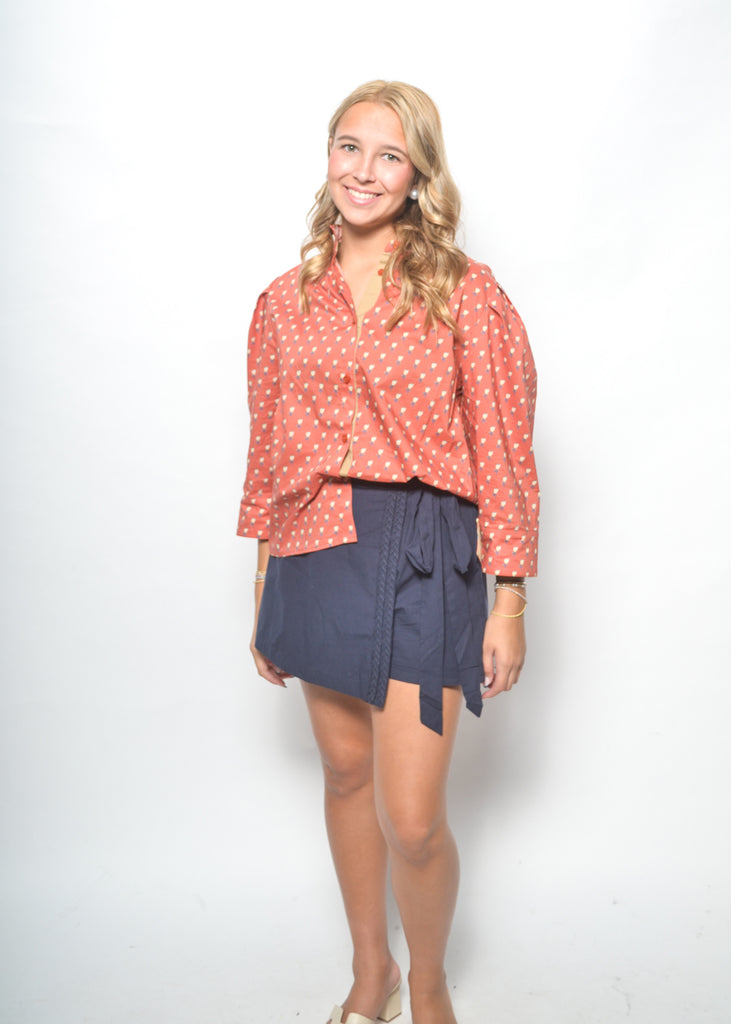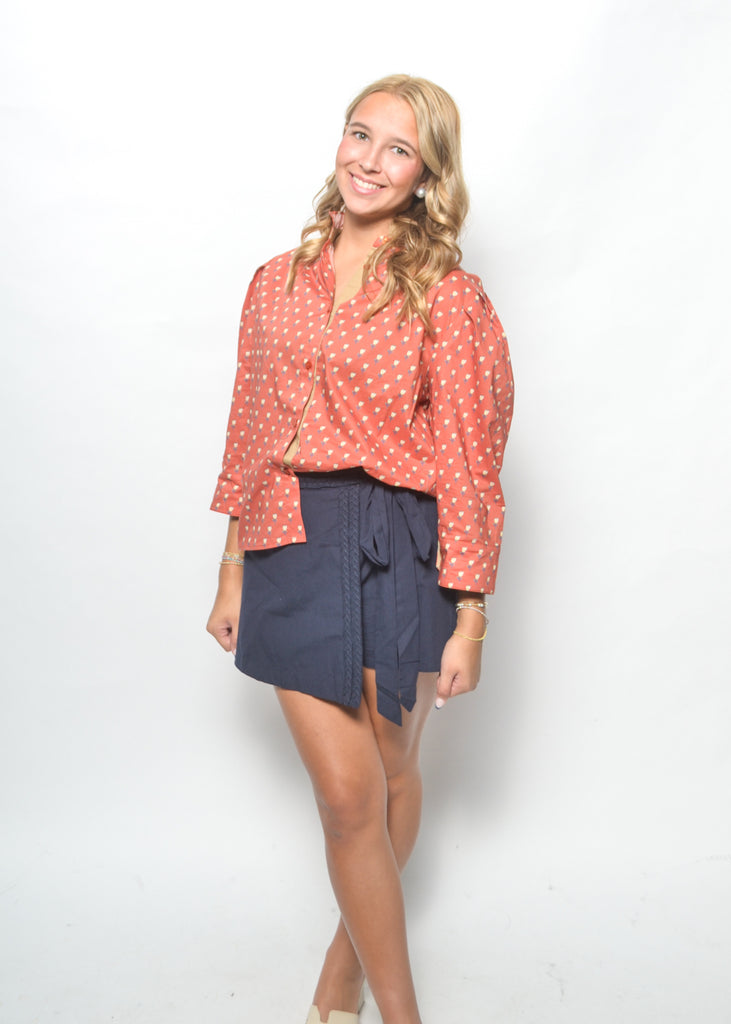 Playful prints meet timeless charm in The Falling Petals Top. This lightweight button-down features a warm rust base with a dainty floral print, making it perfect for transitioning seasons. Designed with subtle puff sleeves and a relaxed fit, it’s an easy piece to dress up for work or style casually with denim or skirts.