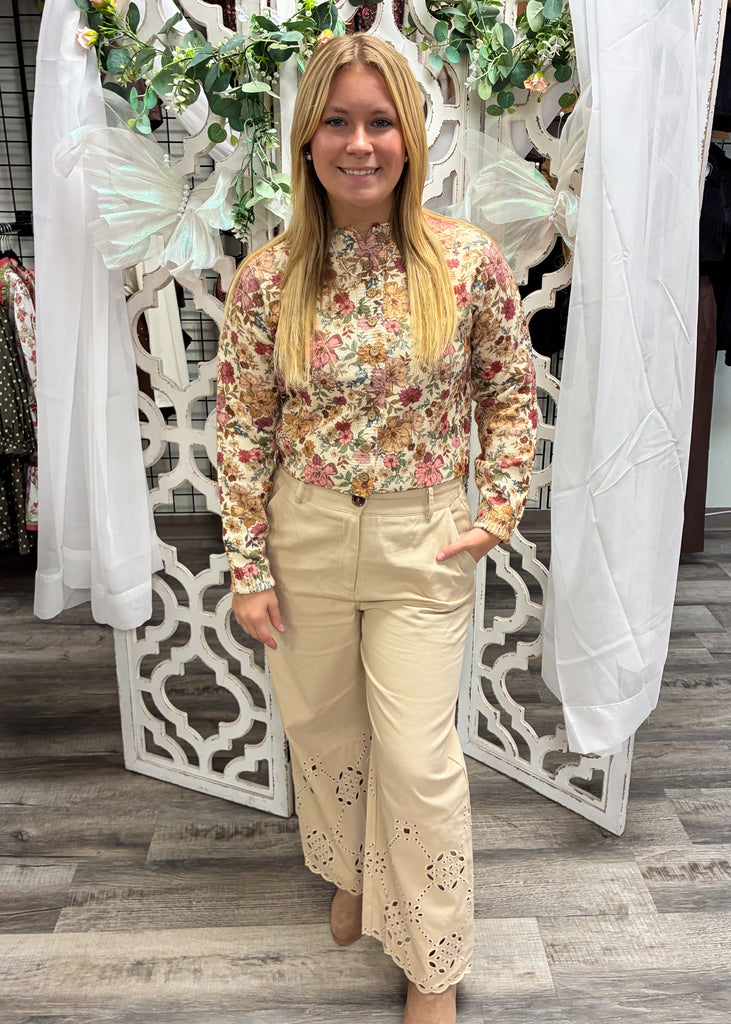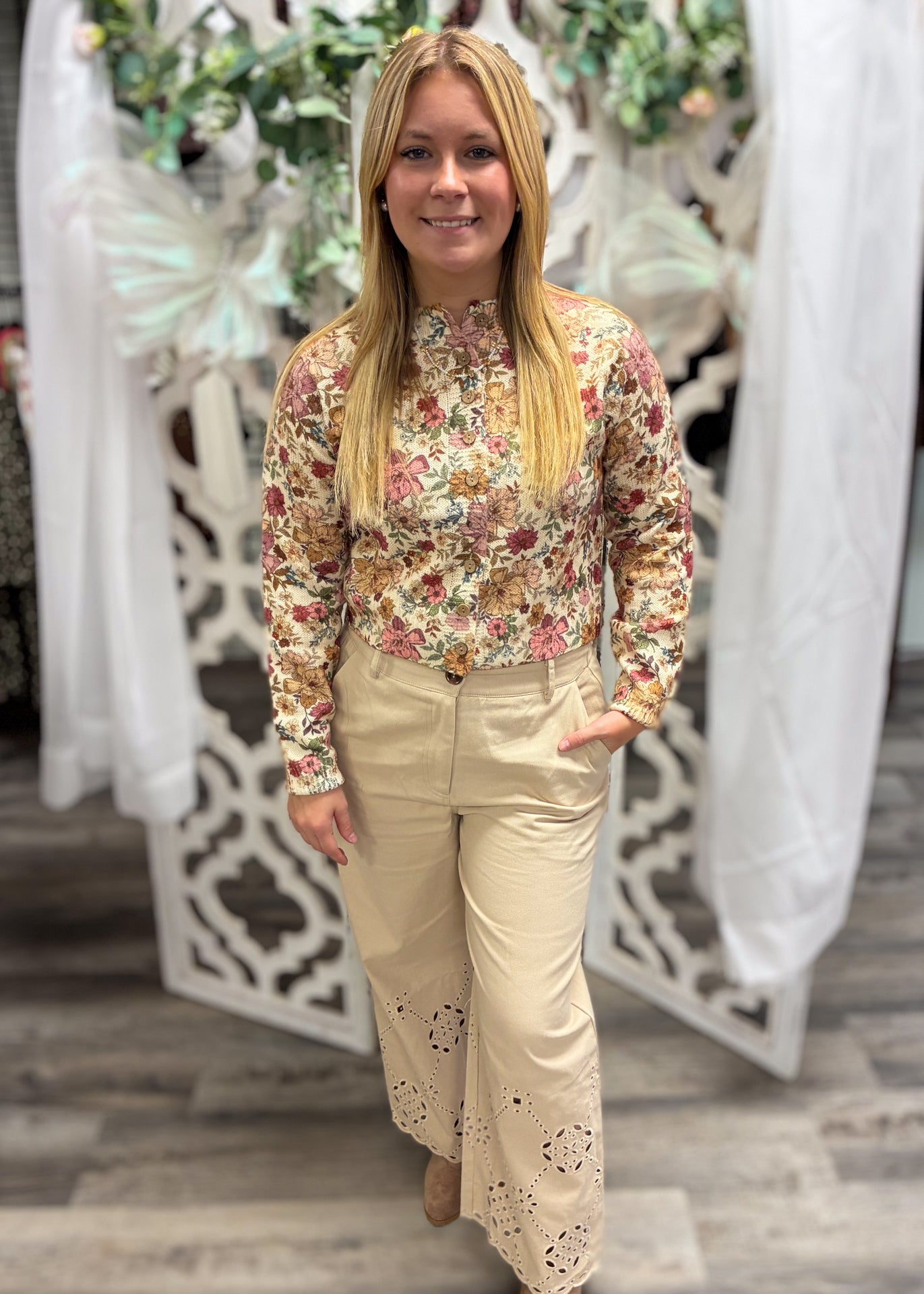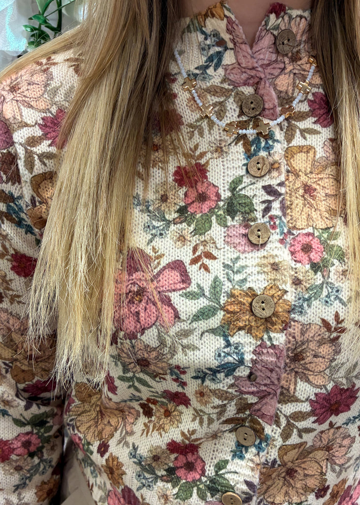 The Autumn Garden Button Knit Top brings warm, vintage-inspired charm to your everyday style. Made with a soft, textured waffle knit, this long-sleeve top features a full button front and an all-over floral print in rich fall tones—think rose, ochre, moss, and berry. The fit is easy and comfortable, perfect for pairing with denim, corduroy, or wide-leg trousers for a cozy, polished look.