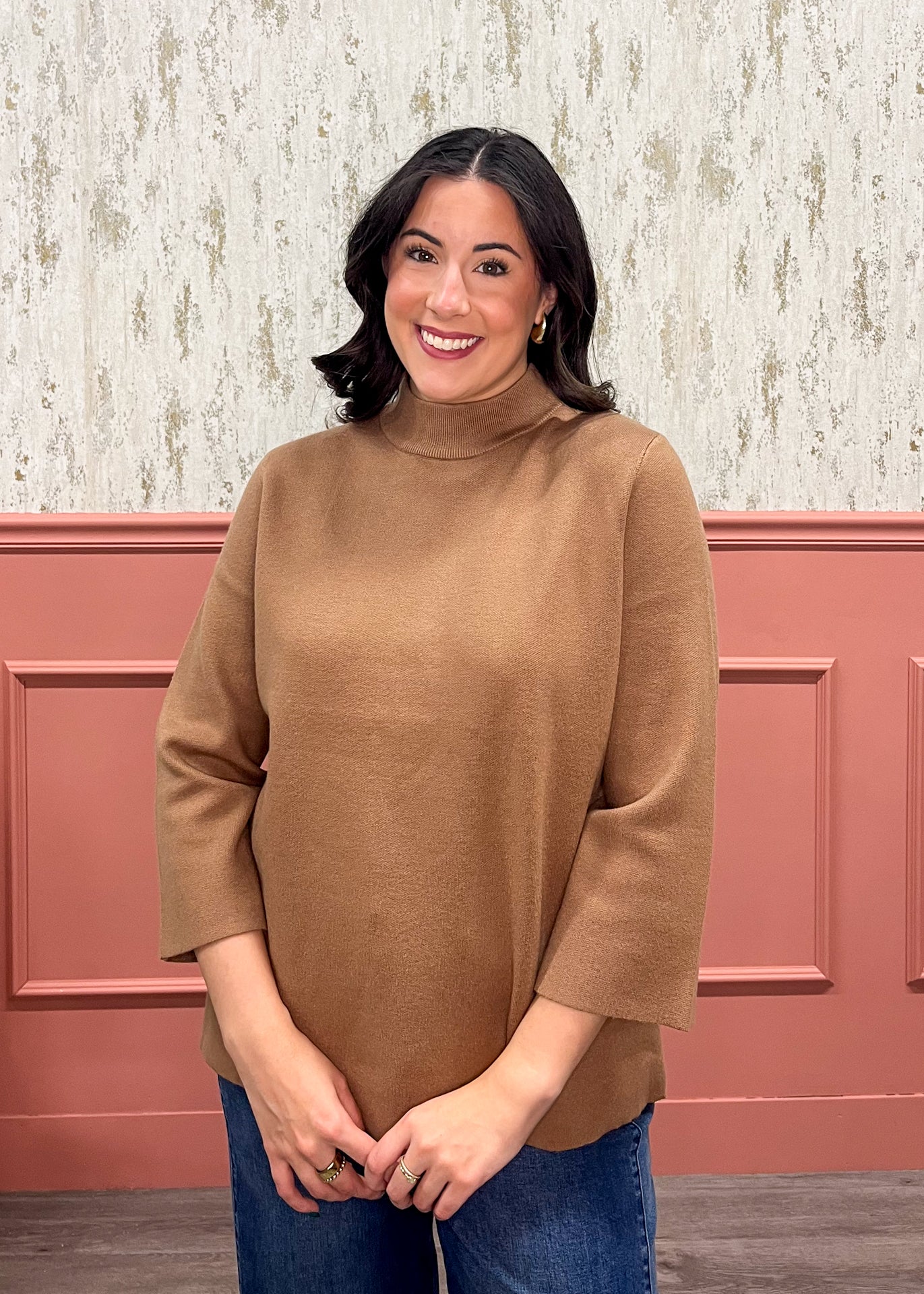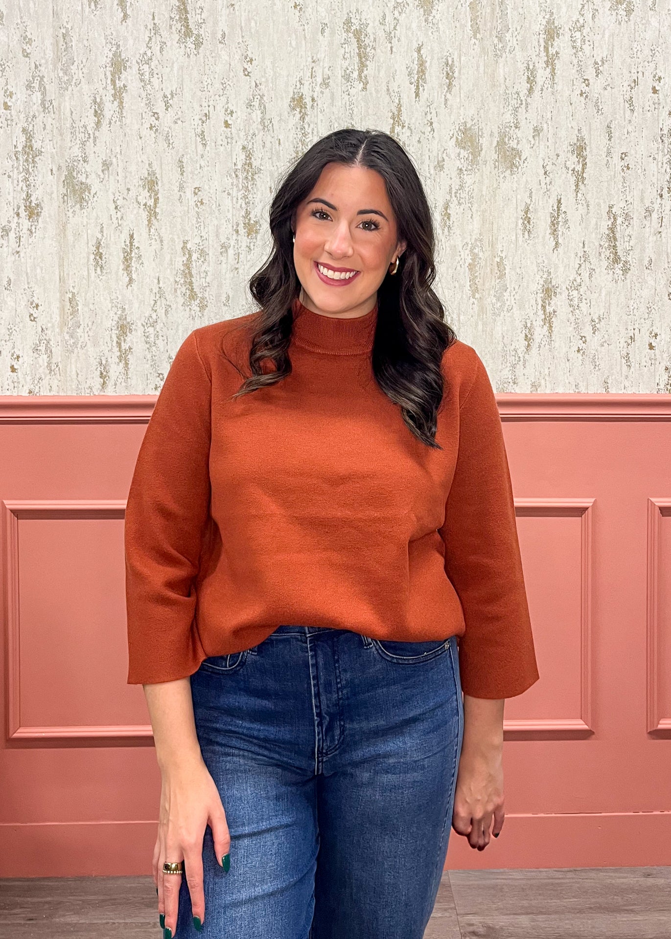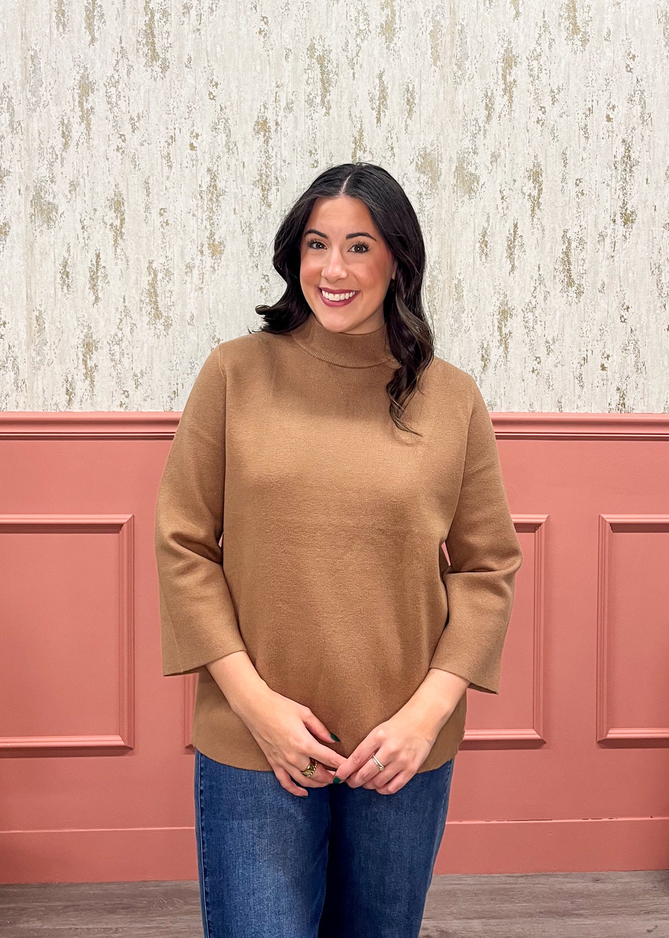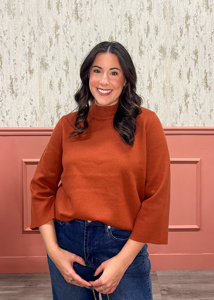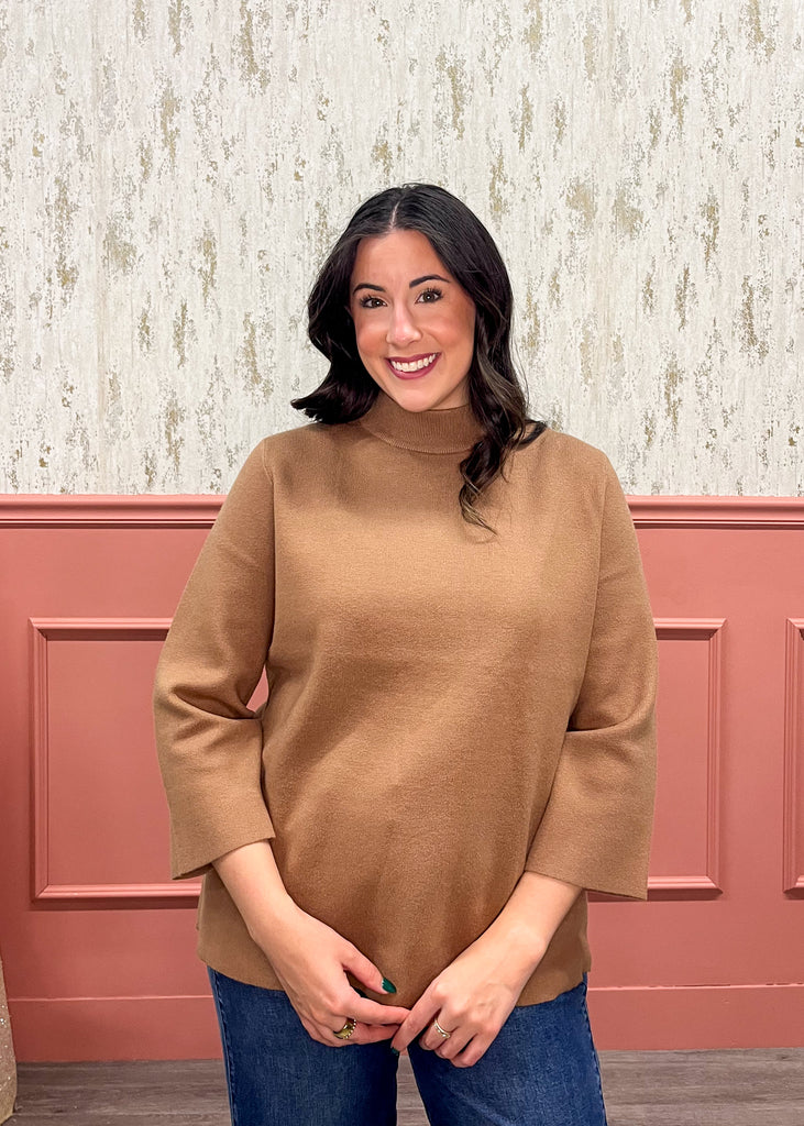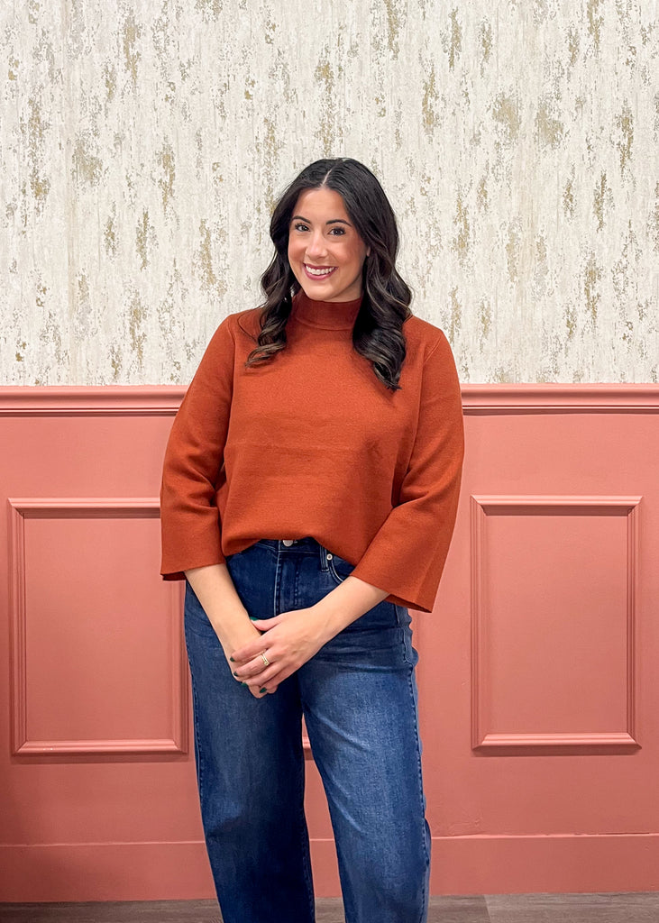 Meet your new wear-with-everything favorite — a soft, relaxed-fit sweater designed for effortless everyday style. Featuring a mock neckline, 3/4 bell sleeves, and a flattering straight silhouette, this lightweight knit pairs perfectly with denim, work pants, and all your fall layers. Available in five versatile colors, it’s the staple you’ll reach for again and again.