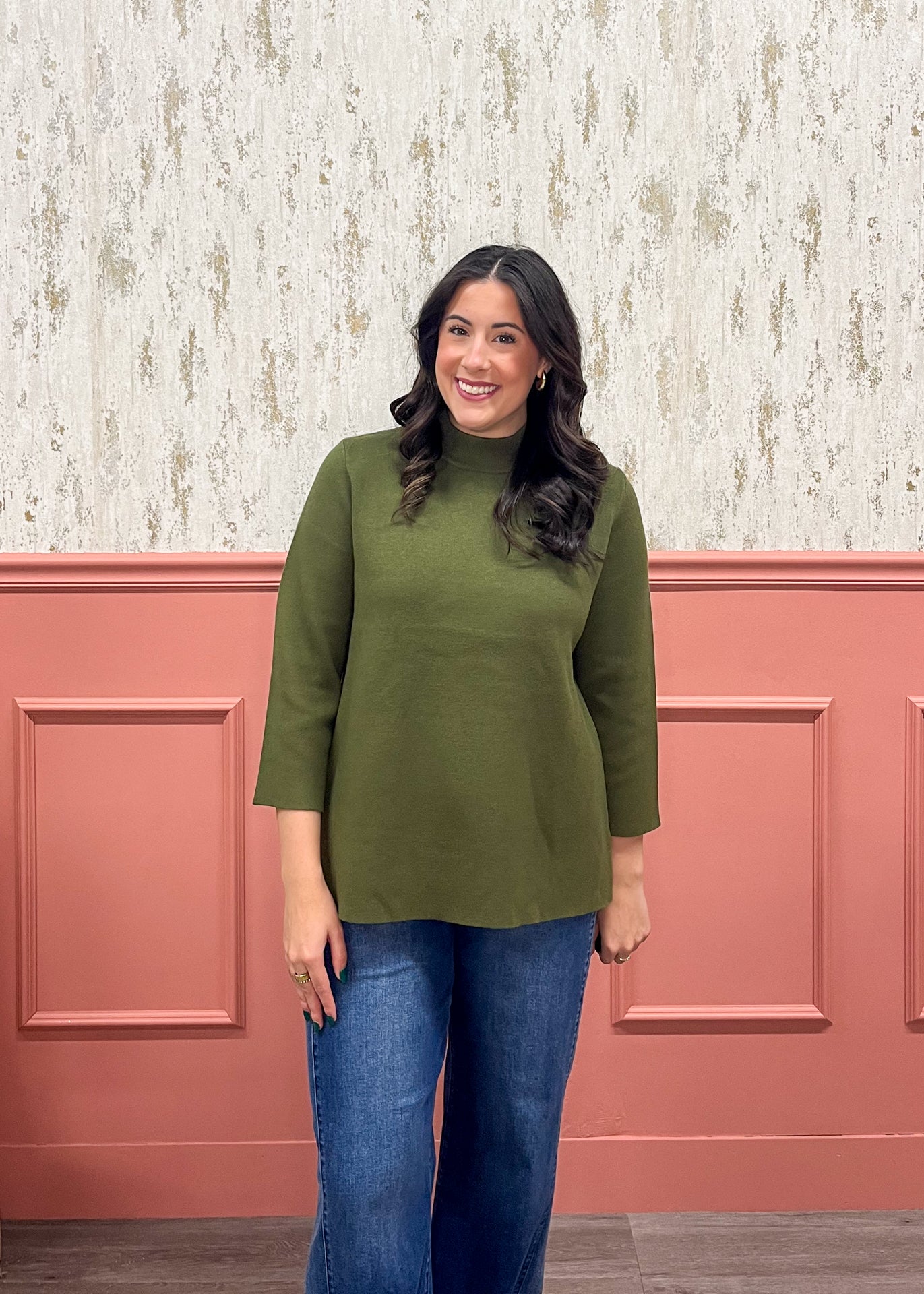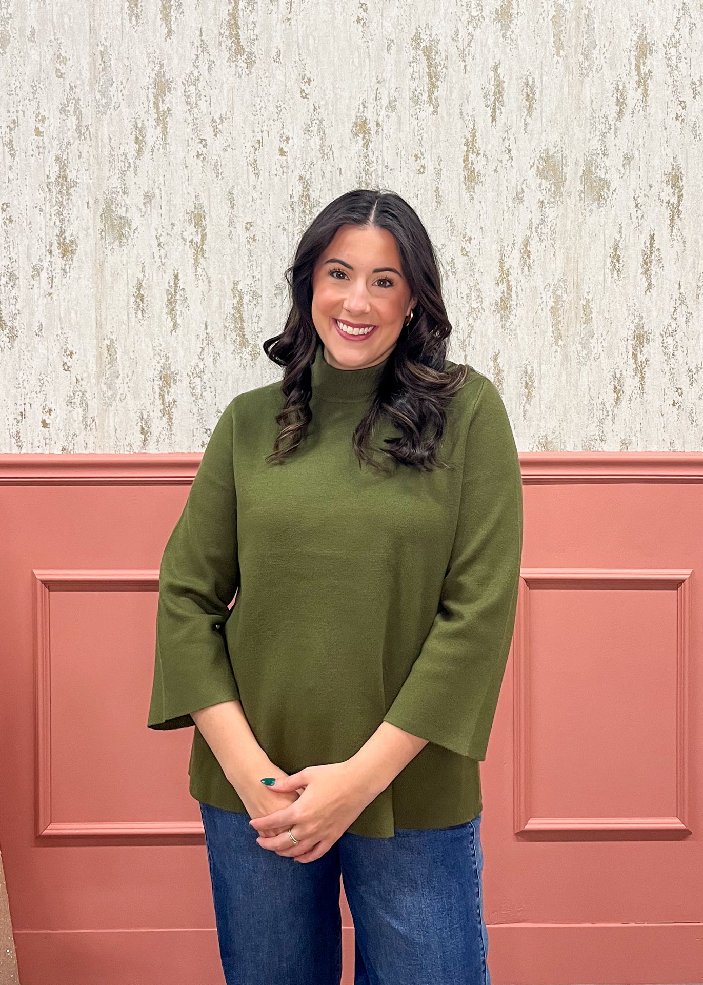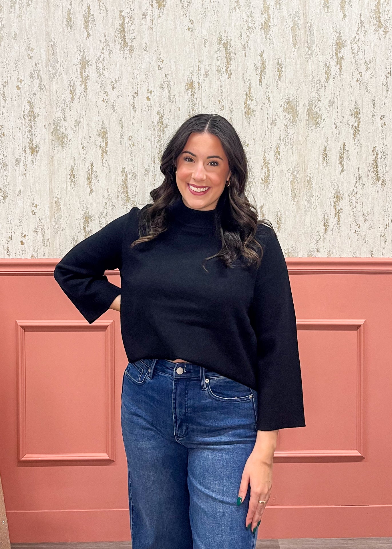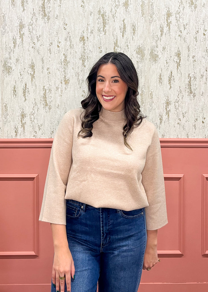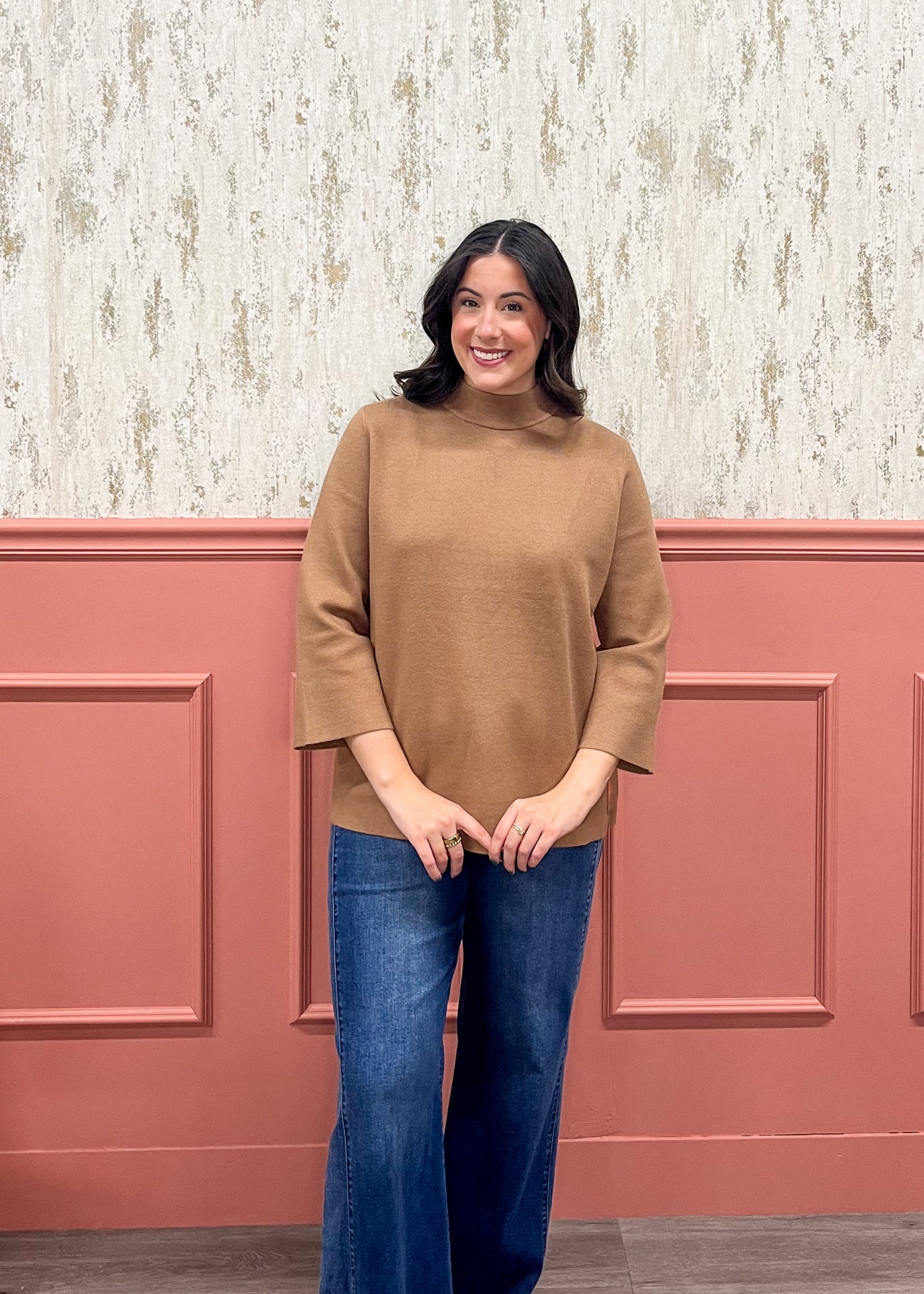 Meet your new wear-with-everything favorite — a soft, relaxed-fit sweater designed for effortless everyday style. Featuring a mock neckline, 3/4 bell sleeves, and a flattering straight silhouette, this lightweight knit pairs perfectly with denim, work pants, and all your fall layers. Available in five versatile colors, it’s the staple you’ll reach for again and again.