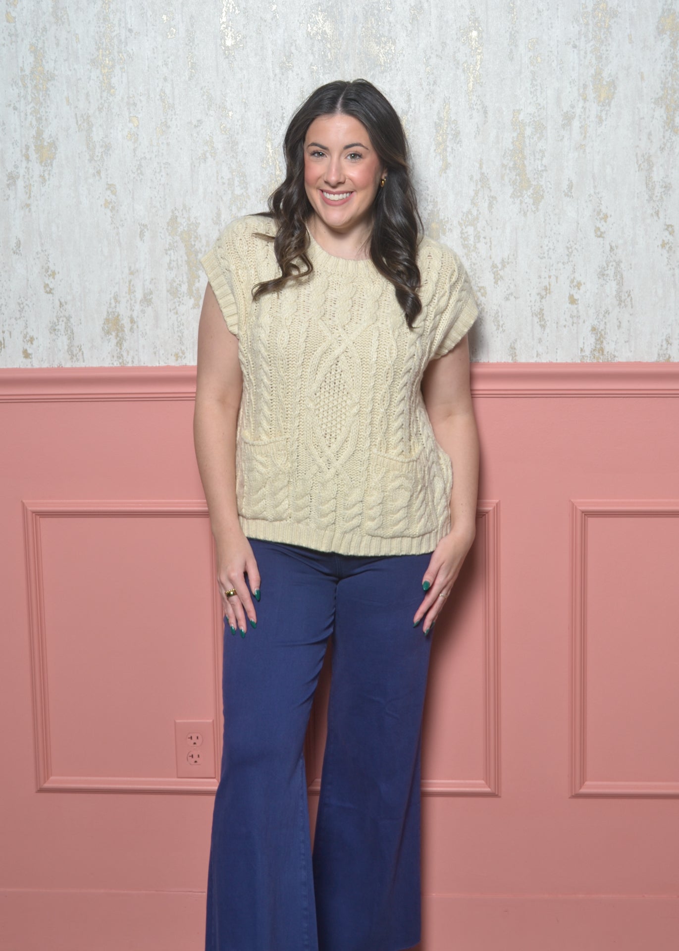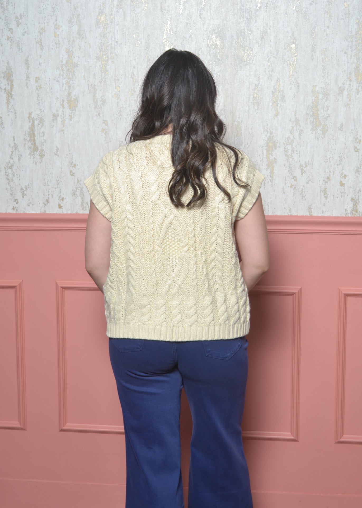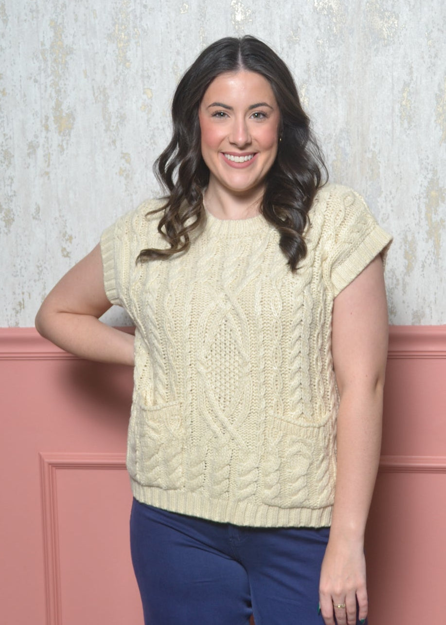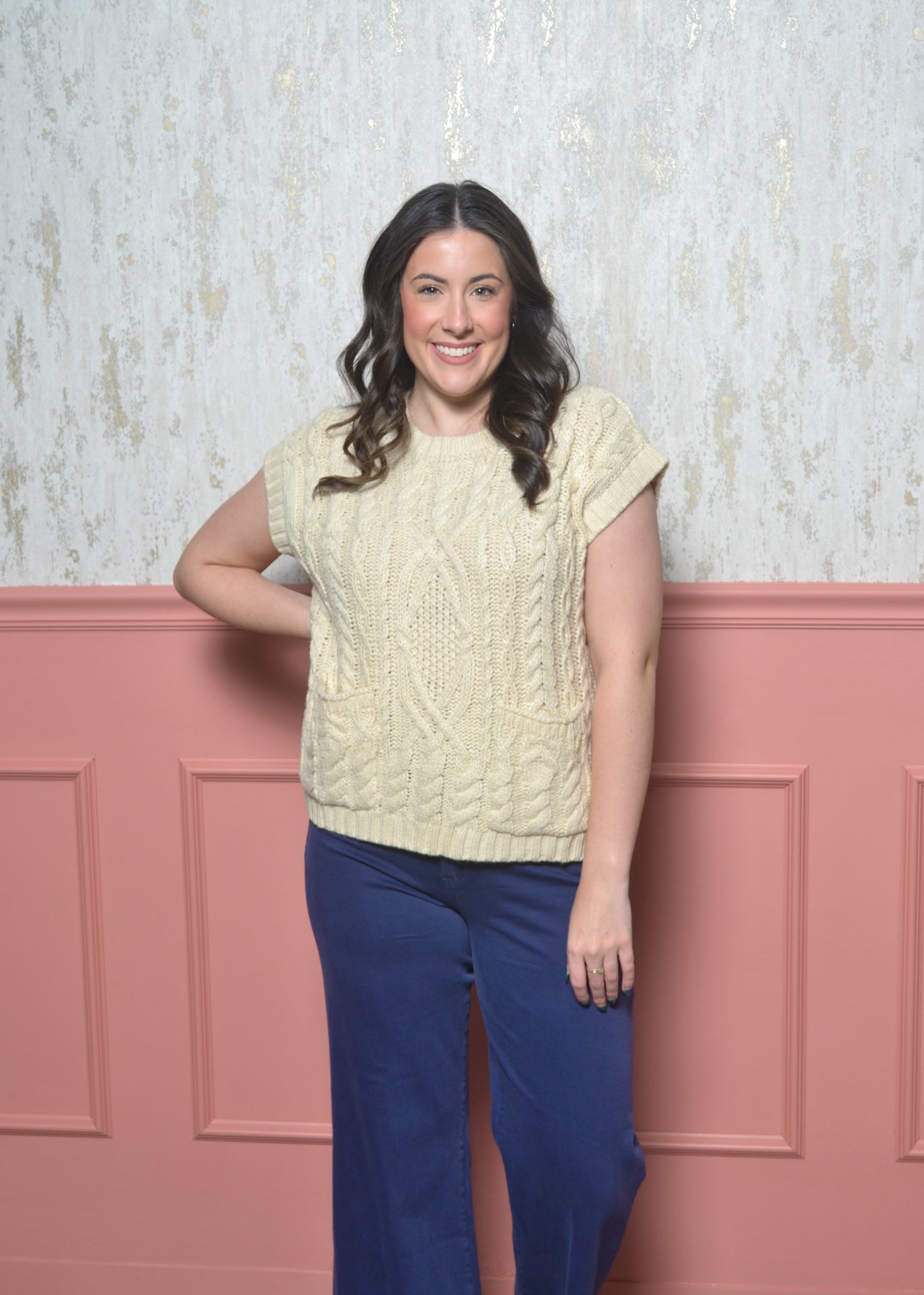 A classic cable knit with a modern twist — this cozy cream sweater vest is the perfect layering piece for cool days. Soft, stylish, and easy to pair with denim, blouses, or long sleeves, it adds instant texture and charm to any outfit.