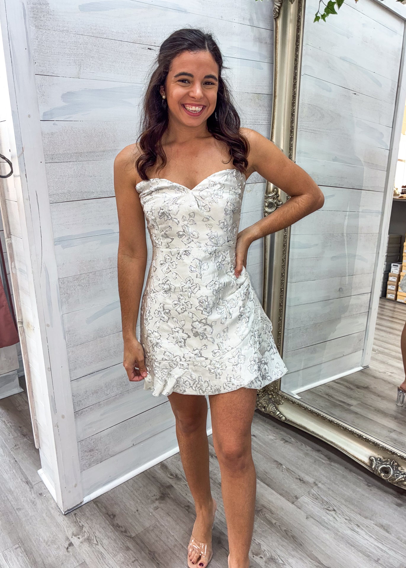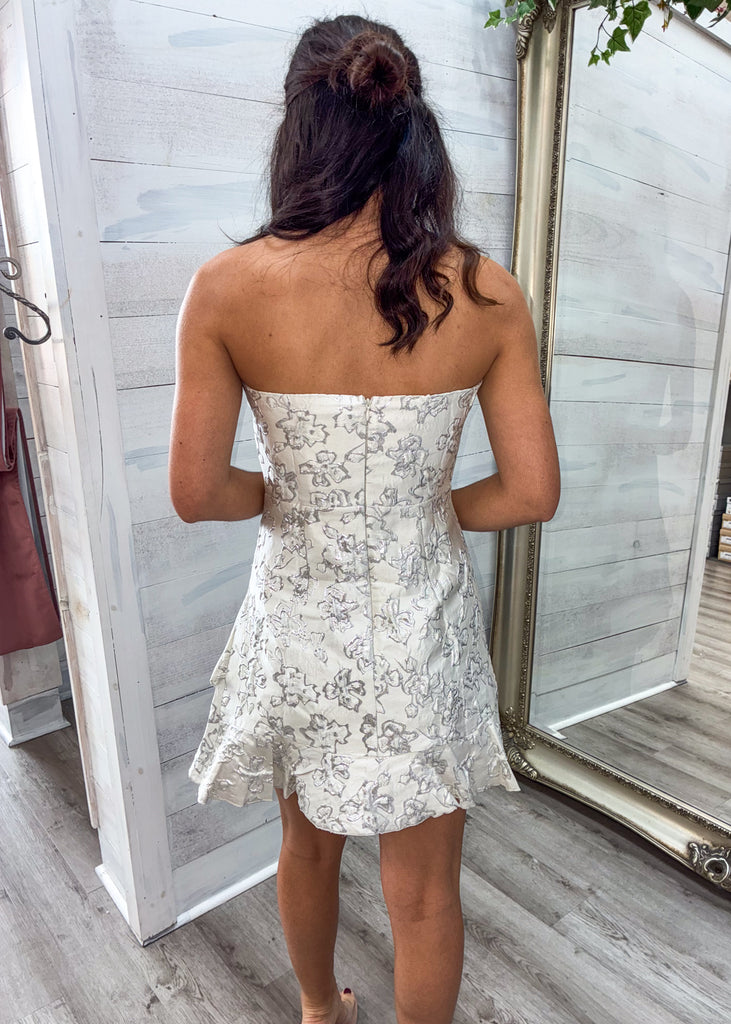 Our Frosted Petal Mini Dress brings the prettiest winter-white moment to your holiday events. This strapless mini features a sweetheart neckline and a metallic silver floral jacquard that catches the light beautifully. The fit-and-flare silhouette gives you a flattering shape, and the subtle ruffle hem adds a soft, feminine touch. Perfect for parties, photos, and special celebrations.