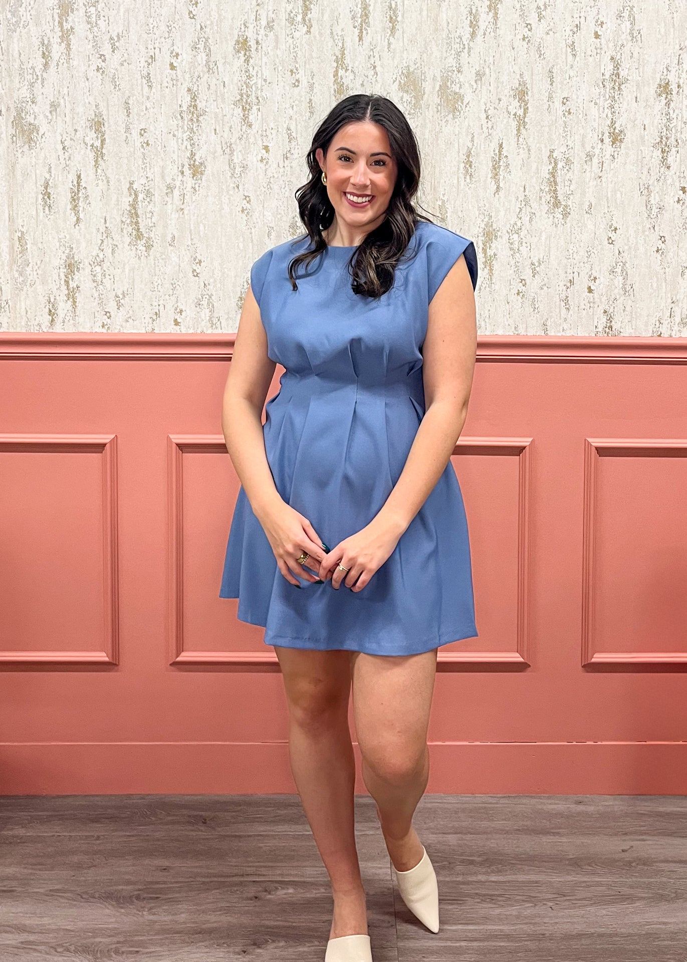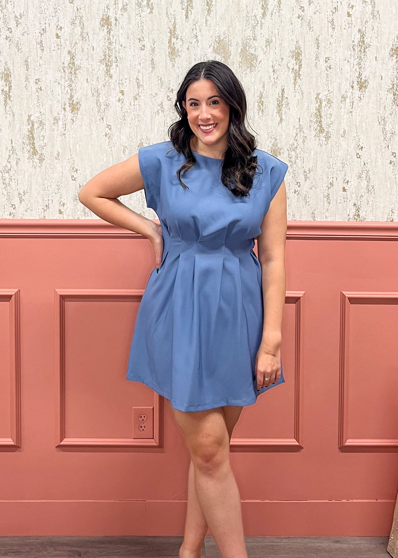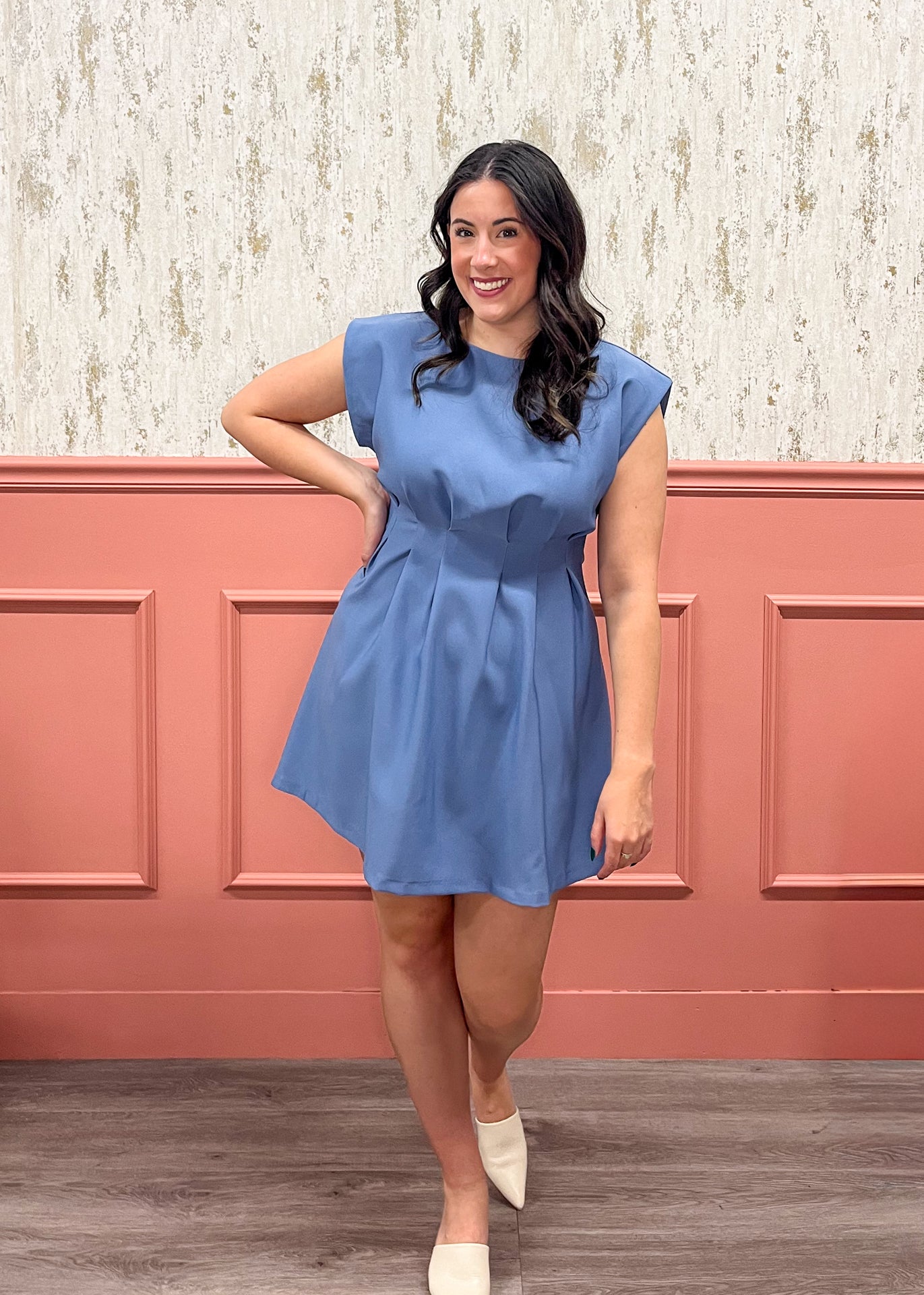 Clean lines and a beautifully structured fit make this slate-blue mini dress a true standout. With soft pleating and modern cap sleeves, it’s the perfect elevated look for dinners, events, and dressed-up days.