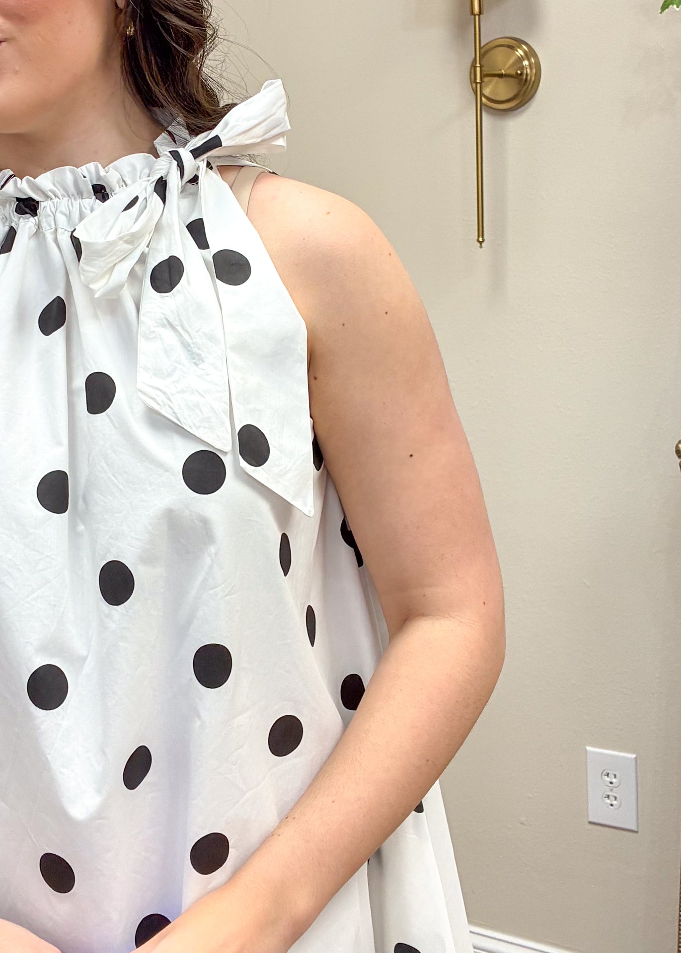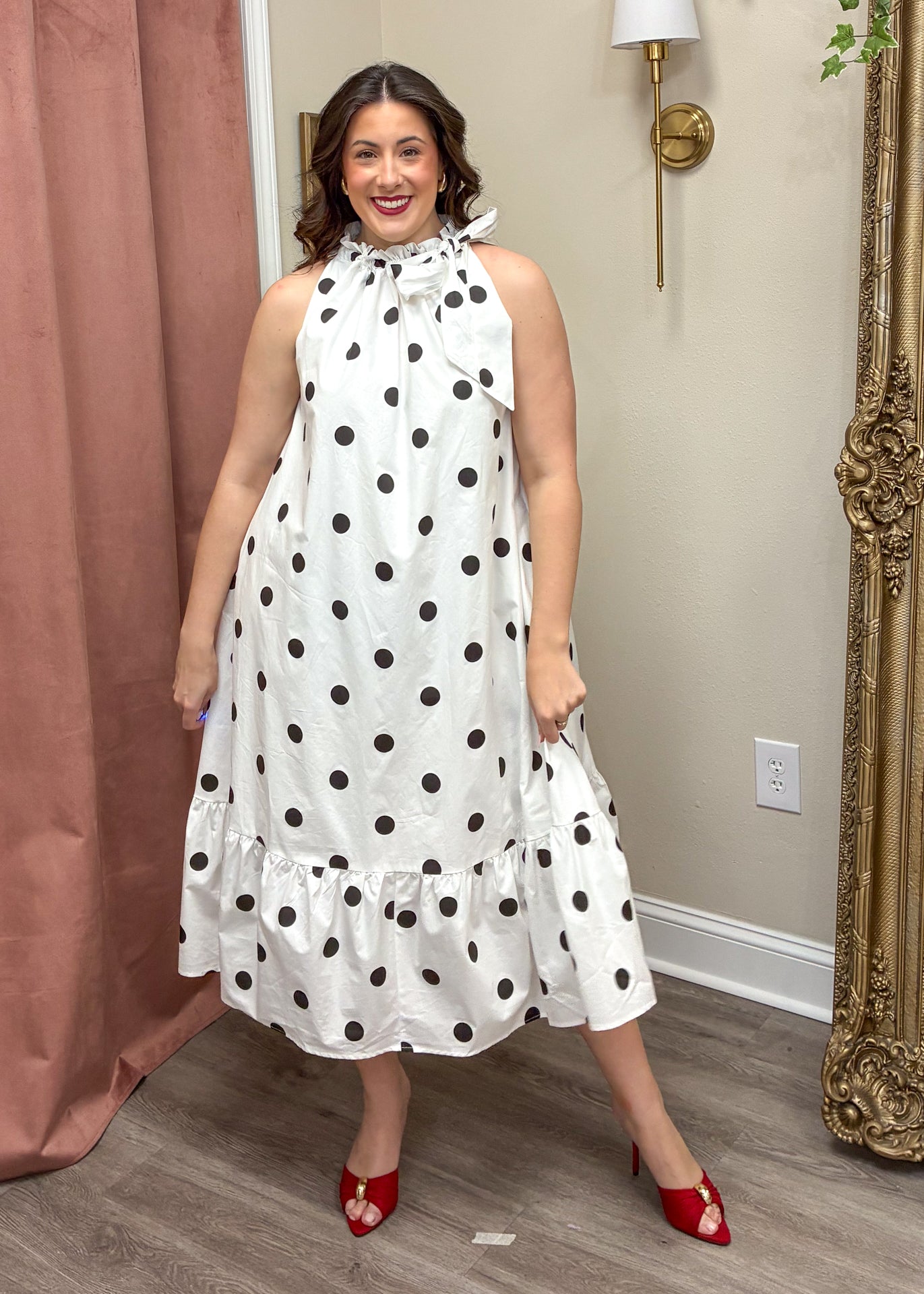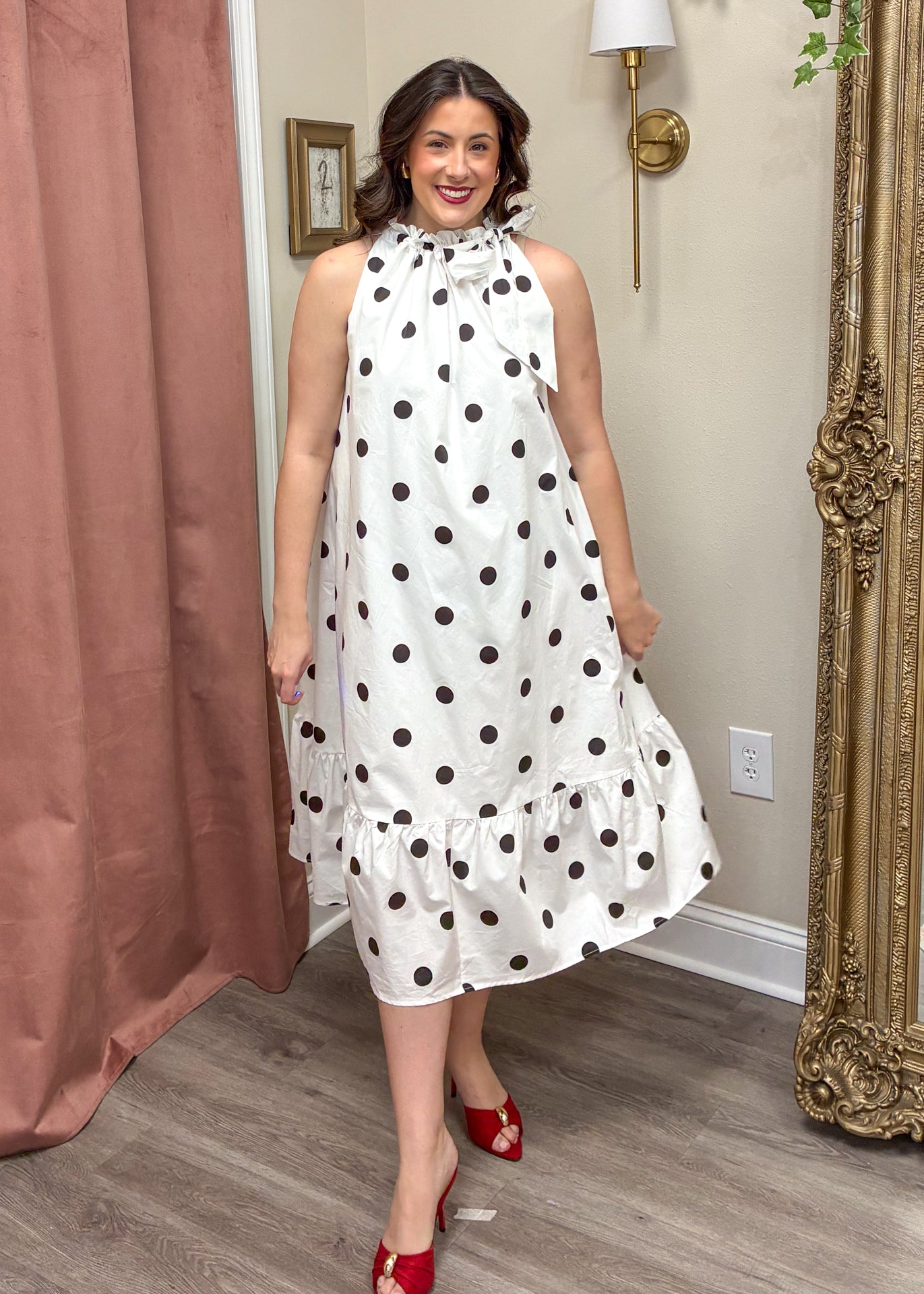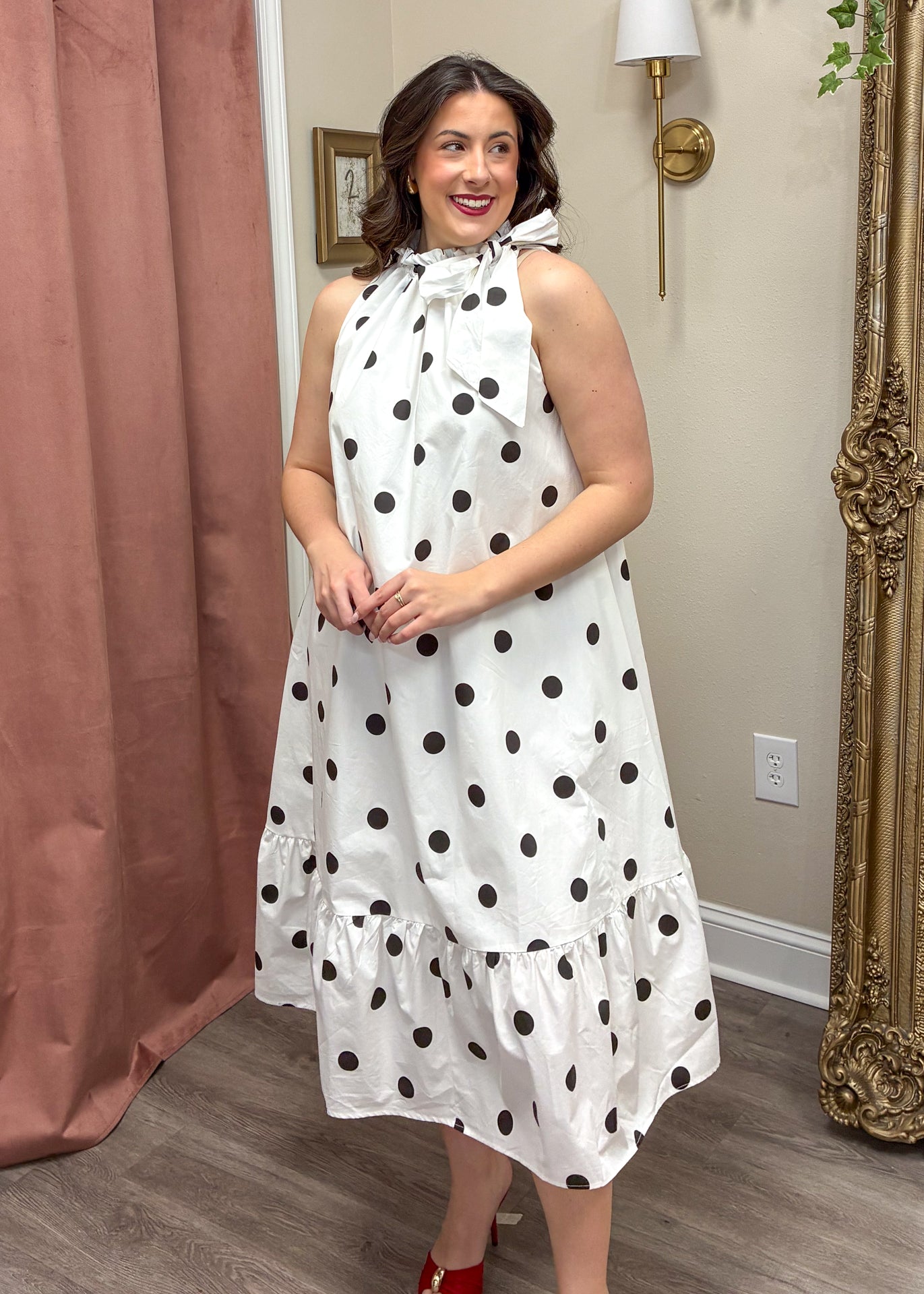 Playful and classic, this polka dot dress brings the perfect touch of charm to your Valentine’s wardrobe. Featuring a high ruffled neckline with a bow-tie detail and a flowy tiered silhouette, it’s an easy, flattering choice for date nights, parties, or festive celebrations.