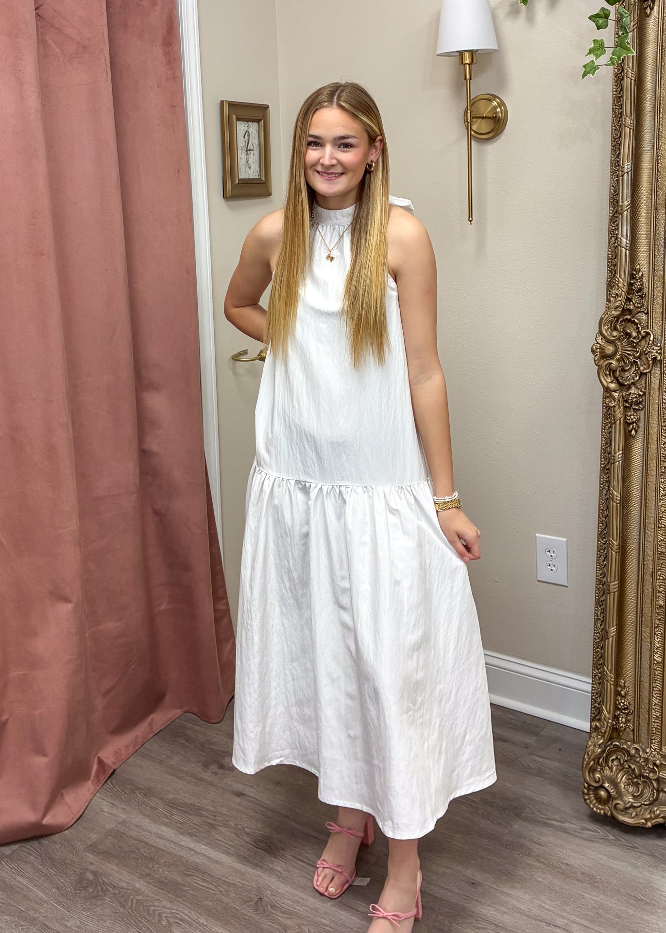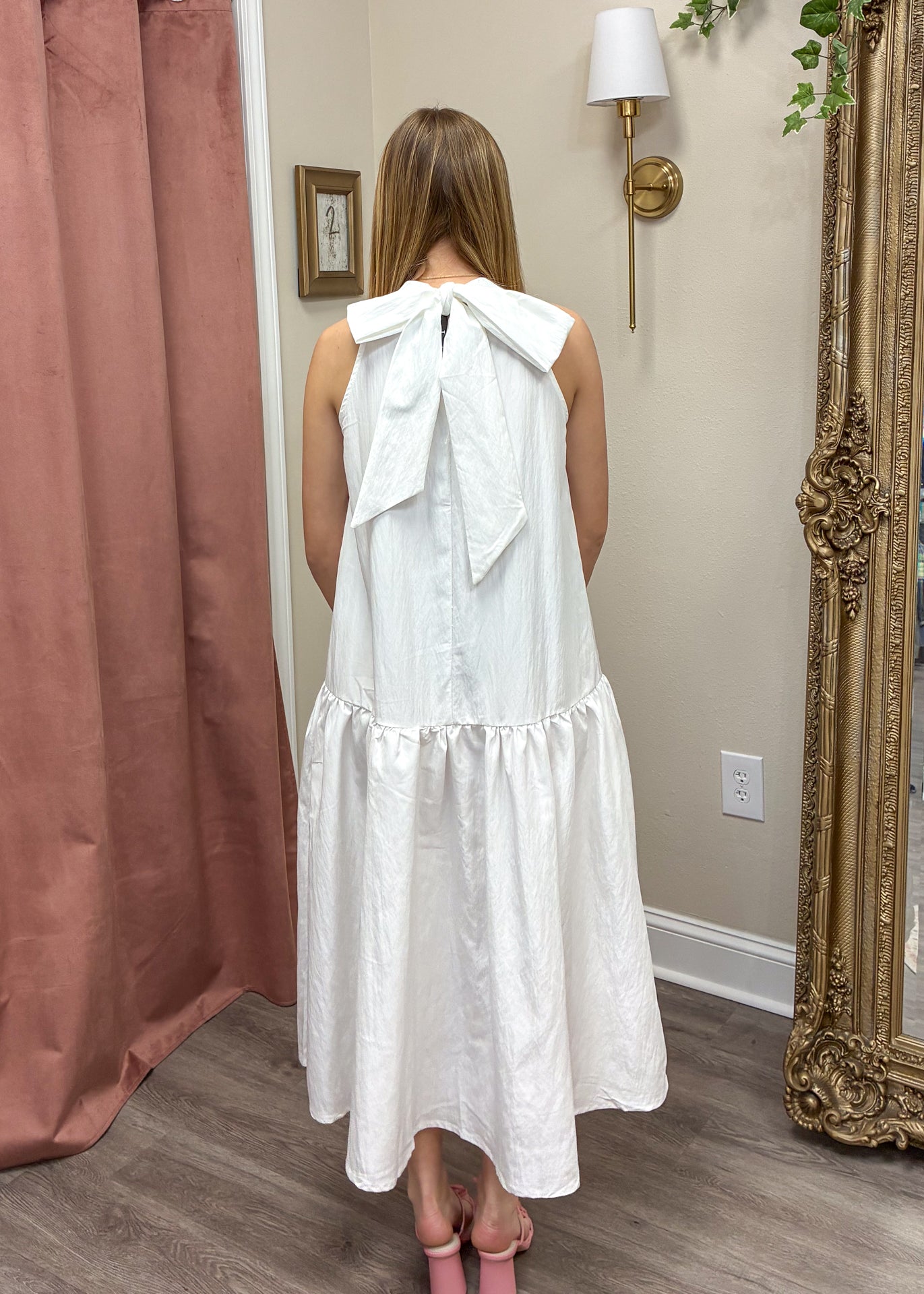 Effortless and elegant, this sleeveless midi dress features a relaxed silhouette with a statement bow detail at the back for a soft, feminine finish. Lightweight and flowy, it’s perfect for Valentine’s plans, spring events, or everyday polished wear.