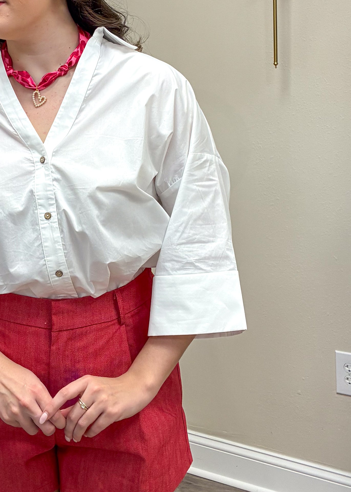 Classic with a modern twist, this crisp white button-front top features relaxed sleeves and an easy, flattering fit that transitions effortlessly from workdays to weekends. A timeless staple you’ll style again and again.