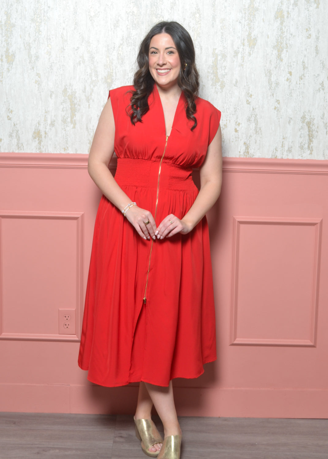Bold, confident, and effortlessly flattering, this vibrant red midi dress is made to turn heads. Designed with a smocked waist and sleek zip-front detail, it’s the perfect mix of polished and playful for date nights, events, or special occasions.