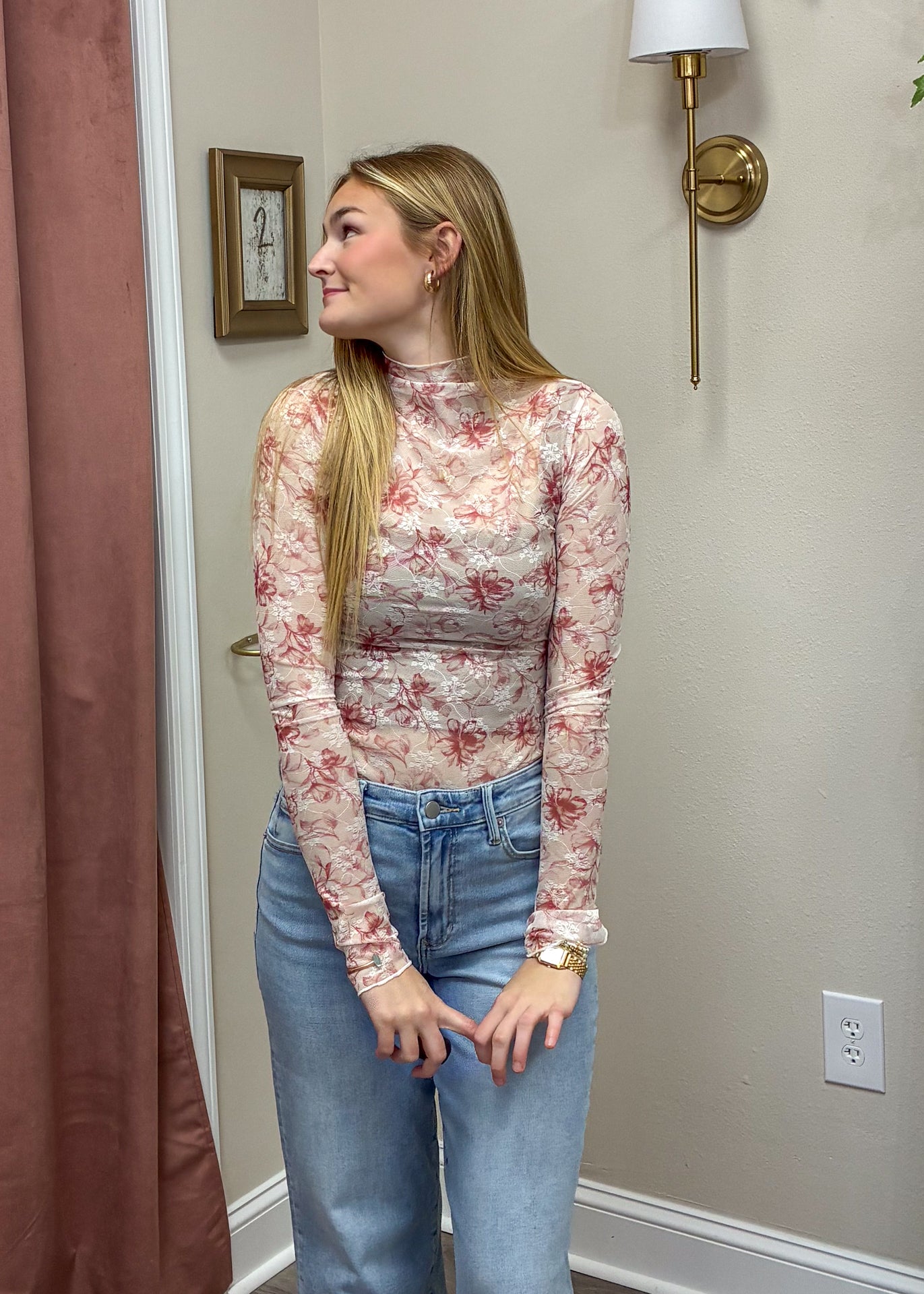 Delicate and feminine, this floral mesh top adds a romantic touch to any outfit with its sheer design and flattering fitted silhouette. Perfect for layering under jackets or wearing with your favorite denim for an effortlessly chic look.