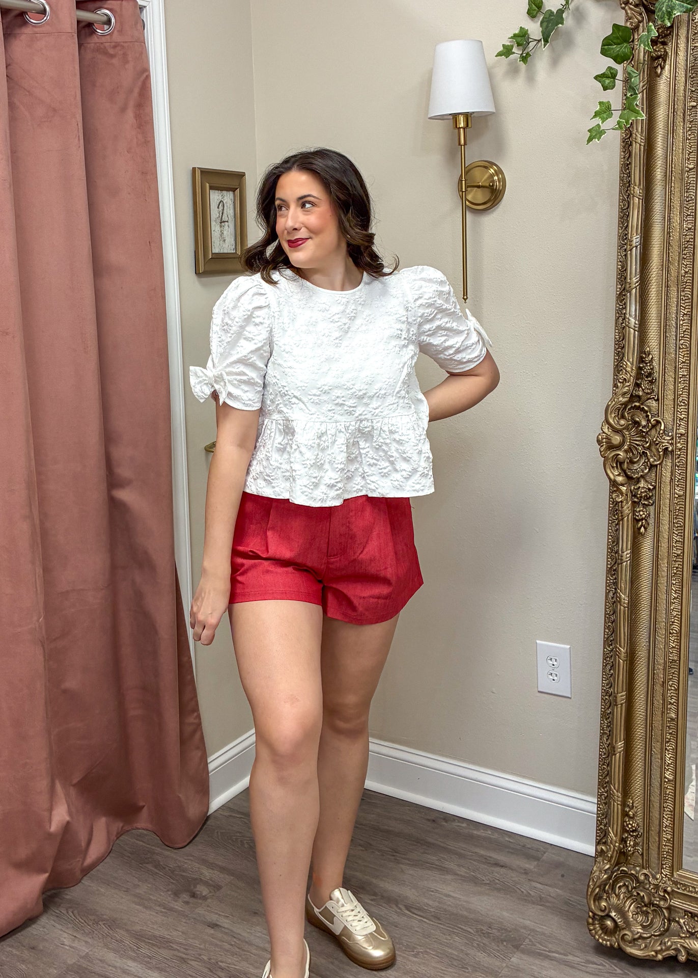 Feminine and flattering, this peplum top features delicate texture and charming bow details at the sleeves for an elevated everyday look. The structured waist and soft peplum hem create a beautiful silhouette that pairs perfectly with denim, shorts, or dressy bottoms.