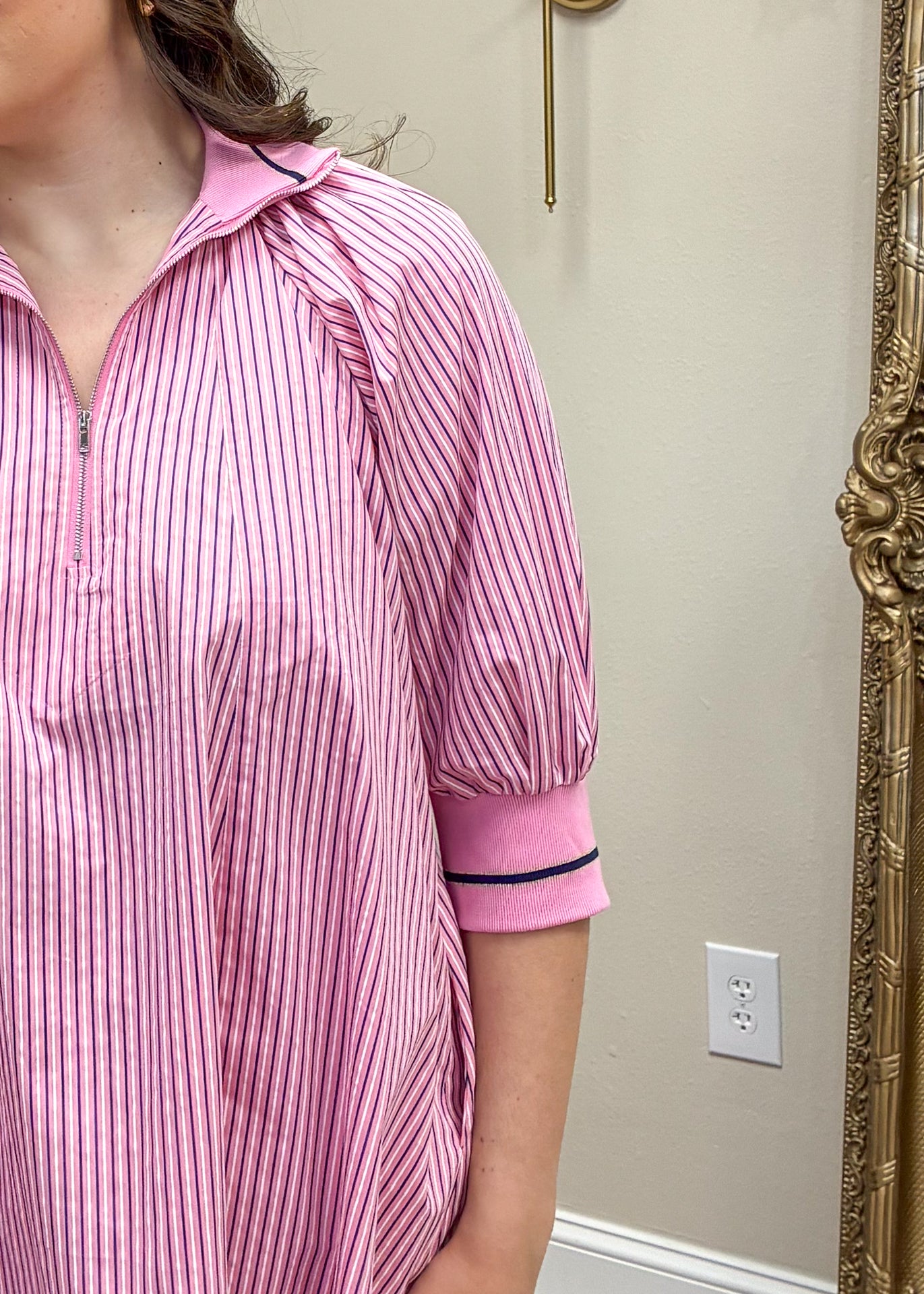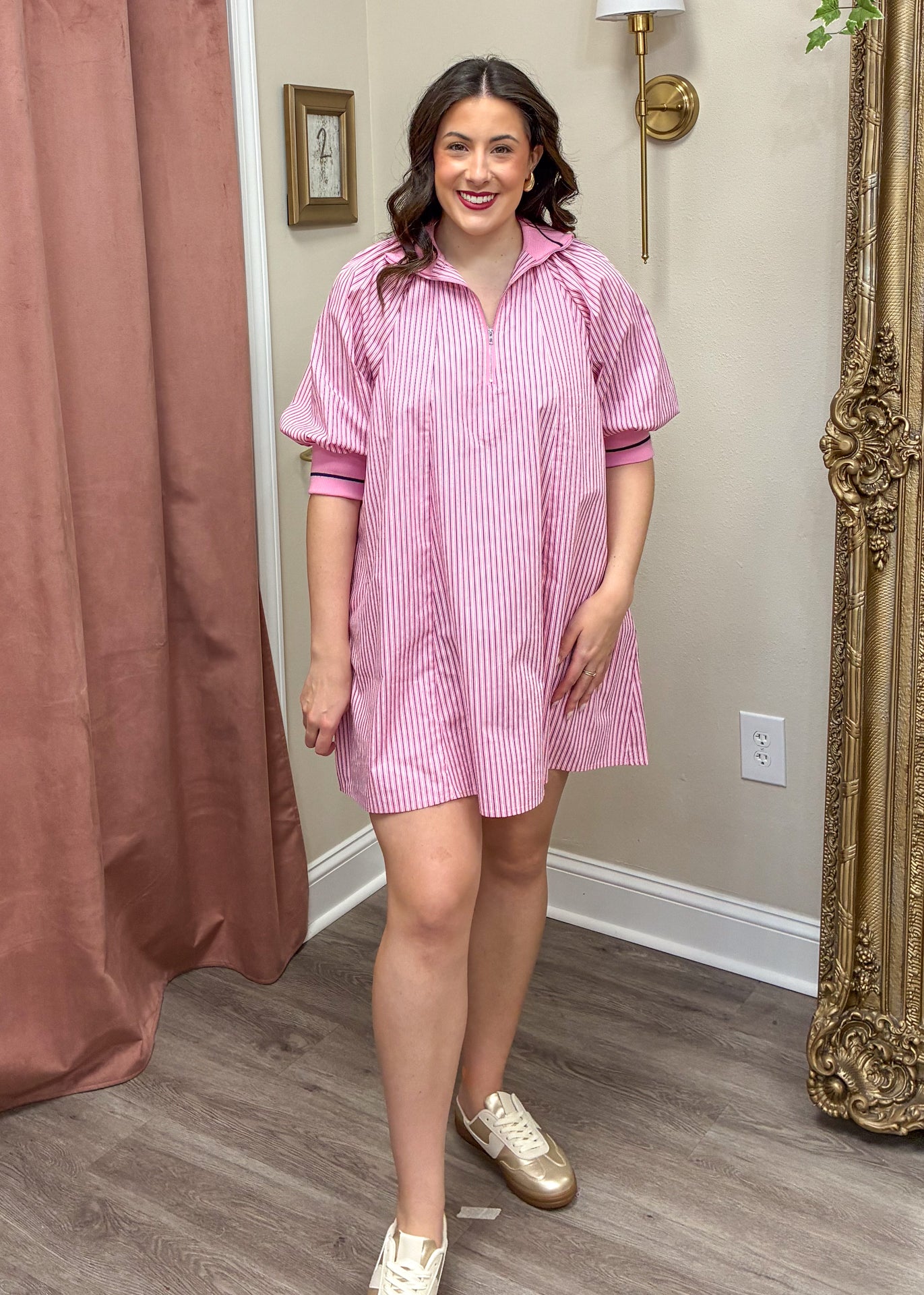 Sporty meets sweet in this pink striped dress designed for effortless everyday wear with a playful twist. Featuring puff sleeves, a zip-front neckline, and a relaxed silhouette, this dress is perfect for busy days, casual outings, or dressing up with accessories.