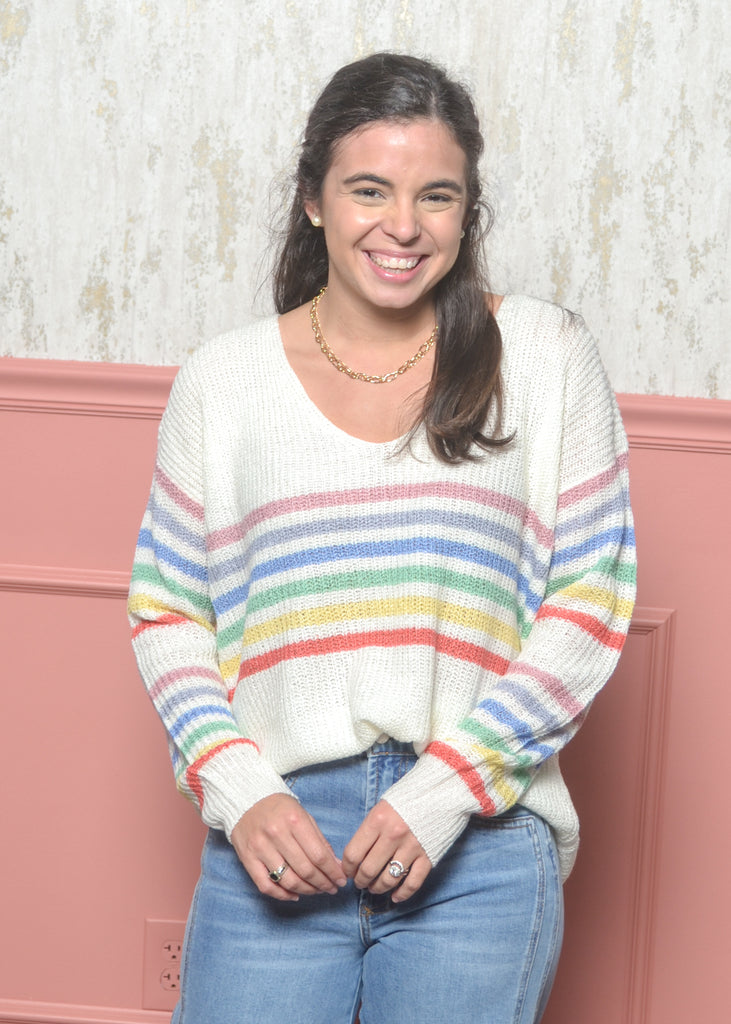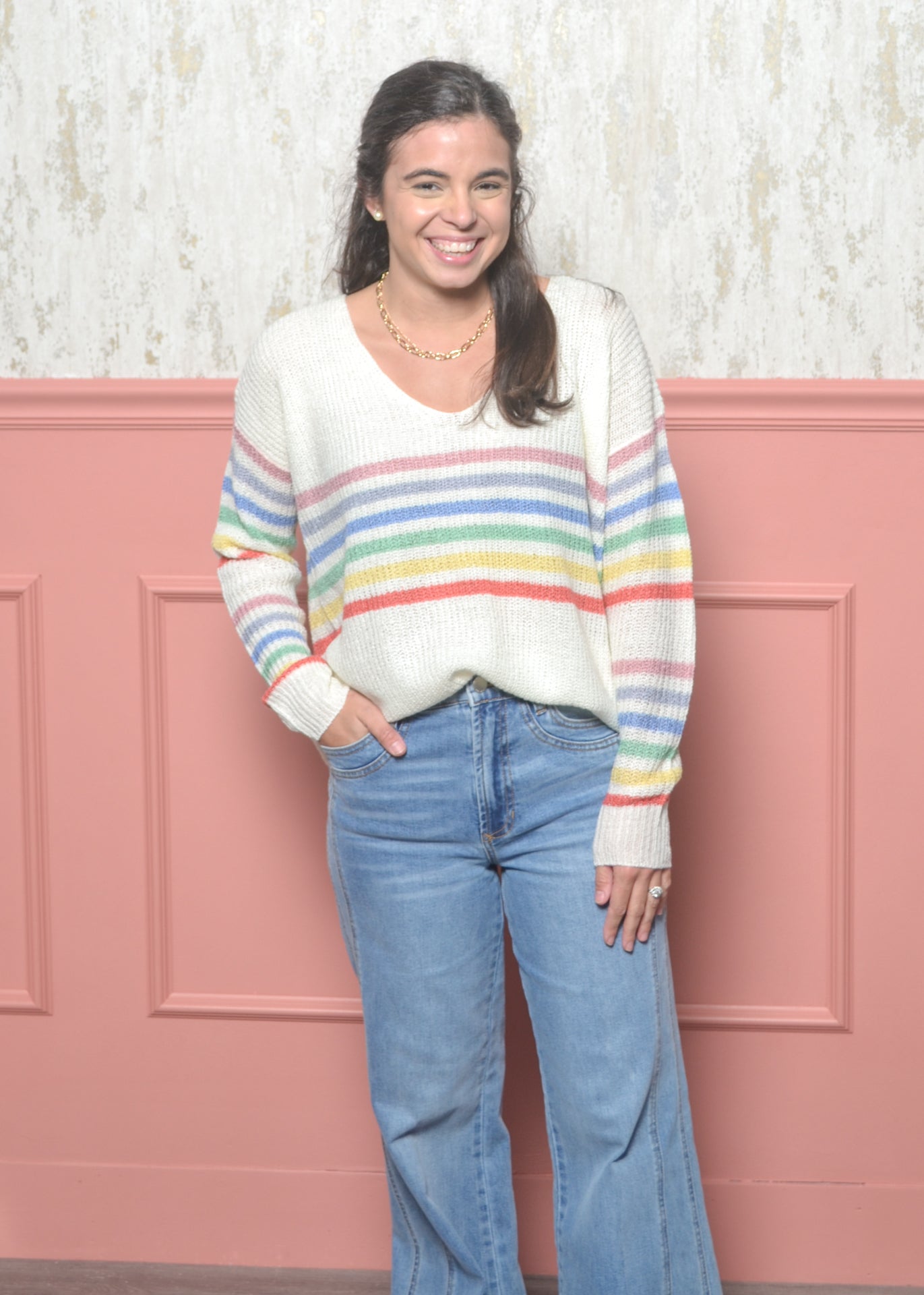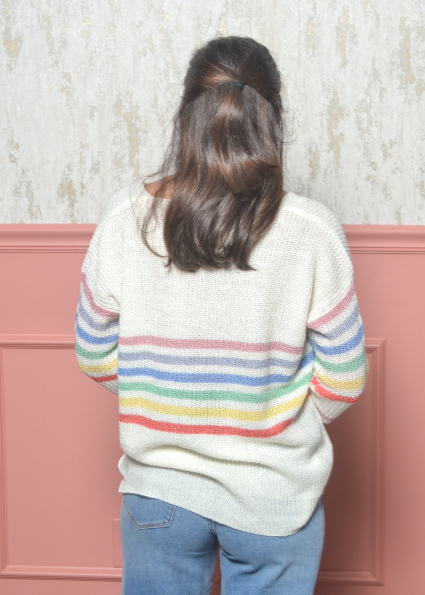 A cozy knit with a playful twist — this rainbow-striped sweater adds a pop of color to even the grayest days.