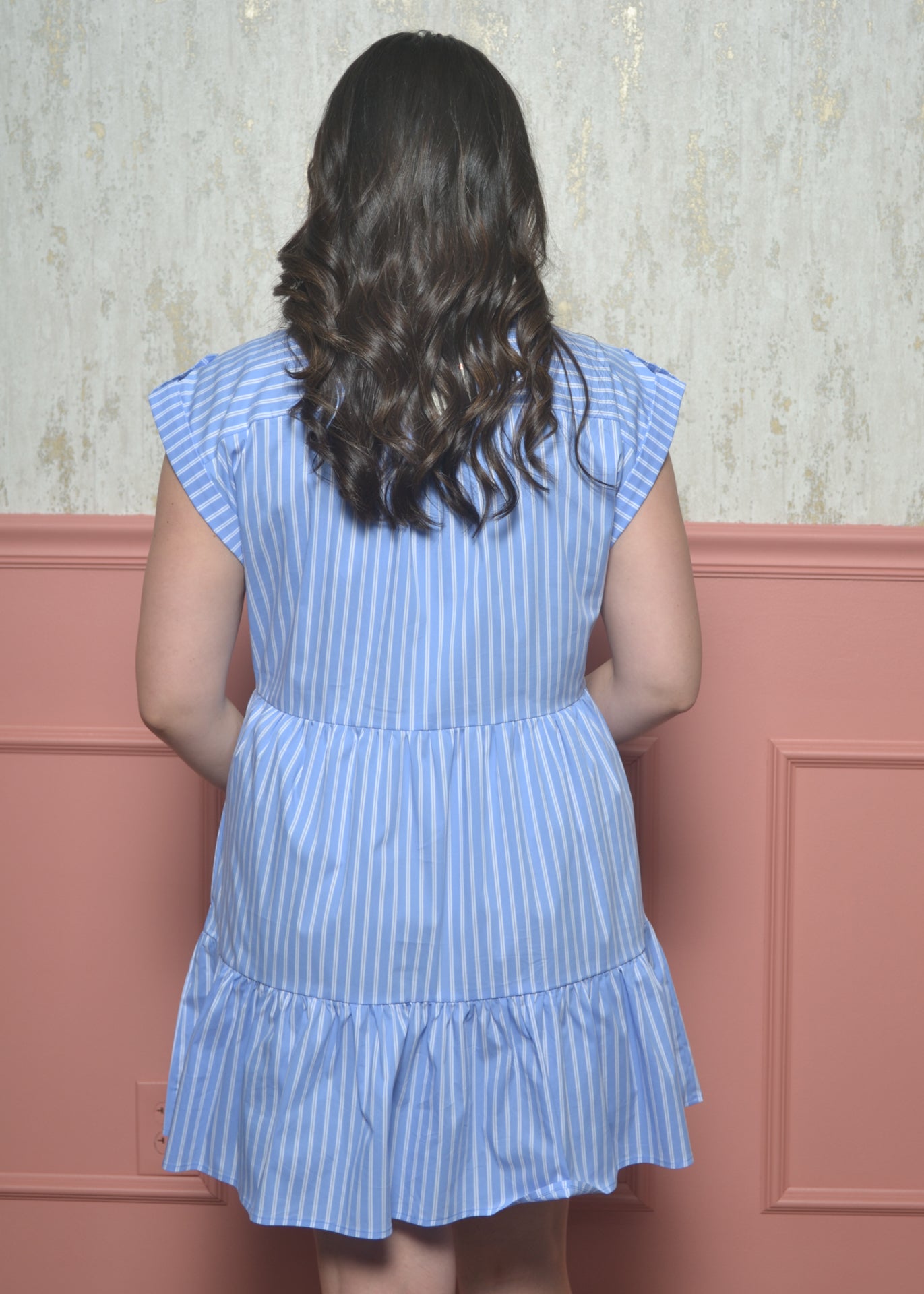 This easy, everyday dress is one you’ll reach for again and again. With its classic blue stripe pattern and relaxed tiered silhouette, it’s the perfect throw-on-and-go piece that still looks polished.