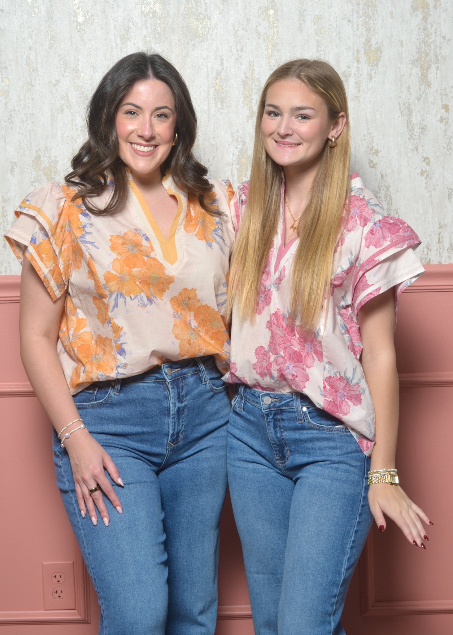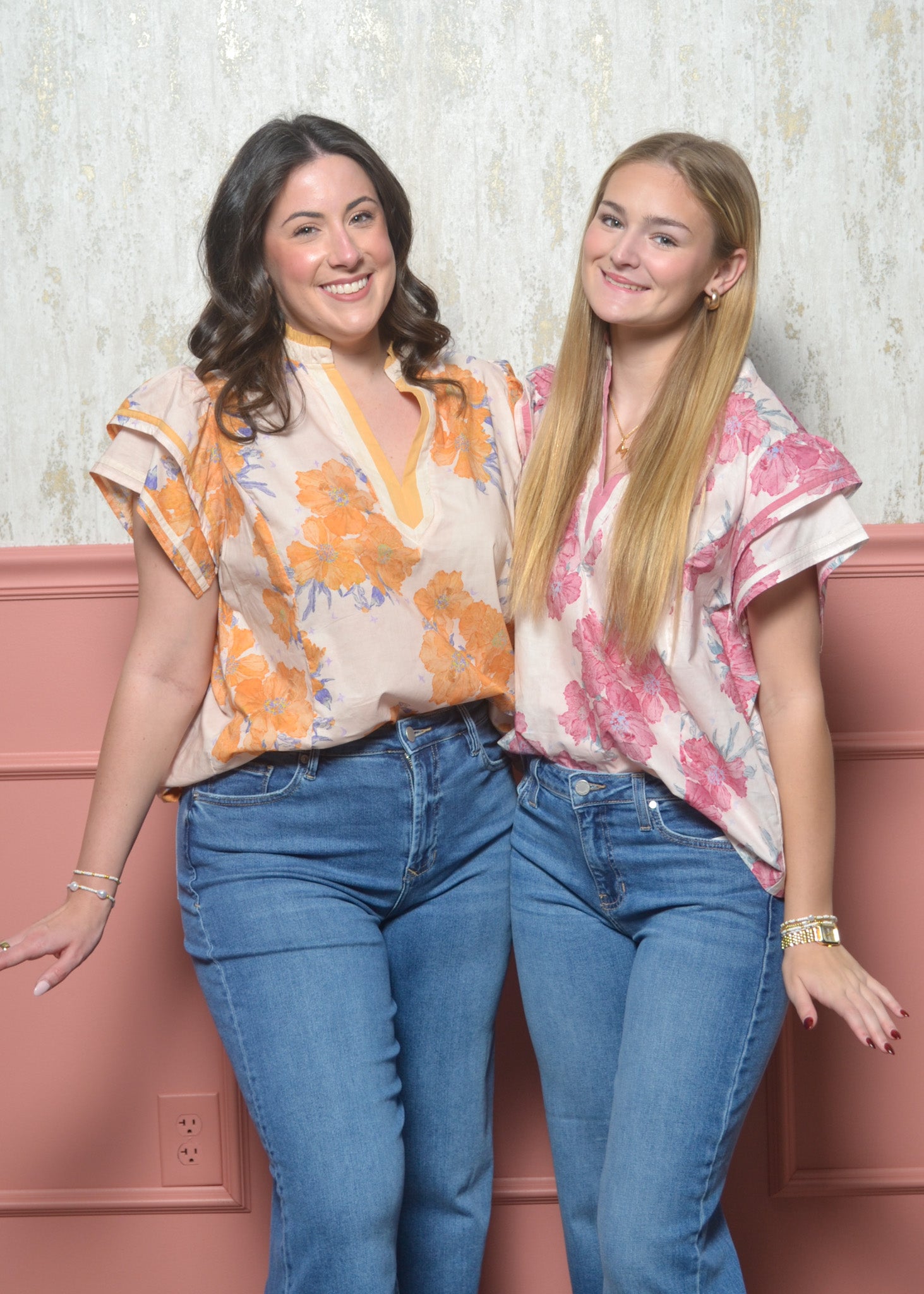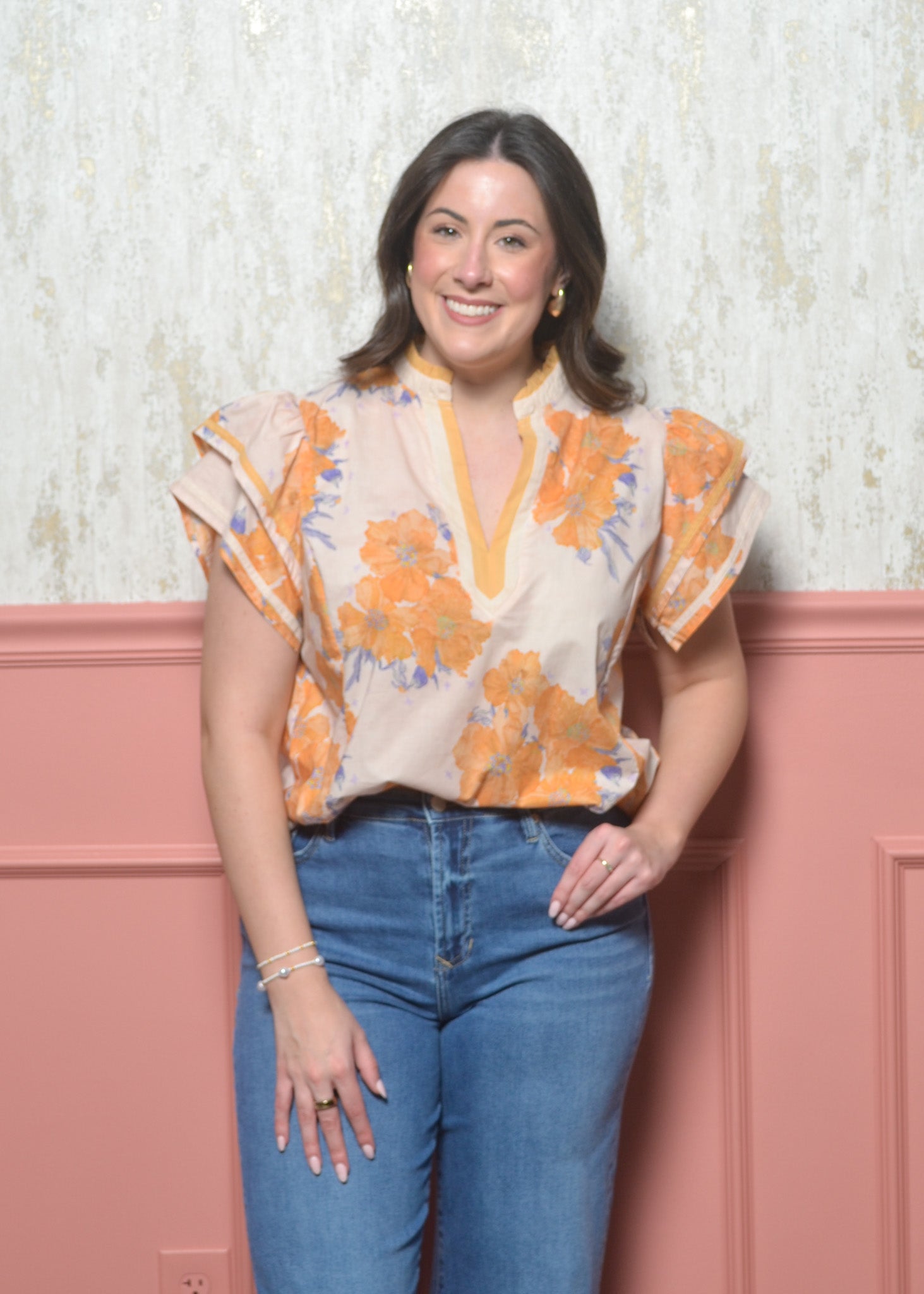 Soft, feminine, and easy to dress up or down, this floral flutter sleeve top brings a fresh pop of color to your everyday wardrobe. Pair it with denim for casual days or tuck it into tailored pants for an elevated look.