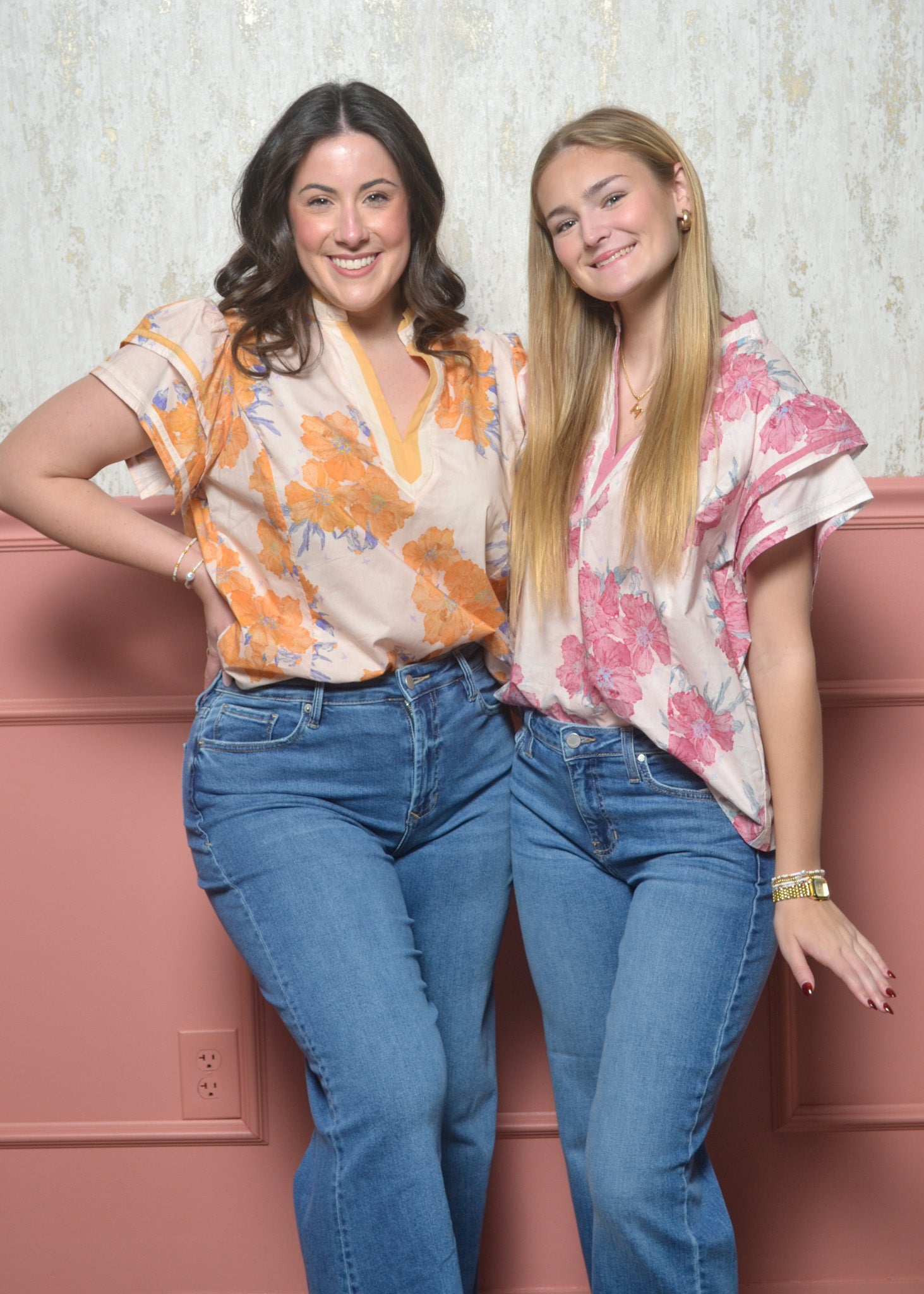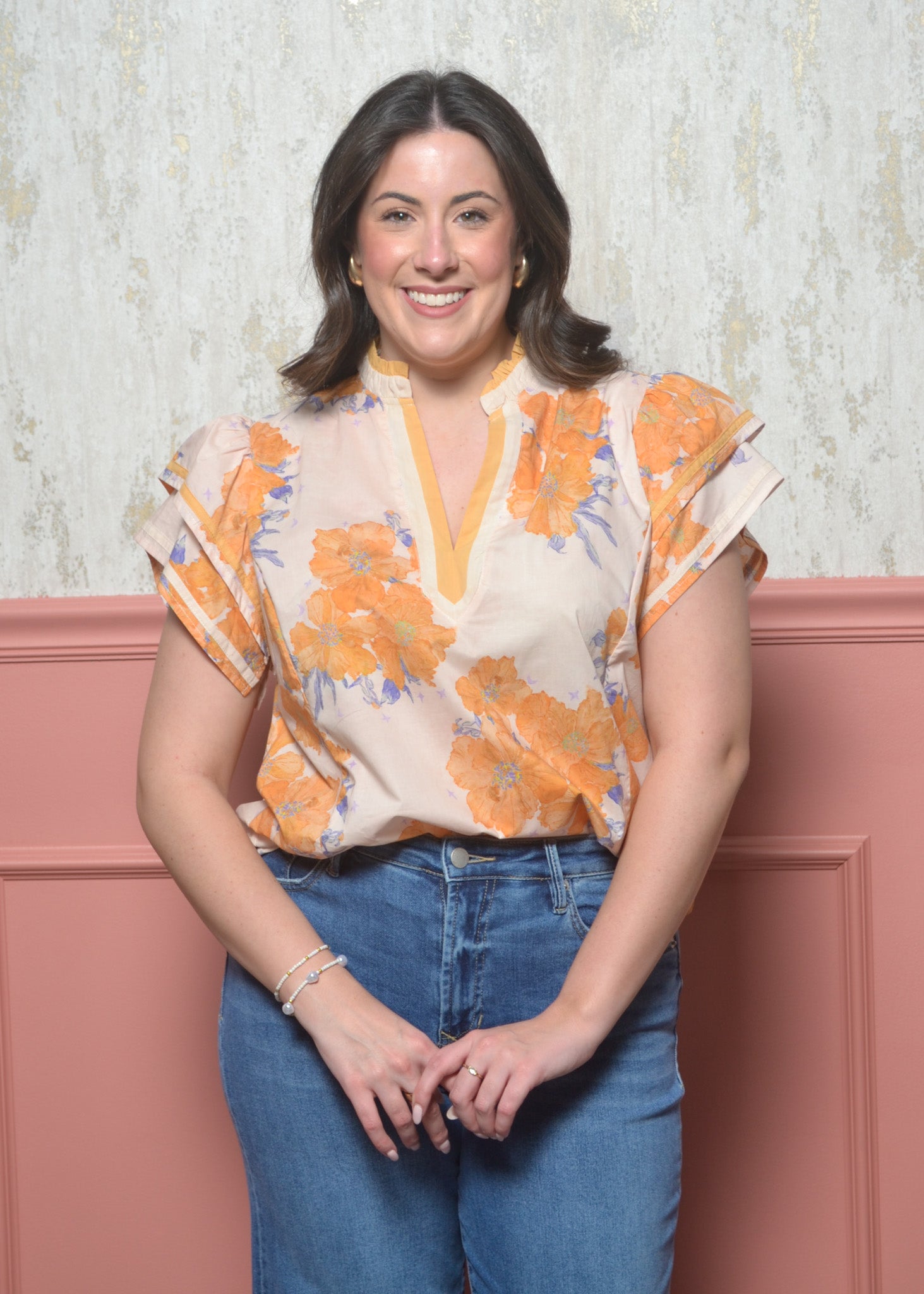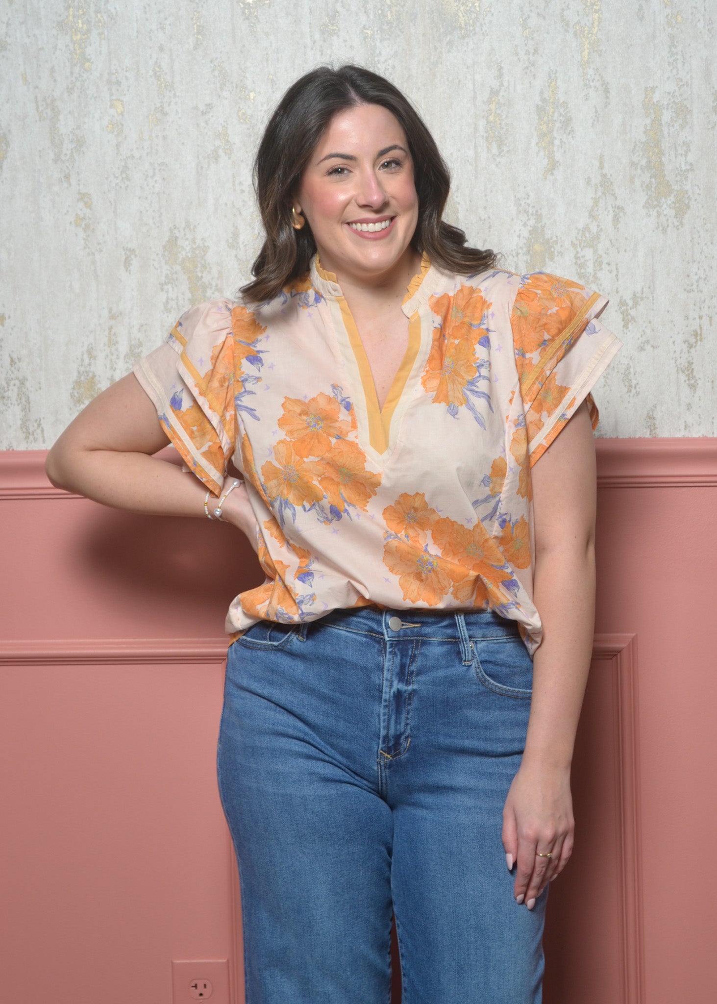 Soft, feminine, and easy to dress up or down, this floral flutter sleeve top brings a fresh pop of color to your everyday wardrobe. Pair it with denim for casual days or tuck it into tailored pants for an elevated look.