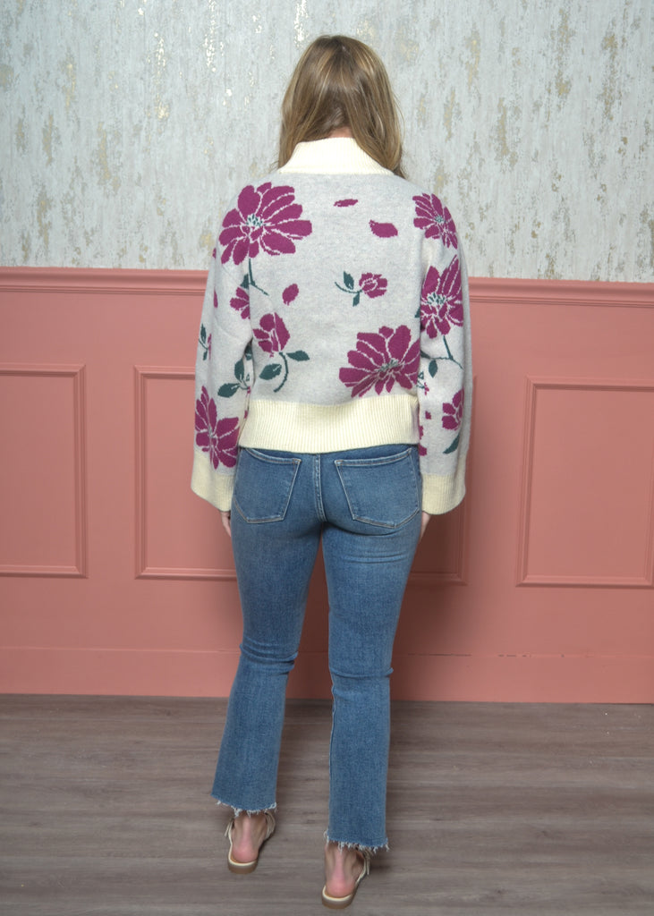 Brighten up chilly days in this stunning floral turtleneck sweater. The oversized blooms and cozy fold-over neckline make it the perfect mix of statement and snug.