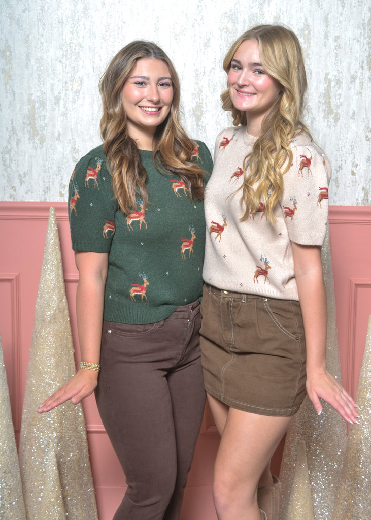 Playful, festive, and cozy — the Reindeer Games Sweater is ready to bring cheer to every holiday moment. This short-sleeve knit features a charming reindeer pattern with a subtle touch of sparkle and classic Christmas colors. Perfect for holiday parties, casual days, or coordinating with your bestie in both colorways!