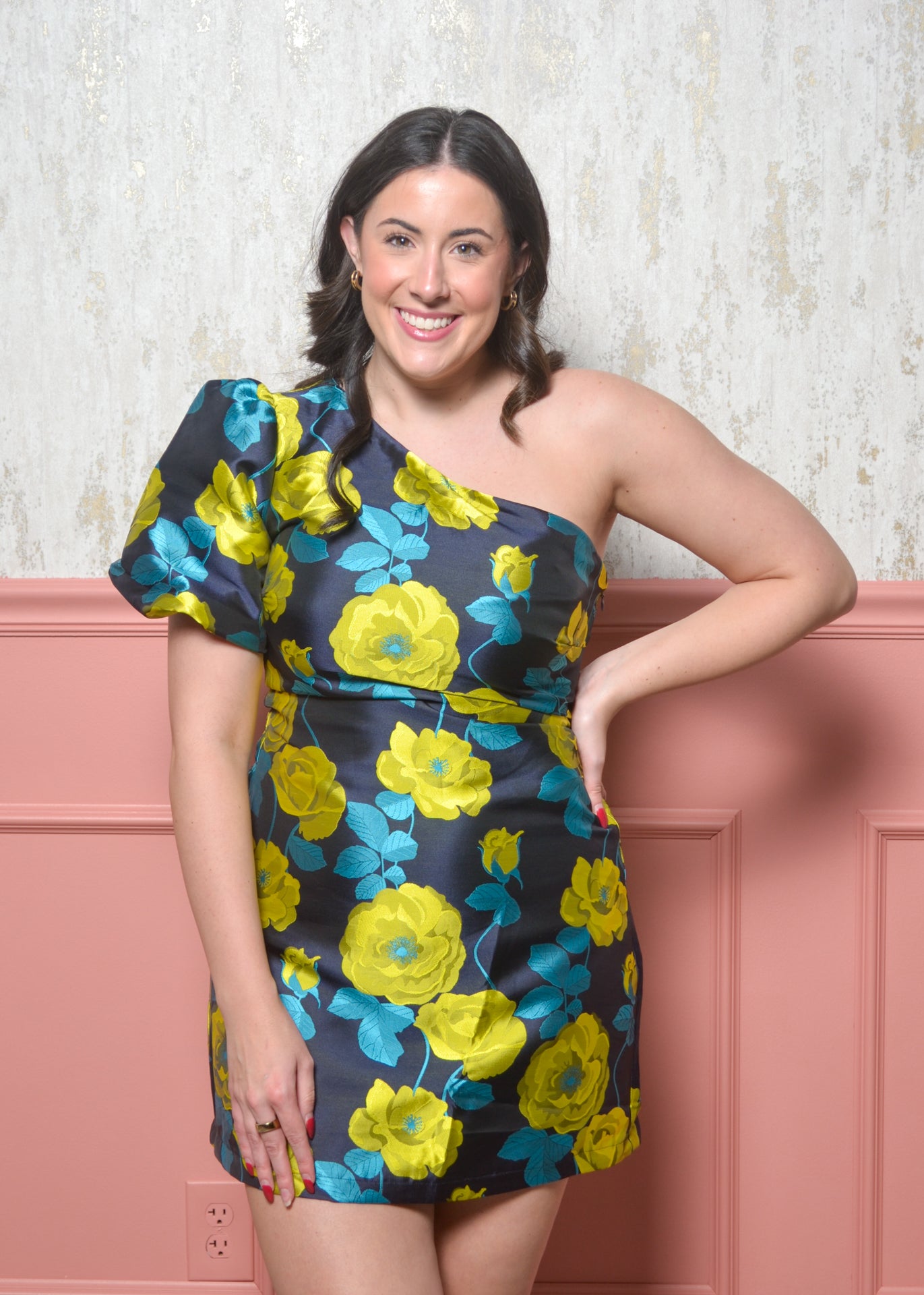 Playful and bold, this floral one-shoulder mini is the perfect mix of confidence and color. The striking yellow and teal pattern brings fresh energy to your wardrobe — ideal for spring events or statement-making nights out.