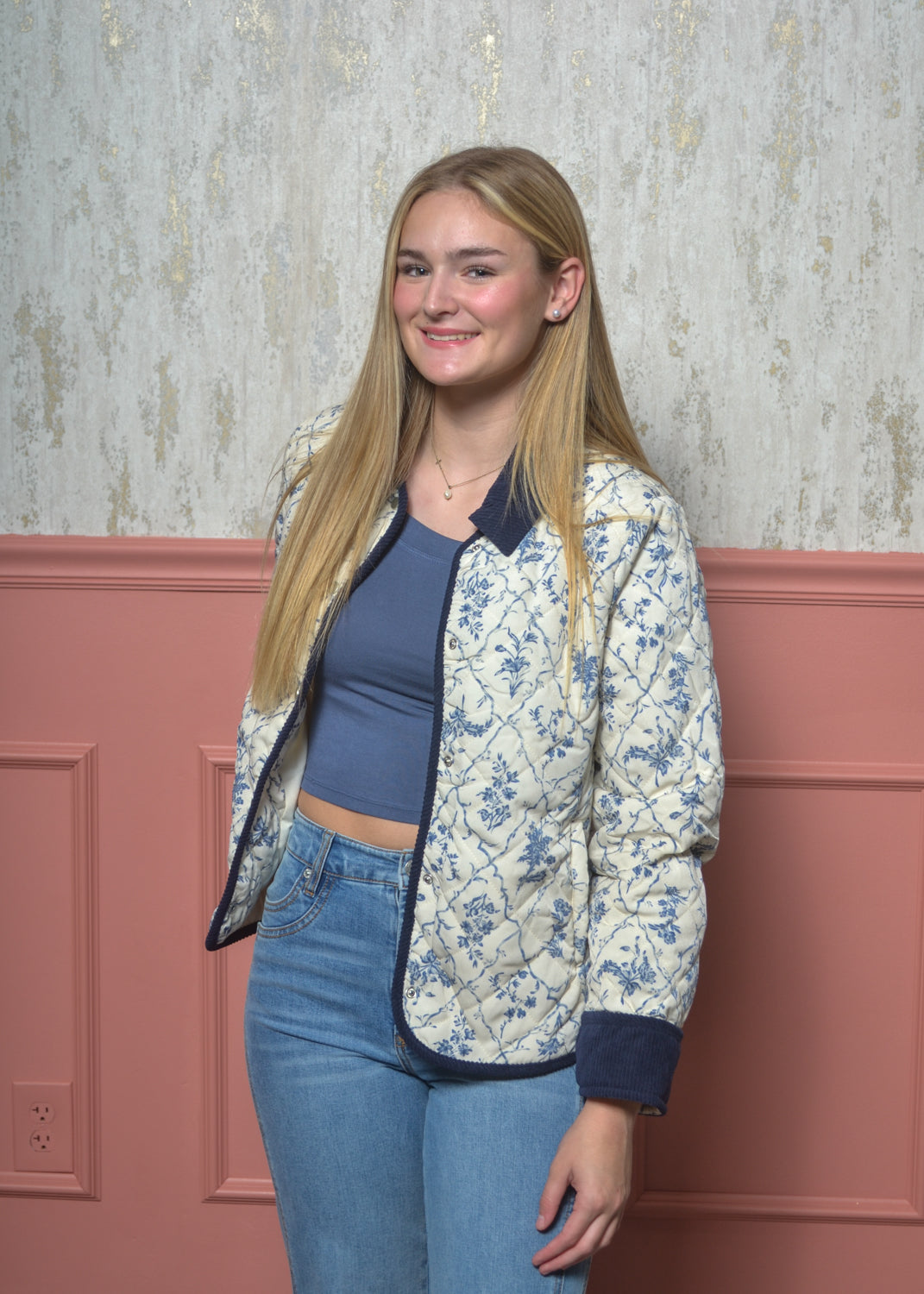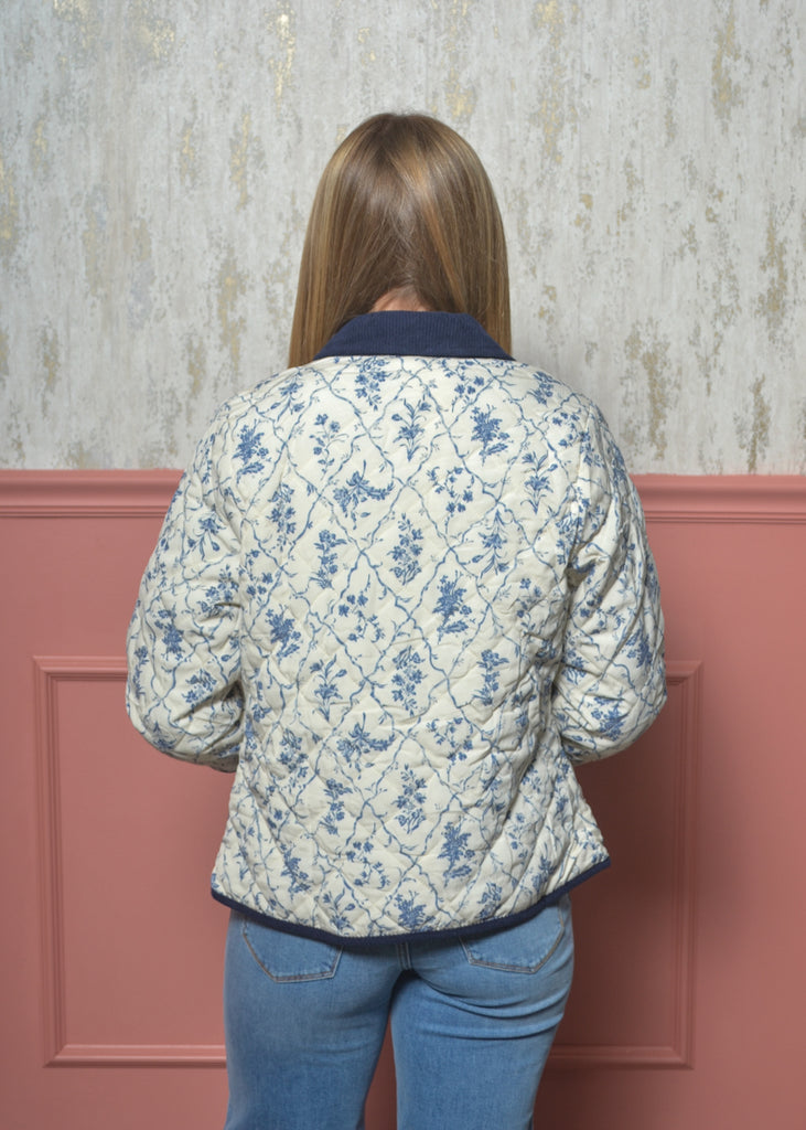 Classic and cozy, this quilted floral jacket is giving cottage-core perfection. The blue-and-cream color combo makes it an elegant layering piece for chilly mornings or evening strolls.