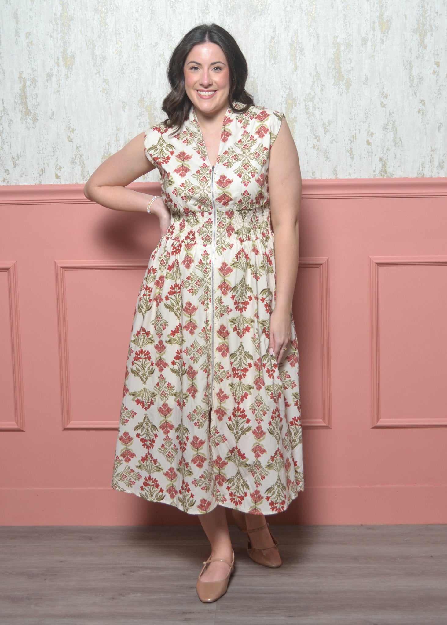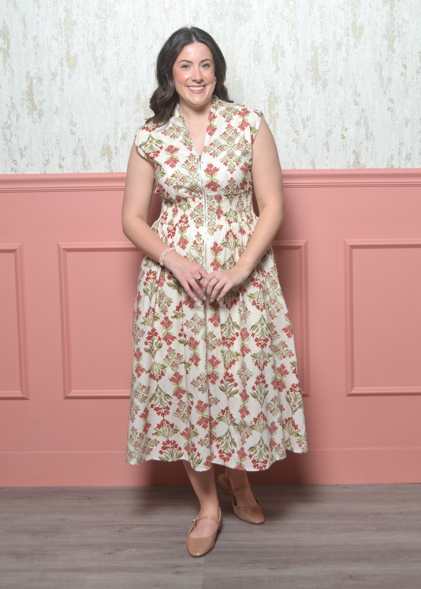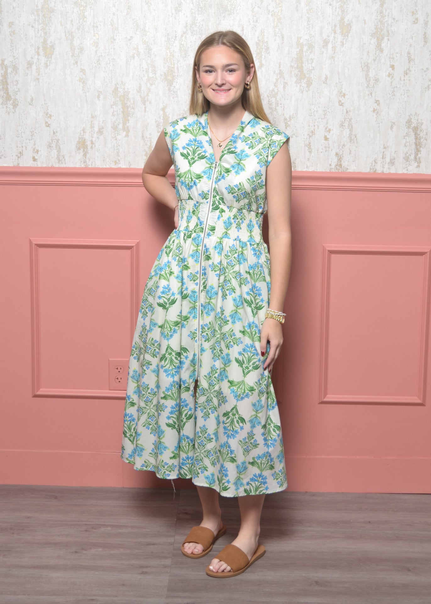 Float through spring days in this effortlessly charming floral maxi. With a flattering smocked waist and functional front zipper, this dress blends comfort, femininity, and easy everyday wear.