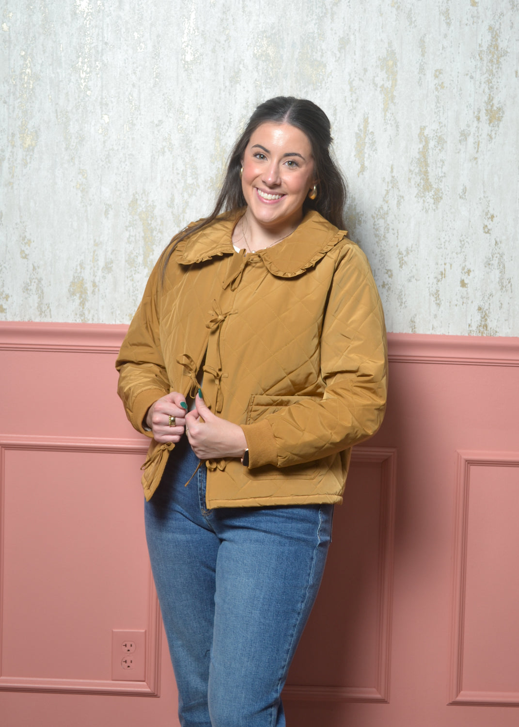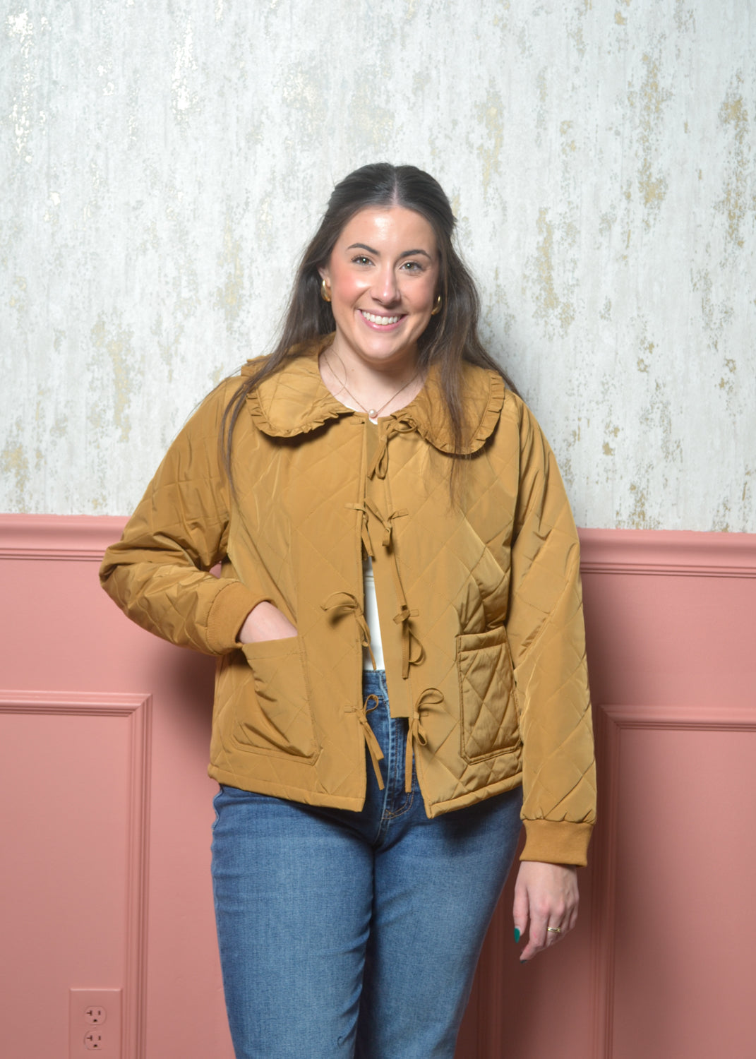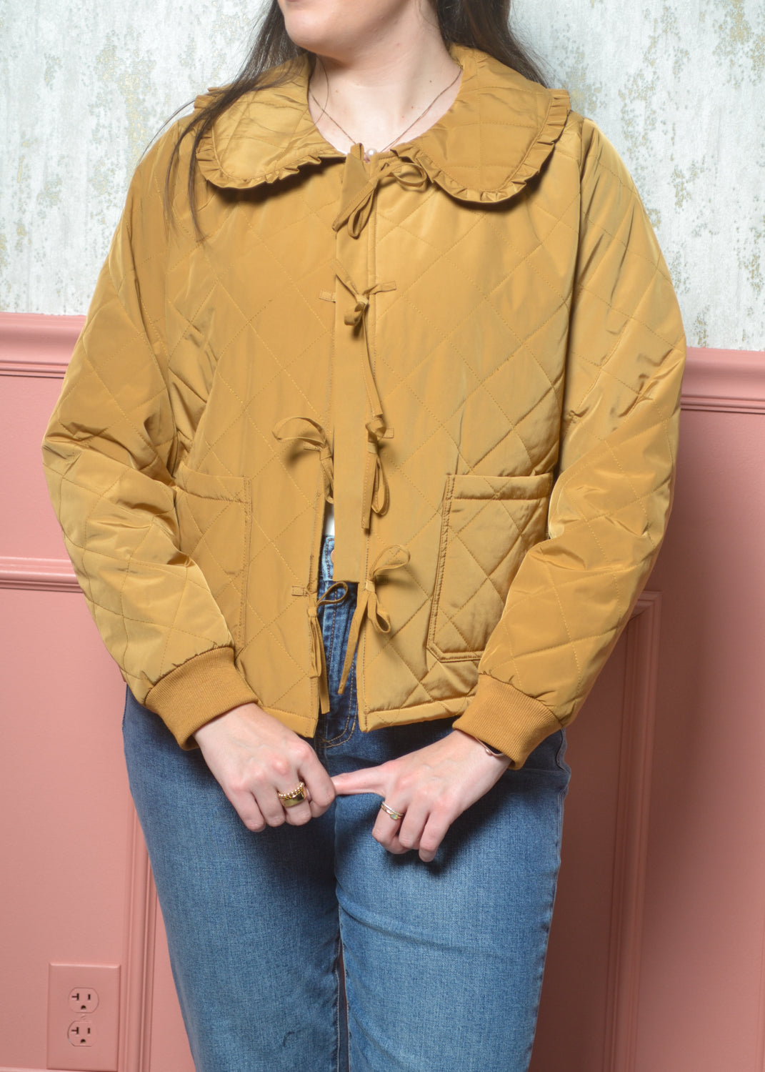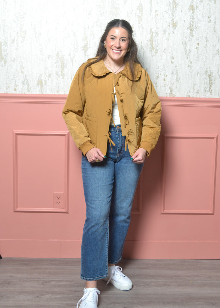The Honeycomb Bow-Trim Jacket is the perfect blend of cozy quilted warmth and feminine charm. Designed in a rich honey-mustard tone, this jacket features a sweet ruffle-trimmed collar, bow-tie closures, and a soft padded feel that keeps you warm without feeling bulky. It’s the kind of piece that instantly elevates your everyday denim or adds a playful touch over dresses and basics. If you love a jacket that’s practical but still has personality, this one’s a standout.