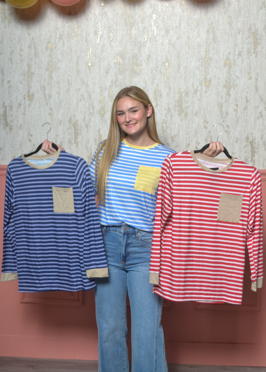 The Playful Pocket Stripe Sweater brings a fun, fresh twist to classic stripes. Each colorway features bright, contrasting cuffs and a standout front pocket that adds just the right amount of personality. The lightweight knit makes it easy to layer or wear on its own, and the relaxed fit keeps it comfy for everyday outfits. Whether you go with bold blue, soft navy, or vibrant red, these sweaters instantly brighten your closet.