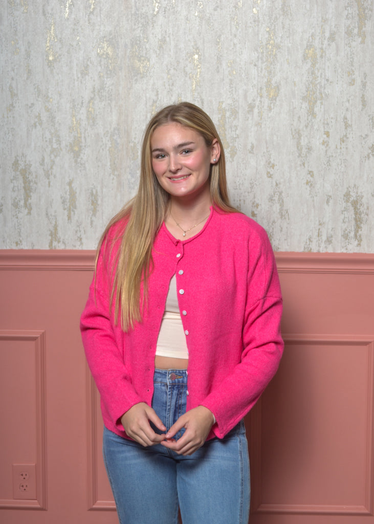 Brighten your wardrobe with a pop of color in The Think Pink Cardigan! This bold and cozy knit brings a fun twist to classic layering, perfect for adding personality to any outfit. Whether buttoned up or worn open over a tank, it’s your go-to piece for effortless style and comfort.